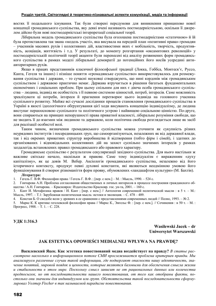 Розділ третій. Світоглядні й теоретико-пізнавальні аспекти комунікації, медіа та інформації востях її подальшого існування. Так були створені передумови для виникнення принципово нової концепції громадянського суспільства, яку деякі вчені називають постмодерністською, оскільки її джерелом дійсно були нові постмодерністські інтерпретації соціальної теорії. Ліберальна модель громадянського суспільства була оголошена постмодерністами «статичною» й їй була протиставлена так звана «модель участі», яка висувала на передній план «позитивні права» громадян – учасників масових рухів і колективних дій, властивостями яких є мобільність, творчість, продуктивність, асоціація, життєвість і т.д. У результаті, до моменту розгортання «оксамитових революцій» у постмодерністській політичній теорії акценти були перенесені від аналізу розвинених форм громадянського суспільства в рамках моделі ліберальної демократії до потенційних його носіїв усередині антиавторитарних рухів. Якщо в працях представників класичної філософської традиції (Локка, Гоббса, Монтеск’є, Руссо, Канта, Гегеля та інших) і пізніше поняття «громадянське суспільство» використовувалось для розмежування суспільства і держави, – то сучасні науковці стверджують, що нині кордонів між громадянським суспільством і державою практично немає. Держава втручається в рішення багатьох фундаментальних економічних і соціальних проблем. При цьому спільним для них є діюча особа громадянського суспільства – людина, індивід як особистість з її певною системою цінностей, потреб, інтересів. Саме можливість зреалізувати ці потреби, інтереси й прагнення перетворює цього індивіда на головного учасника суспільного розвитку. Майже всі сучасні дослідники процесів становлення громадянського суспільства в Україні в якості ідеологічного обґрунтування цієї ходи висувають концепцію індивідуалізму, де людина виступає першоосновою суспільного та політичного устрою і найвищою соціальною цінністю. По-друге, вони спираються на принцип непорушності права приватної власності, ліберальне розуміння свободи, що не зводить її до взаємин між людиною та державою, коли політична свобода розглядається лише як засіб для реалізації особистої волі. Таким чином, визначення громадянського суспільства можна уточнити як сукупність різних неурядових інститутів і посередницьких груп, що самоорганізуються, незалежних як від державної влади, так і від окремих приватних структур виробництва й відтворення (тобто фірм і сімей), і здатних до організованих і відповідальних колективних дій на захист суспільно значимих інтересів у рамках заздалегідь встановлених правил громадянського або правового характеру. Громадянське суспільство є результатом секуляризації західного суспільства. Для нього настільки ж важливе світське начало, наскільки ж правове. Саме тому індивідуалізм є вираженням «духу капіталізму», як це довів М. Вебер. Аксіологія громадянського суспільства, незалежно від його історичного контексту, продукує певні духовні константи, які являються неодмінною умовою його функціонування й створює різноманіття форм прояву, обумовлених «ландшафтом культури» (М. Бахтін). Література: 1. Гегель Г. В.Ф. Философия права / Гегель Г. В.Ф. ; [пер. с нем.] – М. : Мысль, 1990. – 524 с. 2. Гончарова А.Н. Проблема со