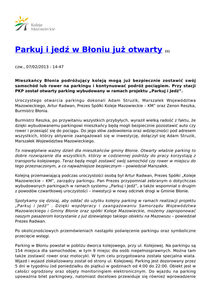 Parkuj i jedź w Błoniu już otwarty [1] czw., 07/02/2013 - 14:47 Mieszkańcy Błonia podróżujący koleją mogą już bezpiecznie zostawić swój samochód lub rower na parkingu i kontynuować podróż pociągiem. Przy stacji PKP został otwarty parking wybudowany w ramach projektu „Parkuj i Jedź”. Uroczystego otwarcia parkingu dokonali Adam Struzik, Marszałek Województwa Mazowieckiego, Artur Radwan, Prezes Spółki Koleje Mazowieckie – KM” oraz Zenon Reszka, Burmistrz Błonia. Burmistrz Reszka, po przywitaniu wszystkich przybyłych, wyraził wielką radość z faktu, że dzięki wybudowanemu parkingowi mieszkańcy będą mogli bezpiecznie pozostawić auto czy rower i przesiąść się do pociągu. Do jego słów zadowolenia oraz wdzięczności pod adresem wszystkich, którzy aktywnie zaangażowali się w inwestycję, dołączył się Adam Struzik, Marszałek Województwa Mazowieckiego. To niewątpliwie ważny dzień dla mieszkańców gminy Błonie. Otwarty właśnie parking to dobre rozwiązanie dla wszystkich, którzy w codziennej podróży do pracy korzystają z transportu kolejowego. Teraz będą mogli zostawić swój samochód czy rower w miejscu do tego przeznaczonym, a co najważniejsze bezpiecznym – powiedział Marszałek. Kolejną przemawiającą podczas uroczystości osobą był Artur Radwan, Prezes Spółki „Koleje Mazowieckie – KM”, zarządcy parkingu. Pan Prezes przypomniał zebranym o dotychczas wybudowanych parkingach w ramach systemu „Parkuj i Jedź”, a także wspomniał o drugim z powodów czwartkowej uroczystości – inwestycji w nowy odcinek drogi w Gminie Błonie. Spotykamy się dzisiaj, aby oddać do użytku kolejny parking w ramach realizacji projektu „Parkuj i Jedź” . Dzięki współpracy i zaangażowaniu Samorządu Województwa Mazowieckiego i Gminy Błonie oraz spółki Koleje Mazowieckie, możemy zaproponować naszym pasażerom korzystanie z już dziewiątego takiego obiektu na Mazowszu – powiedział Prezes Radwan. Po okolicznościowych przemówieniach nastąpiło poświęcenie parkingu oraz symboliczne przecięcie wstęgi. Parking w Błoniu powstał w pobliżu dworca kolejowego, przy ul. Kolejowej. Na parkingu są 154 miejsca dla samochodów, w tym 9 miejsc dla osób niepełnosprawnych. Można tam także zostawić rower oraz motocykl. W tym celu przygotowana została specjalna wiata. Wjazd i wyjazd zlokalizowany został od strony ul. Kolejowej. Parking jest dozorowany przez 5 dni w tygodniu (od poniedziałku do piątku) w godzinach od 4:00 do 22:00. Obiekt jest w całości ogrodzony oraz objęty monitoringiem elektronicznym. Do wjazdu na parking upoważnia bilet parkingowy, natomiast docelowo przewiduje się również wprowadzenie abonamentowej karty zbliżeniowej. Parking jest oświetlony, a także w pełni skanalizowany. Użytkownicy mają do dyspozycji nowoczesną toaletę z zamkniętym obiegiem oraz dostęp do wody bieżącej. W ramach systemu „Parkuj i Jedź” na Mazowszu funkcjonuje już 8 parkingów w: Żyrardowie, Celestynowie, Siedlcach, Ożarowie Mazowieckim, Brwinowie, Teresinie, Radomiu oraz Mińsku Mazowieckim. Korzystający z parkingów płacą za pozostawienie samochodu lub motocykla kwartalnie 40 zł. Bilety miesięczne kosztują 20 zł, a bilet jednorazowy – 3 zł. Natomiast pozostawienie roweru kosztuje kwartalnie 10 zł, miesięcznie 5 zł, a za jednorazowy wjazd trzeba zapłacić 2 zł. System „Parkuj i Jedź” stanowi integralną część kolejowego transportu pasażerskiego. Oferta skierowana jest do tych pasażerów Kolei Mazowieckich, a także innych przewoźników, którzy mieszkają w pewnym oddaleniu od stacji kolejowej, ale nie chcą rezygnować z wygodnego, ekologicznego i szybkiego transportu, jakim jest kolej. Nowo otwarty parking w Błoniu nie był jednak jedynym powodem czwartkowego spotkania. Dzięki przyznanej, decyzją zarządu województwa mazowieckiego, dotacji gmina Błonie wzbogaciła się o prawie 12 km dróg. W ramach projektu współfinansowanego ze środków unijnych (z Regionalnego Programu Operacyjnego Województwa Mazowieckiego 2007-13) od podstaw przebudowano istniejące, słabej jakości drogi gminne. Wykonano solidną podbudowę, odwodnienia, chodniki. Powstały ciąg drogowy biegnący od miejscowości Bieniewice, przez Pass (gdzie przebudowano 2 mosty), Wawrzyszew, Białuty, Radzików do wsi Białutki i Witki łączy południową i północną część gminy. Koszt budowy prawie 12 km dróg wyniósł blisko 20 mln zł, z czego dofinansowanie unijne to 11,7 mln zł. Zdjęcia: [2] [3] [4] [5] [6] Kategoria: Konferencje, seminaria, inne wydarzenia [7] © „Koleje Mazowieckie - KM” sp. z o.o. Odnośniki [1] http://www.mazowieckie.com.pl/pl/parkuj-i-jed-w-b-oniu-ju-otwarty [2] http://www.mazowieckie.com.pl/sites/default/files/2013_02/cec5e6edc35fa5db0ffaf9fb1e2a0251.jpg [3] http://www.mazowieckie.com.pl/sites/default/files/2013_02/9c55664f25c00cf9548907daf43c40e3.jpg [4] http://www.mazowieckie.com.pl/sites/default/files/2013_02/cc1adf7bb87620e5693d55fbc24c8a7b.jpg [5] http://www.mazowieckie.com.pl/sites/default/files/2013_02/3fa6140e137b57f32e1020aa71a9cb7f.jpg [6] http://www.mazowieckie.com.pl/sites/default/files/2013_02/422080bee604709072d6c232965f8ffe.jpg [7] http://www.mazowieckie.com.pl/pl/kategoria/konferencje-seminaria-inne-wydarzenia