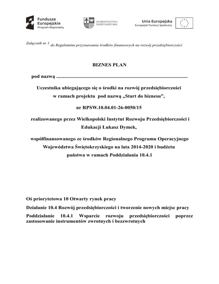 Załącznik nr 1 do Regulaminu przyznawania środków finansowych na rozwój przedsiębiorczości BIZNES PLAN pod nazwą ...................................................................................................... Uczestnika ubiegającego się o środki na rozwój przedsiębiorczości w ramach projektu pod nazwą „Start do biznesu”, nr RPSW.10.04.01-26-0050/15 realizowanego przez Wielkopolski Instytut Rozwoju Przedsiębiorczości i Edukacji Łukasz Dymek, współfinansowanego ze środków Regionalnego Programu Operacyjnego Województwa Świętokrzyskiego na lata 2014-2020 i budżetu państwa w ramach Poddziałania 10.4.1 Oś priorytetowa 10 Otwarty rynek pracy Działanie 10.4 Rozwój przedsiębiorczości i tworzenie nowych miejsc pracy Poddziałanie 10.4.1 Wsparcie rozwoju przedsiębiorczości zastosowanie instrumentów zwrotnych i bezzwrotnych poprzez SPIS TREŚCI 1. DANE WNIOSKODAWCY.............................................................................................3 1.1 PODSTAWOWE DANE.......................................................................................................3 1.2 DODSTAWOWE INFORMACJE........................................................................................3 2. SKRÓCONY OPIS PRZEDSIĘWZIĘCIA....................................................................3 2.1 RODZAJ PROPONOWANEJ DZIAŁALNOŚCI................................................................3 2.2 SKRÓCONE DANE DOTYCZĄCE PROPONOWANEJ INICJATYWY..........................4 3. PROJEKT PRZEDSIĘWZIĘCIA...................................................................................4 3.1 PRZEDSTAWIENIE PROJEKTU........................................................................................4 3.2 OFERTA................................................................................................................................5 3.3 RYNEK.................................................................................................................................5 3.4 KONKURENCJA.................................................................................................................5 3.5 CENA....................................................................................................................................6 3.6 SPRZEDAŻ I PRZYCHÓD..................................................................................................6 3.7 PROCES PRODUKCJI/DOSTARCZANIA.........................................................................7 3.8 ZAGROŻENIA I MOŻLIWOŚCI........................................................................................7 4. PLAN INWESTYCYJNY....................................................................................................7 4.1 UZASADNIENIE INWESTYCJI.........................................................................................7 4.2 CHARAKTERYSTYKA INWESTYCJI..............................................................................7 4.3 ZAKRES INWESTYCJI.......................................................................................................8 4.4 ZASOBY LUDZKIE.............................................................................................................8 4.5 LOKALIZACJA I ZAPLECZE TECHNICZNE..................................................................8 5. PLAN EKONOMICZNO-FINANSOWY...........................................................................9 5.1 KALKULACJA KOSZTÓW PODJĘCIA DZIAŁALNOŚCI..............................................9 5.2 ŹRÓDŁA POKRYCIA WYDATKÓW...............................................................................10 5.3 PROGNOZA EKONOMICZNA PRZEDSIĘWZIĘCIA....................................................10 DANE WNIOSKODAWCY 1.1 PODSTAWOWE DANE Nazwisko i imiona PESEL, miejsce urodzenia NIP Adres zamieszkania Telefon E-mail 1.2 PODSTAWOWE INFORMACJE W tym miejscu należy opisać zdobyte wykształcenie, ewentualne odbyte kursy szkoleniowe i doskonalące, dotychczasowe doświadczenie zawodowe i wszelkie dodatkowe posiadane umiejętności oraz, jeśli to możliwe, wskazać i ocenić ich wagę i znaczenie w stosunku do zaproponowanego w niniejszym biznes planie przedsięwzięcia. Wykształcenie Kursy i szkolenia Doświadczenie zawodowe Dodatkowe umiejętności Stan przygotowań do podjęcia działalności gospodarczej 2. SKRÓCONY OPIS PRZEDSIĘWZIĘCIA 2.1 RODZAJ PROPONOWANEJ DZIAŁALNOŚCI Należy zaznaczyć tylko jeden, przeważający typ działalności prowadzonej w ramach proponowanego przedsięwzięcia. HANDLOWA USŁUGOWA PRODUKCYJNA 2.2 SKRÓCONE DANE DOTYCZĄCE PROPONOWANEJ INICJATYWY Przedmiot inicjatywy (maksymalnie 200 znaków) Przedmiot i zakres planowanej działalności (według PKD lub EKD wraz z opisem) Lokalizacja przedsięwzięcia Powiat Gmina Obszar wiejski/miejski Czy wnioskodawca prowadził działalność gospodarczą? Jeśli tak, to kiedy i jaką, i czy korzystał z pomocy publicznej? Całkowity koszt przedsięwzięcia Kwota netto VAT Kwota brutto Wnioskowana kwota dotacji na rozpoczęcie działalności gospodarczej Źródła finansowania poza dotacją 3. PROJEKT PRZEDSIĘWZIĘCIA 3.1 PRZEDSTAWIENIE PROJEKTU Należy jak najdokładniej opisać działalność będącą przedmiotem inicjatywy, przyczyny, które skłoniły wnioskodawcę do takiego a nie innego wyboru oraz aspekty najlepiej charakteryzujące dany rynek. Poniższy opis powinien zawierać również określenie wielkości niezbędnych środków na rozpoczęcie działalności gospodarczej i plan ich wykorzystania, koncepcję prowadzenia i rozwoju firmy oraz przewidywane w związku z tym efekty. …………………………………………………………………………………………………………… …………………………………………………………………………………………………………… …………………………………………………