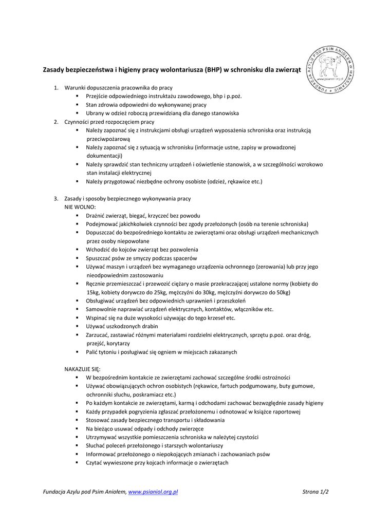 Zasady bezpieczeństwa i higieny pracy wolontariusza (BHP) w schronisku dla zwierząt 1. Warunki dopuszczenia pracownika do pracy Przejście odpowiedniego instruktażu zawodowego, bhp i p.poż. Stan zdrowia odpowiedni do wykonywanej pracy Ubrany w odzież roboczą przewidzianą dla danego stanowiska 2. Czynności przed rozpoczęciem pracy Należy zapoznać się z instrukcjami obsługi urządzeń wyposażenia schroniska oraz instrukcją przeciwpożarową Należy zapoznać się z sytuacją w schronisku (informacje ustne, zapisy w prowadzonej dokumentacji) Należy sprawdzić stan techniczny urządzeń i oświetlenie stanowisk, a w szczególności wzrokowo stan instalacji elektrycznej Należy przygotować niezbędne ochrony osobiste (odzież, rękawice etc.) 3. Zasady i sposoby bezpiecznego wykonywania pracy NIE WOLNO: Drażnić zwierząt, biegać, krzyczeć bez powodu Podejmować jakichkolwiek czynności bez zgody przełożonych (osób na terenie schroniska) Dopuszczać do bezpośredniego kontaktu ze zwierzętami oraz obsługi urządzeń mechanicznych przez osoby niepowołane Wchodzić do kojców zwierząt bez pozwolenia Spuszczać psów ze smyczy podczas spacerów Używać maszyn i urządzeń bez wymaganego urządzenia ochronnego (zerowania) lub przy jego nieodpowiednim zastosowaniu Ręcznie przemieszczać i przewozić ciężary o masie przekraczającej ustalone normy (kobiety do 15kg, kobiety dorywczo do 25kg, mężczyźni do 30kg, mężczyźni dorywczo do 50kg) Obsługiwać urządzeń bez odpowiednich uprawnień i przeszkoleń Samowolnie naprawiać urządzeń elektrycznych, kontaktów, włączników etc. Wspinać się na duże wysokości używając do tego krzeseł etc. Używać uszkodzonych drabin Zarzucać, zastawiać różnymi materiałami rozdzielni elektrycznych, sprzętu p.poż. oraz dróg, przejść, korytarzy Palić tytoniu i posługiwać się ogniem w miejscach zakazanych NAKAZUJE SIĘ: W bezpośrednim kontakcie ze zwierzętami zachować szczególne środki ostrożności Używać obowiązujących ochron osobistych (rękawice, fartuch podgumowany, buty gumowe, ochronniki słuchu, poskramiacz etc.) Po każdym kontakcie ze zwierzętami, karmą i odchodami zachować bezwzględnie zasady higieny Każdy przypadek pogryzienia zgłaszać przełożonemu i odnotować w książce raportowej Stosować zasady bezpiecznego transportu i składowania Na bieżąco usuwać odpady i odchody zwierzęce Utrzymywać wszystkie pomieszczenia schroniska w należytej czystości Słuchać poleceń przełożonego i starszych wolontariuszy Informować przełożonego o niepokojących zmianach i zachowaniach psów Czytać wywieszone przy kojcach informacje o zwierzętach Fundacja Azylu pod Psim Aniołem, www.psianiol.org.pl Strona 1/2 Przed spacerem zapiąć psu obrożę tak, by nie przełożył jej sobie przez głowę, zaś po spacerze rozluźnić mu obrożę, by się nie dusił Po przyjściu do schroniska włożyć swoje ubranie w podpisaną torbę i zostawić w kontenerze, torebkę/plecak można zostawić w biurze, zaś cenne rzeczy (portfel, pieniądze, dokumenty, telefon) należy nosić przy sobie 4. Czynności po zakończeniu pracy Uporządkować stanowisko pracy oraz zwierzęce (odłożyć na miejsce smycze, obroże i inne narzędzia) Dokonać przeglądu miejsc pobytu zwierząt objętych szczególnym nadzorem 5. Zasady postępowania w sytuacjach awaryjnych WYPADEK PRZY PRACY Należy jak najszybciej udzielić pierwszej pomocy poszkodowanemu i wezwać odpowiednie służby Każdy wypadek należy niezwłocznie zgłosić swojemu przełożonemu oraz zostawić stanowisko w takim samym stanie w jakim było, gdy nastąpił wypadek. W terminie 14 dni od wypadku musi również zostać wypełniona i przekazana do ZUS karta wypadku. ZGON ZWIERZĘCIA Należy założyć rękawice jednorazowe Zachowując szczególne środki ostrożności należy włożyć zwłoki zwierzęcia do worka foliowego i po jego szczelnym zamknięciu zwłoki umieścić w specjalnej zamrażarce Miejsce znalezienia martwego zwierzęcia należy posprzątać i umyć z zastosowaniem dostępnych środków bakteriobójczych O zaistniałym zdarzeniu należy niezwłocznie poinformować przełożonego i dokonać wpisu do dokumentacji PODEJRZENIE WŚCIEKLIZNY Należy powiadomić niezwłocznie przełożonego i prowadzącego lekarza weterynarii Należy zachować wszelkie środki ostrożności w postępowaniu ze zwierzęciem (odzież ochronna, rękawice, poskramiacz etc.), unikając bezpośredniego kontaktu Zwierzę należy umieścić w odrębnym pomieszczeniu odizolowanym od innych zwierząt Do sprzątania pobytu zwierzęcia należy stosować dostępne środki dezynfekcyjne Dalsze czynności należy prowadzić zgodnie z zaleceniami lekarza weterynarii AWARIE O wadach i/lub uszkodzeniach urządzeń i wyposażenia schroniska należy niezwłocznie powiadomić przełożonego 6. Uwagi Na podstawie art.210 K.P. pracownik ma prawo – w razie gdy warunki pracy nie odpowiadają przepisom bhp lub p.poż. i stwarzają bezpośrednie zagrożenie dla zdrowia lub życia pracownika lub gdy wykonywana przez niego praca grozi takim niebezpieczeństwem innym osobom – powstrzymać się od wykonywanej pracy, zawiadamiając o tym niezwłocznie przełożonego. Fundacja Azylu pod Psim Aniołem, www.psianiol.org.pl Strona 2/2