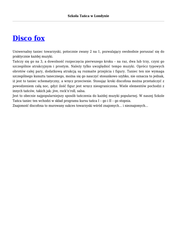 Szkoła Tańca w Londynie Disco fox Uniwersalny taniec towarzyski, potocznie zwany 2 na 1, pozwalający swobodnie poruszać się do praktycznie każdej muzyki. Tańczy się go na 3, a dowolność rozpoczęcia pierwszego kroku – na raz, dwa lub trzy, czyni go szczególnie atrakcyjnym i prostym. Należy tylko uwzględnić tempo muzyki. Oprócz typowych obrotów całej pary, dodatkową atrakcją są rozmaite przejścia i figury. Taniec ten nie wymaga szczególnego kunsztu tanecznego, można się go nauczyć stosunkowo szybko, nie oznacza to jednak, iż jest to taniec schematyczny, a wręcz przeciwnie. Stosując kroki discofoxa można przetańczyć z powodzeniem całą noc, gdyż ilość figur jest wręcz nieograniczona. Wiele elementów pochodzi z innych tańców, takich jak: jive, rock’n’roll, salsa. Jest to obecnie najpopularniejszy sposób tańczenia do każdej muzyki popularnej. W naszej Szkole Tańca taniec ten wchodzi w skład programu kursu tańca I – go i II – go stopnia. Znajomość discofoxa to murowany sukces towarzyski wśród znajomych… i nieznajomych…
