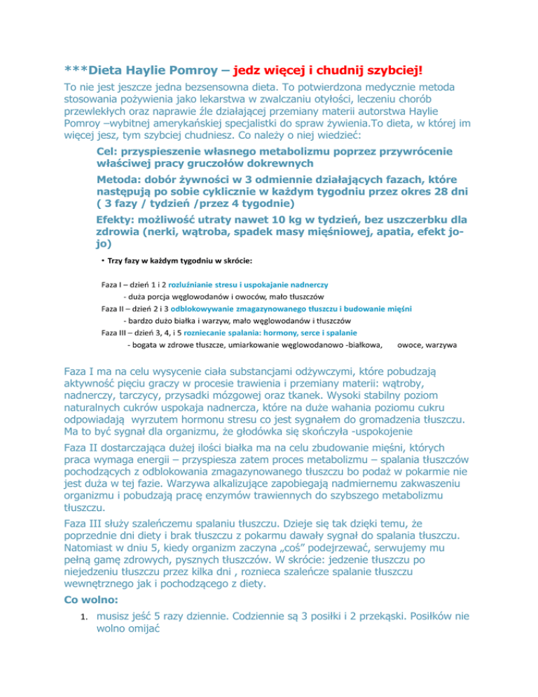 ***Dieta Haylie Pomroy – jedz więcej i chudnij szybciej! To nie jest jeszcze jedna bezsensowna dieta. To potwierdzona medycznie metoda stosowania pożywienia jako lekarstwa w zwalczaniu otyłości, leczeniu chorób przewlekłych oraz naprawie źle działającej przemiany materii autorstwa Haylie Pomroy –wybitnej amerykańskiej specjalistki do spraw żywienia.To dieta, w której im więcej jesz, tym szybciej chudniesz. Co należy o niej wiedzieć: Cel: przyspieszenie własnego metabolizmu poprzez przywrócenie właściwej pracy gruczołów dokrewnych Metoda: dobór żywności w 3 odmiennie działających fazach, które następują po sobie cyklicznie w każdym tygodniu przez okres 28 dni ( 3 fazy / tydzień /przez 4 tygodnie) Efekty: możliwość utraty nawet 10 kg w tydzień, bez uszczerbku dla zdrowia (nerki, wątroba, spadek masy mięśniowej, apatia, efekt jojo) Faza I ma na celu wysycenie ciała substancjami odżywczymi, które pobudzają aktywność pięciu graczy w procesie trawienia i przemiany materii: wątroby, nadnerczy, tarczycy, przysadki mózgowej oraz tkanek. Wysoki stabilny poziom naturalnych cukrów uspokaja nadnercza, które na duże wahania poziomu cukru odpowiadają wyrzutem hormonu stresu co jest sygnałem do gromadzenia tłuszczu. Ma to być sygnał dla organizmu, że głodówka się skończyła -uspokojenie Faza II dostarczająca dużej ilości białka ma na celu zbudowanie mięśni, których praca wymaga energii – przyspiesza zatem proces metabolizmu – spalania tłuszczów pochodzących z odblokowania zmagazynowanego tłuszczu bo podaż w pokarmie nie jest duża w tej fazie. Warzywa alkalizujące zapobiegają nadmiernemu zakwaszeniu organizmu i pobudzają pracę enzymów trawiennych do szybszego metabolizmu tłuszczu. Faza III służy szaleńczemu spalaniu tłuszczu. Dzieje się tak dzięki temu, że poprzednie dni diety i brak tłuszczu z pokarmu dawały sygnał do spalania tłuszczu. Natomiast w dniu 5, kiedy organizm zaczyna „coś” podejrzewać, serwujemy mu pełną gamę zdrowych, pysznych tłuszczów. W skrócie: jedzenie tłuszczu po niejedzeniu tłuszczu przez kilka dni , roznieca szaleńcze spalanie tłuszczu wewnętrznego jak i pochodzącego z diety. Co wolno: 1. musisz jeść 5 razy dziennie. Codziennie są 3 posiłki i 2 przekąski. Posiłków nie wolno omijać 2. musisz jeść co 3 - 4 godziny, chyba że śpisz 3. codziennie musisz zjeść w ciągu 30 minut od pobudki 4. musisz przestrzegać diety przez całe 28dni 5. musisz ściśle trzymać się listy pokarmów dozwolonych w danej fazie. 6. fazy muszą być stosowane w wyznaczonej kolejności 7. musisz wypić tyle litrów wody ile wynosi 1/3 twojej wagi podzielona przez 10 np. ważąc 75kg musisz wypić 2, 5 litra 8. jeśli to możliwe zawsze wybieraj produkty ekologiczne 9. jedz wyłączni mięso bez azotanów 10. ćwicz 3 razy w tygodniu zgodnie z fazą Czego nie wolno: 1. Żadnej pszenicy 2. żadnej kukurydzy 3. żadnych produktów mleczarskich 4. żadnej soi 5. żadnego cukru rafinowanego 6. żadnej kofeiny 7. żadnego alkoholu 8. żadnych suszonych owoców i soków owocowych 9. żadnych sztucznych słodzików żadnej beztłuszczowej, "dietetycznej" żywności Zastosowanie się do tych zaleceń nie przychodzi naszym pacjentom z trudem a widoczne efekty zachęcają, by pozostać im wiernym na dłużej. Służymy swoją wiedzą i doświadczeniem, wspieramy w momentach krytycznych ale przede wszystkim dbamy, by najważniejszym celem było zdrowie.