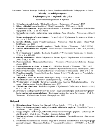 Powiatowe Centrum Rozwoju Edukacji w Iławie, Powiatowa Biblioteka Pedagogiczna w Iławie Metody i techniki plastyczne Papieroplastyka – orgiami i nie tylko zestawienie bibliograficzne w wyborze 1. 100 zabawek pod choinkę / Halina Kowalczyk. – Bydgoszcz : „Pomorze”, 1987 2. Bibuły - bibułki / Anna Sowińska // Bliżej Przedszkola. - 2010, nr 4, s. 58–59 3. Gładkie i chropowate / Krystyna Marcinkowska. - Warszawa : Wydawnictwa Szkolne i Pe- dagogiczne, 1995. – S. 31-50 : Papier 4. Gwiazdkowe robótki : zabawki na i pod choinkę / Anna Misiurka. – Warszawa : „Klucz”, 1991 5. Konserwacja papieru? – a to ciekawe… / Anna Czajka // Wychowanie Techniczne w Szkole. – 1987, nr 5, s. 474-479 6. Kwiaty z bibuły / Sigrid Wetzel-Maesmanns. - Warszawa : Klub dla Ciebie - Bauer-Welt- bild Media, cop. 2006 7. Latające i pływające zabawki z papieru / Claudia Hüfner. – Warszawa : „Delta”, [1996] 8. Modele wielościanów bez klejenia / Ewa Szewczyk // Matematyka. - 2001, nr 1, wkładka, 9. 10. 11. 12. 13. 14. 15. 16. 17. 18. 19. 20. s. 9-13 O wycinankach w szkole / Leokadia Kwaśnik // Wychowanie Techniczne w Szkole. – 1990, nr 4, s. 197-198 Ozdoby choinkowe / Maria Gołębiewska, Bożena Rytel // Wychowanie w Przedszkolu. – 2008, nr 11, s. 40-43 Papieroplastyka / Małgorzata Daszyńska. – Warszawa : Wydawnictwa Szkolne i Pedagogiczne, 1994 Papieroplastyka w szkole i w domu. Cz. 1 / Elżbieta Szmydt. - Warszawa : "Bis", 2012 Papierowe fantazje / Charyl Owen // Kraków : Wydawnictwo Ryszard Kluszczyński, 1994 Papierowe zwierzaki / Maria Gołębiewska // Wychowanie w Przedszkolu. - 2013, nr 4, s. 50 Pisanki, palemki... / Maria Gołębiewska, Bożena Rytel // Wychowanie w Przedszkolu. 2007, nr 4, s. 40-44 Tangramy / Juliusz Sz. Batura // Edukacja i Dialog. – 2001, nr 6, s. 39-40 Wycinanka / Juliusz Sz. Batura // Edukacja i Dialog. – 1995, nr 3, s. 44-46 Wydzieranki i wycinanki / Krystyna Marcinkowska, Krystyna Michejda-Kowalska. – Warszawa : Wydawnictwa Szkolne i Pedagogiczne, 1995 Zdobnictwo bibułkowe / Zofia Leszczyńska // Wychowanie Techniczne w Szkole. – 1995, nr 2, s. 118-119 Zrobimy to sami : projekty i wzory do zabaw i zajęć konstrukcyjno-plastycznych w placówkach wychowania przedszkolnego / Kazimiera Łubkowska, Irena Zgrychowa. - Wyd. 3. Warszawa : Wydawnictwa Szkolne i Pedagogiczne, 1987 Origami 1. Historia orgiami / Jolanta Ewa Skwarek // Życie Szkoły. – 1999, nr 2, s. 88-92 2. Klasyczne formy orgiami – azjatycka sztuka układania papieru / Pham Dinh Tuyen. – Warszawa : „Delta”, [1995] 3. Księga origami : dekoracje, zabawki i praktyczne drobiazgi z papieru / [tekst i rys. Didier Boursin]. - Wyd. 2 zm. - Wrocław : Larousse Polska, 2005 4. Modułowe zabawy czyli origami modułowe z kwadratu / Dorota Dziamska. - Warszawa : "Bis", 2007 5. Możliwości wykorzystania techniki origami w procesie kształtowania niektórych pojęć geometrycznych / Małgorzata Nadolna // Nauczanie Początkowe. – 2000/2001, nr 5, s. 5964 6. Nadmuchiwane formy orgiami / Teresa Gołąb // Wychowanie Techniczne w Szkole. – 7. 8. 9. 10. 11. 12. 13. 14. 15. 16. 17. 18. 19. 20. 21. 22. 23. 24. 25. 26. 27. 28. 29. 30. 31. 1996, nr 2, s. 90-93 Origami / Wiesława Martyniuk. – Bibliogr. // Życie Szkoły. - 2010, nr 5, s. 34-38 Origami / Juliusz Sz. Batura // Edukacja i Dialog. – 1995, nr 1, s. 52-53 Orgiami / Masakatsu Yoshida. – Łódź : Krajowa Agencja Wydawnicza, 1988 Origami – formy podstawowe w edukacji dziecka / Jerzy Pobralski // Życie Szkoły. – 1999, nr 3, s. 184, 217-221 Origami – metoda nauczania pośredniego / Dorota Dziamska // Edukacja i Dialog. – 1997, nr 10, s. 51-54 Origami – metoda wychowania do twórczości / Dorota Dziamska // Edukacja i Dialog. – 1996, nr 2, s. 57-61 Origami – sposób na sukces ucznia i nauczyciela / Dorota Dziamska // Edukacja i Dialog. – 1995, nr 5, s. 52-55 Origami – sztuka składania papieru / Teresa Dziurzyńska // Wychowanie w Przedszkolu. – 1991, nr 2, s. 122-124 Origami – twórcza inspiracja / Hanna Belkiewicz. – Bibliogr. // Wychowawca. - 2007, nr 3, s. 8-9 Origami uczy i bawi : wykorzystanie technik origami do pracy z dziećmi upośledzonymi w stopniu lekkim i umiarkowanym / Katarzyna Warchoł // Szkoła Specjalna. – 2000, nr 5, s. 259-261 Origami uczy, rozwija, usprawnia, bawi i wychowuje / Teresa Gołąb // Wychowanie Techniczne w Szkole. – 1994, nr 4, s. 217-220; 1994, nr 5, s. 263-265 Origami w edukacji i terapii / Jolanta Ewa Skwarek // Wychowanie w Przedszkolu. – 1998, nr 8, s. 594-598 Origami w pracy dydaktyczno-wychowawczej / Teresa Gołąb. – Bibliogr. // Życie Szkoły. – 1993, nr 8, s. 483-489 Orgiami w szkole / Halina Rościszowska-Narloch // Świetlica w Szkole. – 2008, nr 1, s. 26 Origami w świetlicy i nie tylko... / Jolanta Trawczyńska // Problemy Opiekuńczo-Wychowawcze. - 2003, nr 4, s. 33–34 Origami w terapii i edukacji / Dorota Dziamska // Edukacja i Dialog // 1995, nr 4, s. 58-59 Poszukiwanie nowego kształtu [orgiami] / Dorota Dziamska // Edukacja i Dialog. – 1996, nr 5, s. 39-41 Problem szpaka Mateusza : rozwijanie płaszczyzny orgiami / Dorota Dziamska // Edukacja i Dialog. – 1999, nr 1, s. 28-32 Przez składanie papieru – do nauczania rysunku / Dorota Dziamska // Edukacja i Dialog. – 1995, nr 8, s. 51-55 Ptaki z origami - sposób na jesienną szarugę : zajęcia otwarte dla szkół podstawowych / Katarzyna Wójkiewicz-Huszcza // Świetlica w Szkole. - 2010, nr 3, s. 29 Sztuka origami w przedszkolu / Dorota Dziamska, Janina Krystyna Tiereszko. – Bibliogr. // Wychowanie w Przedszkolu. - 2006, nr 11, s. 10-14 Technika origami w edukacji technicznej w zintegrowanym nauczaniu początkowym / Anna Boguszewska // Wychowanie Techniczne w Szkole. – 2001, nr 1, s.19-25 Wychowawcze walory orgiami / Maria Klimowa // Problemy Opiekuńczo-Wychowawcze. – 1992, nr 5/6, s. 234-236 Zastosowanie falterów w nauczaniu pośrednim [orgiami] / Dorot