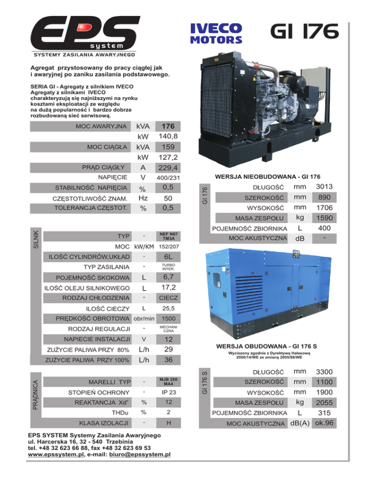 Agregat przystosowany do pracy ci¹g³ej jak i awaryjnej po zaniku zasilania podstawowego. SERIA GI - Agregaty z silnikiem IVECO Agregaty z silnikami IVECO charakteryzuj¹ siê najni¿szymi na rynku kosztami eksploatacji ze wzglêdu na du¿¹ popularnoœæ i bardzo dobrze rozbudowan¹ sieæ serwisow¹. kVA kW MOC CI¥G£A PR¥D CI¥G£Y NAPIÊCIE STABILNOŒÆ NAPIÊCIA CZÊSTOTLIWOŒÆ ZNAM. TOLERANCJA CZÊSTOT. 176 140,8 159 kVA kW 127,2 A 229,4 V 400/231 0,5 % Hz % 50 0,5 WERSJA NIEOBUDOWANA - GI 176 GI 176 MOC AWARYJNA D£UGOŒÆ SZEROKOŒÆ WYSOKOŒÆ POJEMNOŒÆ ZBIORNIKA TYP - MOC AKUSTYCZNA L dB 3013 890 1706 1590 400 - MOC kW/KM 152/207 ILOŒÆ CYLINDRÓW,UK£AD - 6L TYP ZASILANIA - TURBO INTER. POJEMNOŒÆ SKOKOWA L ILOŒÆ OLEJU SILNIKOWEGO L 6,7 17,2 RODZAJ CH£ODZENIA - CIECZ ILOŒÆ CIECZY L 25,5 PRÊDKOŒÆ OBROTOWA obr/min 1500 RODZAJ REGULACJI - MECHANI CZNA NAPIECIE INSTALACJI V 12 29 ZU¯YCIE PALIWA PRZY 80% ZU¯YCIE PALIWA PRZY 100% PR¥DNICA NEF N67 TM3A L/h L/h - IP 23 REAKTANCJA Xd” % 12 THDu % 2 - H STOPIEÑ OCHRONY KLASA IZOLACJI Wyciszony zgodnie z Dyrektyw¹ Ha³asow¹ 2000/14/WE ze zmian¹ 2005/88/WE 36 MJB 250 MA4 MARELLI TYP WERSJA OBUDOWANA - GI 176 S EPS SYSTEM Systemy Zasilania Awaryjnego ul. Harcerska 16, 32 - 540 Trzebinia tel. +48 32 623 66 88, fax +48 32 623 69 53 www.epssystem.pl, e-mail: [email protected] GI 176 S SILNIK MASA ZESPO£U mm mm mm kg D£UGOŒÆ SZEROKOŒÆ WYSOKOŒÆ MASA ZESPO£U POJEMNOŒÆ ZBIORNIKA MOC AKUSTYCZNA mm mm mm kg 3300 1100 1900 2055 315 L dB(A) ok.96 DANE INSTALACYJNO PROJEKTOWE AGREGATU GI 176 NIEOBUDOWANY WYSOKOŒÆ CH£ODNICY mm 900 SZEROKOŒÆ CH£ODNICY mm 685 WYS. CH£ODNICY NAD POD£O¯EM mm 511 MINIMALNA POWIERZCHNIA CZERPNI m2 0,74 MINIMALNA POWIERZCHNIA WYRZUTNI m2 0,62 ŒREDNICA RURY WYDECHOWEJ MAX. PRZEKROJE PRZEWODÓW (LgY) mm mm 2 OBUDOWANY 0,74 88,9 88,9 2x240 2x240 Powy¿sze dane umo¿liwiaj¹ prawid³owe zaprojektowanie uk³adów wentylacji i wydechu spalin w pomieszczeniach przeznaczonych do zabudowy zespo³ów pr¹dotwórczych. Dok³adne wielkoœci czerpni i wyrzutni oraz przekrój kabla powinny uwzglêdniaæ lokalizacjê zespo³u. Aby pod³¹czyæ przewody o wiêkszym przekroju nale¿y zainstalowaæ skrzynkê przejœciow¹. Moc awaryjana ( STAND-BY/LTP wg. PN-ISO 8528) - moc zespo³u u¿ywanego do awaryjnego zasilania, maksymalna moc dostêpna przy zmiennym obci¹¿eniu. Roczny limit 500 godzin. Nie dopuszcza siê przeci¹¿eñ. Moc ci¹g³a ( PRP wg. PN-ISO 8528) - moc przy pracy ci¹g³ej przy zmiennym obci¹¿eniu dla nieograniczonego czasu pracy. W razie potrzeby mo¿liwe jest 10 % przeci¹¿enie. KOMPLETACJA ZESPO£U Silnik i pr¹dnica Rama stalowa z uk³adem t³umienia drgañ Uk³ad ch³odzenia z ch³odnic¹ Akumulator rozruchowy, instalacja elektryczna Zbiornik paliwa, instalacja paliwowa T³umik wydechu i kompensator - luzem Wy³¹cznik g³ówny pr¹dnicy Panel sterowania Pompa spustu oleju DODATKOWE ELEMENTY AGREGATU OBUDOWANEGO Obudowa stalowa lakierowana proszkowo T³umik zabudowany wewn¹trz obudowy Drzwi dostêpu serwisu zamykane na klucz Okno do odczytu wskazañ przyrz¹dów Wy³¹cznik bezpieczeñstwa na zewn¹trz obudowy Dodatkowe informacje dotycz¹ce paneli sterowania w osobnych folderach. Dok³adne informacje dotycz¹ce zabudowy i instalacji zespo³ów pr¹dotwórczych w materia³ach dodatkowych. Agregaty w wersji otwartej przeznaczone s¹ do zabudowania w pomieszczeniu lub w kontenerze. Wersje obudowane s¹ odporne na dzia³anie warunków atmosferycznych, wiêc mog¹ byæ instalowane na zewn¹trz. Dostêpne s¹ ró¿ne panele sterowania: - panel sterowania rêcznego, - panel sterowania automatycznego (uruchamia zespó³ od styku bezpotencja³owego) - panel sterowania automatycznego wraz z uk³adem SZR (Samoczynnego Za³¹czenia Rezerwy). Wersje automatyczne wyposa¿ane s¹ standardowo w uk³ad podgrzewania bloku silnika i ³adowarkê akumulatorów OPCJE: - obudowy kontenerowe - wykonanie stalowe, betonowe, prefabrykowane - homologowane podwozia jezdne. - zabezpieczenia ró¿nicowo - pr¹dowe - gniazda 1 i 3 fazowe z zabezpieczeniami - uk³ady zdalnie monitoruj¹ce pracê - styki bezpotencja³owe do sygnalizacji stanów pracy - uk³ad podgrzewania bloku silnika. - ³adowarka akumulatorów. - powiêkszone zbiorniki podstawowe - zewnêtrzne zbiorniki z uk³adami przetankowania. - t³umiki o podwy¿szonym stopniu t³umienia. - wybór koloru obudowy (w standardzie niebieski RAL 5010) Nasze produkty ulegaj¹ ci¹g³ej modyfikacji, wiêc aktualna oferta mo¿e nieznacznie odbiegaæ wygl¹dem i pewnymi parametrami. Prezentowane fotografie s³u¿¹ tylko celom pogl¹dowym. EPS SYSTEM Systemy Zasilania Awaryjnego ul. Harcerska 16, 32 - 540 Trzebinia tel. +48 32 623 66 88, fax +48 32 623 69 53 www.epssystem.pl, e-mail: [email protected]
