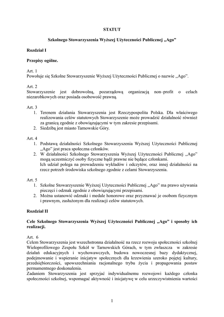 STATUT Szkolnego Stowarzyszenia Wyższej Użyteczności Publicznej ,,Ago” Rozdział I Przepisy ogólne. Art. 1 Powołuje się Szkolne Stowarzyszenie Wyższej Użyteczności Publicznej o nazwie ,,Ago”. Art. 2 Stowarzyszenie jest dobrowolną, pozarządową niezarobkowych oraz posiada osobowość prawną. organizacją non–profit o celach Art. 3 1. Terenem działania Stowarzyszenia jest Rzeczypospolita Polska. Dla właściwego realizowania celów statutowych Stowarzyszenie może prowadzić działalność również za granicą zgodnie z obowiązującymi w tym zakresie przepisami. 2. Siedzibą jest miasto Tarnowskie Góry. Art. 4 1. Podstawą działalności Szkolnego Stowarzyszenia Wyższej Użyteczności Publicznej ,,Ago” jest praca społeczna członków. 2. W działalności Szkolnego Stowarzyszenia Wyższej Użyteczności Publicznej ,,Ago” mogą uczestniczyć osoby fizyczne bądź prawne nie będące członkami. Ich udział polega na prowadzeniu wykładów i odczytów, oraz innej działalności na rzecz potrzeb środowiska szkolnego zgodnie z celami Stowarzyszenia. Art. 5 1. Szkolne Stowarzyszenie Wyższej Użyteczności Publicznej ,,Ago” ma prawo używania pieczęci i odznak zgodnie z obowiązującymi przepisami. 2. Można ustanowić odznaki i medale honorowe oraz przyznawać je osobom fizycznym i prawnym, zasłużonym dla realizacji celów statutowych. Rozdział II Cele Szkolnego Stowarzyszenia Wyższej Użyteczności Publicznej ,,Ago” i sposoby ich realizacji. Art. 6 Celem Stowarzyszenia jest wszechstronna działalność na rzecz rozwoju społeczności szkolnej Wieloprofilowego Zespołu Szkół w Tarnowskich Górach, w tym zwłaszcza w zakresie działań edukacyjnych i wychowawczych, budowa nowoczesnej bazy dydaktycznej, podejmowanie i wspieranie inicjatyw społecznych dla krzewienia szeroko pojętej kultury, przedsiębiorczości, upowszechniania racjonalnego trybu życia i propagowania postaw permamentnego doskonalenia. Zadaniem Stowarzyszenia jest sprzyjać indywidualnemu rozwojowi każdego członka społeczności szkolnej, wspomagać aktywność i inicjatywę w celu urzeczywistnienia wartości 1 osobowych we wszystkich zakresach aktywności intelektualnej, emocjonalnej, estetycznej, moralnej oraz obywatelskiej. Nazwa nawiązuje do greckiego określenia ,,ago” – tzn. ,,prowadzę” i odnosi się do szeroko rozumianej działalności pedagogicznej, edukacyjnej i opiekuńczej. Stowarzyszenie realizuje wyłącznie cele wyższej użyteczności publicznej w rozumieniu rozdziału ,,Cele ulg podatkowych” przepisów podatkowych. Szkolne Stowarzyszenie ,,Ago” realizuje w szczególności następujące cele: 1. Działa na rzecz likwidowania wszelkich barier i ograniczeń w powszechnym dostępie do wiedzy w Wieloprofilowym Zespole Szkół. 2. Promuje reformy krajowego systemu kształcenia, sprzyjające poprawie jakości kształcenia uwzględniając cele prospołeczne, indywidualne możliwości, potrzeby i oczekiwania uczniów, a także potrzeby rynku pracy. 3. Wspiera innowacyjne metody kształcenia, wykorzystując nowe osiągnięcia techniki, technologii informacyjnej, informatyki, z wykorzystaniem elektronicznych nośników informacji. 4. Propaguje konieczność kształcenia w aspekcie integracji z Unią Europejską. 5. Umożliwia podnoszenie kwalifikacji osób zajmujących się kształceniem. 6. Inicjuje przedsięwzięcia i programy kształcenia w Wieloprofilowym Zespole Szkół w porozumieniu z właściwymi organami administracji państwowej i samorządowej. 7. Inicjuje i organizuje przedsięwzięcia edukacyjne takie jak szkolenia, kursy, wykłady, seminaria, konferencje itp. 8. Podtrzymuje tradycję narodową i kształtuje tożsamość regionalną. 9. Współpracuje z instytucjami i podmiotami zajmującymi się edukacją, wychowaniem i działalnością opiekuńczą. Art. 7 Cele statutowe Szkolne Stowarzyszenie Wyższej Użyteczności Publicznej ,,Ago” realizuje poprzez następujące działania dla Wieloprofilowego Zespołu Szkół: 1. Organizowanie i finansowanie zakupu sprzętu i wyposażenia, wzbogacenie bazy i estetyki szkoły. 2. Organizowanie szkoleń, konferencji, konkursów. 3. Przyznawanie nagród i stypendiów dla wyróżniających się uczniów. 4. Prowadzenie działalności wydawniczej, organizowanie akcji promujących Wieloprofilowy Zespół Szkół 5. Prowadzenie zajęć wyrównawczych, pozalekcyjnych, socjoterapeutycznych, integracyjnych i innych indywidualnych i grupowych zgodnie z celami Stowarzyszenia. 6. Organizowanie pomocy materialnej dla uczniów. 7. Prowadzenie działalności w zakresie szeroko rozumianej profilaktyki, w tym promowanie zdrowego trybu życia i racjonalnego spędzania czasu wolnego. 8. Inne działania związane z edukacją, opieką i wychowaniem. Rozdział III Członkostwo Szkolnego Stowarzyszenia Wyższej Użyteczności Publicznej ,,Ago”. Art. 8 Członkami Szkolnego Stowarzyszenia Wyższej Użyteczności Publicznej ,,Ago” są: 1. Członkowie zwyczajni. 2. Członkowie honorowi. 2 3. Członkowie wspierający. Art.9 1. Członkiem zwyczajnym może być każda osoba fizyczna, posiadająca obywatelstwo polskie i nie pozbawiona praw publicznych prawomocnym wyrokiem sądu, która ukończyła 18 lat. 2. Osoba fizyczna zostaje członkiem Szkolnego Stowarzyszenia Wyższej Użyteczności Publicznej ,,Ago” po złożeniu deklaracji członkowskiej, opłaceniu wpisowego i składki członkowskiej. Art. 10 1. Szkolne Stowarzyszenie Wyższej Użyteczności Publicznej ,,Ago” ma prawo – w uznaniu działań na rzecz realizacji celów statutowych – nadać wybranej osobie fizycznej honorowe członkostwo. 2. Honorowe członkostwo nadaje Zarząd osobie, która uprzednio wyraziła zgodę na jego przyjęcie. Art. 11 1. Członkostwo osoby fizycznej ustaje w przypadku wystąpienia, wykluczenia, śmierci albo pozbawienia osoby praw publicznych prawomocnym wyrokiem sądu. 2. Członek może wystąpić ze Stowarzyszenia poprzez złożenie do Zarządu pise