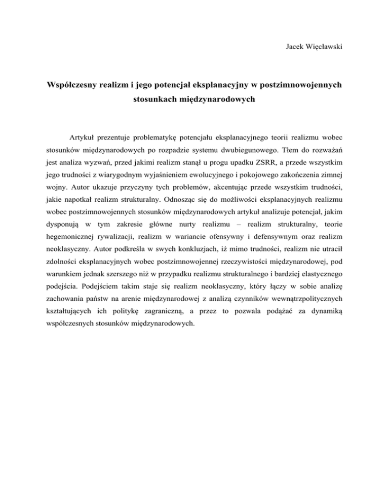 Jacek Więcławski Współczesny realizm i jego potencjał eksplanacyjny w postzimnowojennych stosunkach międzynarodowych Artykuł prezentuje problematykę potencjału eksplanacyjnego teorii realizmu wobec stosunków międzynarodowych po rozpadzie systemu dwubiegunowego. Tłem do rozważań jest analiza wyzwań, przed jakimi realizm stanął u progu upadku ZSRR, a przede wszystkim jego trudności z wiarygodnym wyjaśnieniem ewolucyjnego i pokojowego zakończenia zimnej wojny. Autor ukazuje przyczyny tych problemów, akcentując przede wszystkim trudności, jakie napotkał realizm strukturalny. Odnosząc się do możliwości eksplanacyjnych realizmu wobec postzimnowojennych stosunków międzynarodowych artykuł analizuje potencjał, jakim dysponują w tym zakresie główne nurty realizmu – realizm strukturalny, teorie hegemonicznej rywalizacji, realizm w wariancie ofensywny i defensywnym oraz realizm neoklasyczny. Autor podkreśla w swych konkluzjach, iż mimo trudności, realizm nie utracił zdolności eksplanacyjnych wobec postzimnowojennej rzeczywistości międzynarodowej, pod warunkiem jednak szerszego niż w przypadku realizmu strukturalnego i bardziej elastycznego podejścia. Podejściem takim staje się realizm neoklasyczny, który łączy w sobie analizę zachowania państw na arenie międzynarodowej z analizą czynników wewnątrzpolitycznych kształtujących ich politykę zagraniczną, a przez to pozwala podążać za dynamiką współczesnych stosunków międzynarodowych.