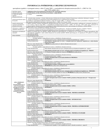 INFORMACJA POŚREDNIKA UBEZPIECZENIOWEGO sporządzona zgodnie z wymogami ustawy z dnia 22 maja 2003 r. o pośrednictwie ubezpieczeniowym (Dz.U. z 2003 Nr 124, poz. 1154 z późn. zm.) określenie agenta ubezpieczeniowego nr wpisu do rejestru agentów ubezpieczeniowych Spółdzielcza Kasa Oszczędnościowo-Kredytowa im. Franciszka Stefczyka 81-455 Gdynia, ul. Boh. Starówki Warszawskiej 6 (dalej SKOK) nr wpisu: 11152750/A wniosek (ustny, pisemny, w formie elektronicznej, telefonicznie) do Komisji Nadzoru Finansowego o udzielenie informacji z rejestru, sposób sprawdzenia wpisu dostęp do informacji na wydzielonym stanowisku komputerowym w godzinach pracy Komisji, do rejestru na podstawie rozporządzenia Ministra Finansów z dnia 18 września 2006 r. w sprawie prowadzenia rejestru pośredników ubezpieczeniowych oraz sposobu udostępniania informacji z tego rejestru (Dz.U. z 2006 r. Nr 178, poz. 1316); sposób wykonywania SKOK wykonuje czynności pośrednictwa ubezpieczeniowego przy pomocy etatowych pracowników spełniających wymagania określone w czynności pośrednictwa art. 9 ustawy z dnia 22 maja 2003 r. o pośrednictwie ubezpieczeniowym (Dz.U. z 2003 r. Nr 124, poz. 1154 z późn. zm.), wpisanych do ubezpieczeniowego rejestru agentów ubezpieczeniowych i posiadających odpowiednie pełnomocnictwa upoważniające do działania w imieniu SKOK; SKOK działa na rzecz następujących zakładów ubezpieczeń: informacja o współpracy z • Towarzystwo Ubezpieczeń na Życie Spółdzielczych Kas Oszczędnościowo - Kredytowych Spółka Akcyjna z siedzibą w Sopocie, zakładami ubezpieczeń • Towarzystwo Ubezpieczeń Wzajemnych Spółdzielczych Kas Oszczędnościowo-Kredytowych z siedzibą w Sopocie informacja o posiadanych SKOK nie posiada akcji ani udziałów zakładu ubezpieczeń uprawniających, co najmniej do 10 % głosów na walnym zgromadzeniu albo udziałach zgromadzeniu wspólników; żaden zakład ubezpieczeń nie posiada udziałów SKOK uprawniających, co najmniej do 10% głosów na walnym zgromadzeniu SKOK obszar działania Rzeczpospolita Polska Dział I: Ubezpieczenia na życie (nr grupy zgodnie z załącznikiem do ustawy o działalności ubezpieczeniowej) Grupa ubezpieczenia Rodzaj ubezpieczenia Ubezpieczenia na życie z ubezpieczeniowym funduszem kapitałowym – grupa 3 Indywidualne ubezpieczenie na życie z ubezpieczeniowym funduszem kapitałowym „Indywidualne Konto Emerytalne” 2 000,00 zł na jedną umowę (w zakresie ubezpieczenia na życie) Max wys. sumy ubezpieczenia Dział I: Ubezpieczenia na życie (nr grupy zgodnie z załącznikiem do ustawy o działalności ubezpieczeniowej) Grupa ubezpieczenia Indywidualne ubezpieczenie na życie z ubezpieczeniowym funduszem kapitałowym – grupa 3 zakres działalności agenta ubezpieczeniowego na rzecz Towarzystwa Ubezpieczeń na Życie Spółdzielczych Kas OszczędnościowoKredytowych Spółka Akcyjna Rodzaj ubezpieczenia Indywidualne ubezpieczenie na życie z ubezpieczeniowym funduszem kapitałowym - PROFIT Max wys. sumy ubezpieczenia 1% Wartości Wykupu, jednak nie więcej niż 10 000,00 zł na jedną umowę Dział I: Ubezpieczenia na życie (nr grupy zgodnie z załącznikiem do ustawy o działalności ubezpieczeniowej) Grupa ubezpieczenia Ubezpieczenia na życie – grupa 1 Rodzaj ubezpieczenia Grupowe ubezpieczenie na życie pożyczkobiorców PROMESA Max wys. sumy ubezpieczenia 100 000,00 zł Dział I: ubezpieczenie na życie (nr grupy zgodnie z załącznikiem do ustawy o działalności ubezpieczeniowej) Grupa ubezpieczenia Ubezpieczenia na życie – grupa 1 Rodzaj ubezpieczenia Indywidualne terminowe ubezpieczenie na życie BONUS Max wys. sumy ubezpieczenia 500 000,00 zł na jedną umowę ubezpieczenia Dział I: ubezpieczenie na życie (nr grupy zgodnie z załącznikiem do ustawy o działalności ubezpieczeniowej) Grupa ubezpieczenia Ubezpieczenia na życie – grupa 3 Rodzaj ubezpieczenia Indywidualne ubezpieczenie na życie z ubezpieczeniowym funduszem kapitałowym - PROGRES Max wys. sumy ubezpieczenia 10% Wartości Wykupu, jednak nie więcej niż 100 000,00 zł na jedną umowę ubezpieczenia Dział I: ubezpieczenie na życie (nr grupy zgodnie z załącznikiem do ustawy o działalności ubezpieczeniowej) Grupa ubezpieczenia Ubezpieczenia na życie – grupa 1, 5 Rodzaj ubezpieczenia Grupowe ubezpieczenie na życie członków SKOK, posiadaczy linii pożyczkowych – Ubezpieczenie LPP Max wys. sumy ubezpieczenia 50 000,00 zł Dział I: ubezpieczenie na życie (nr grupy zgodnie z załącznikiem do ustawy o działalności ubezpieczeniowej) Grupa ubezpieczenia Ubezpieczenia na życie – grupa 1 Rodzaj ubezpieczenia Grupowe ubezpieczenie na życie członków SKOK - LINEA Max wys. sumy ubezpieczenia 100 000,00 zł Dział I: Ubezpieczenia na życie (nr grupy zgodnie z załącznikiem do ustawy o działalności ubezpieczeniowej) Grupa ubezpieczenia Ubezpieczenia na życie – grupa 1 Rodzaj ubezpieczenia Grupowe ubezpieczenie na życie Członków SKOK - PROMESA KOMFORT Max wys. sumy ubezpieczenia 100 000,00 zł Dział I: ubezpieczenie na życie (nr grupy zgodnie z załącznikiem do ustawy o działalności ubezpieczeniowej) Grupa ubezpieczenia Ubezpieczenia na życie – grupa 1 Rodzaj ubezpieczenia Grupowe ubezpieczenie na życie członków SKOK – OPTIMUM MAX Max wys. sumy ubezpieczenia 20 000,00 zł Dział I: Ubezpieczenia na życie (nr grupy zgodnie z załącznikiem do ustawy o działalności ubezpieczeniowej) Grupa ubezpieczenia Ubezpieczenia na życie – grupa 1 Rodzaj ubezpieczenia Grupowe ubezpieczenie na życie Członków SKOK - PROMESA SUPERKOMFORT Max wys. sumy ubezpieczenia 100 000,00 zł Dział I: ubezpieczenie na życie (nr grupy zgodnie z załącznikiem do ustawy o działalności ubezpieczeniowej) Grupa ubezpieczenia Ubezpieczenia na życie – grupa 1 Rodzaj ubezpieczenia Grupowe ubezpieczenie na życie członków SKOK – PROMESA STANDARD Max wys. sumy ubezpieczenia 500 000,00 zł Dział I: ubezpieczeni