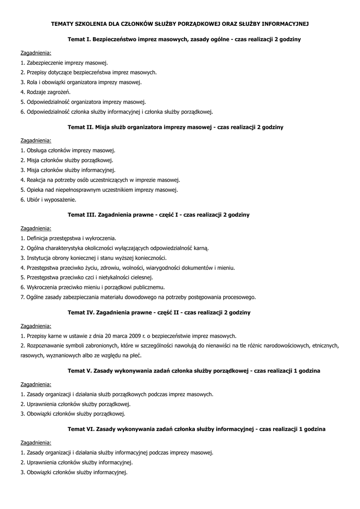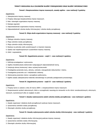 TEMATY SZKOLENIA DLA CZŁONKÓW SŁUŻBY PORZĄDKOWEJ ORAZ SŁUŻBY INFORMACYJNEJ Temat I. Bezpieczeństwo imprez masowych, zasady ogólne - czas realizacji 2 godziny Zagadnienia: 1. Zabezpieczenie imprezy masowej. 2. Przepisy dotyczące bezpieczeństwa imprez masowych. 3. Rola i obowiązki organizatora imprezy masowej. 4. Rodzaje zagrożeń. 5. Odpowiedzialność organizatora imprezy masowej. 6. Odpowiedzialność członka służby informacyjnej i członka służby porządkowej. Temat II. Misja służb organizatora imprezy masowej - czas realizacji 2 godziny Zagadnienia: 1. Obsługa członków imprezy masowej. 2. Misja członków służby porządkowej. 3. Misja członków służby informacyjnej. 4. Reakcja na potrzeby osób uczestniczących w imprezie masowej. 5. Opieka nad niepełnosprawnym uczestnikiem imprezy masowej. 6. Ubiór i wyposażenie. Temat III. Zagadnienia prawne - część I - czas realizacji 2 godziny Zagadnienia: 1. Definicja przestępstwa i wykroczenia. 2. Ogólna charakterystyka okoliczności wyłączających odpowiedzialność karną. 3. Instytucja obrony koniecznej i stanu wyższej konieczności. 4. Przestępstwa przeciwko życiu, zdrowiu, wolności, wiarygodności dokumentów i mieniu. 5. Przestępstwa przeciwko czci i nietykalności cielesnej. 6. Wykroczenia przeciwko mieniu i porządkowi publicznemu. 7. Ogólne zasady zabezpieczania materiału dowodowego na potrzeby postępowania procesowego. Temat IV. Zagadnienia prawne - część II - czas realizacji 2 godziny Zagadnienia: 1. Przepisy karne w ustawie z dnia 20 marca 2009 r. o bezpieczeństwie imprez masowych. 2. Rozpoznawanie symboli zabronionych, które w szczególności nawołują do nienawiści na tle różnic narodowościowych, etnicznych, rasowych, wyznaniowych albo ze względu na płeć. Temat V. Zasady wykonywania zadań członka służby porządkowej - czas realizacji 1 godzina Zagadnienia: 1. Zasady organizacji i działania służb porządkowych podczas imprez masowych. 2. Uprawnienia członków służby porządkowej. 3. Obowiązki członków służby porządkowej. Temat VI. Zasady wykonywania zadań członka służby informacyjnej - czas realizacji 1 godzina Zagadnienia: 1. Zasady organizacji i działania służby informacyjnej podczas imprezy masowej. 2. Uprawnienia członków służby informacyjnej. 3. Obowiązki członków służby informacyjnej. Temat VII. Zadania służb organizatora imprezy masowej - czas realizacji 3 godziny Zagadnienia: 1. Cel zabezpieczenia imprezy masowej. 2. Zasady realizacji zadań członka służby porządkowej i służby informacyjnej w związku z: a) kontrolą osób uczestniczących w imprezie masowej, b) kontrolą przestrzegania regulaminu imprezy masowej i regulaminu obiektu (terenu), c) kontrolą przestrzegania przepisów przeciwpożarowych na terenie, na którym odbywa się impreza masowa, d) ujęciem sprawcy przestępstwa lub wykroczenia, e) legitymowaniem, przeglądaniem zawartości bagażu lub odzieży osób uczestniczących w imprezie masowej, f) usunięciem osoby uczestniczącej w imprezie masowej z miejsca przeprowadzania imprezy masowej, g) dokumentowaniem podejmowanych czynności. 3. Współpraca z Policją oraz innymi uprawnionymi podmiotami w trakcie działań służących zapewnieniu porządku podczas imprezy masowej. 4. Warunki łączności pomiędzy podmiotami biorącymi udział w zabezpieczeniu imprezy masowej. Temat VIII. Wybrane elementy z zakresu psychologii i socjologii - czas realizacji 2 godziny Zagadnienia: 1. Techniki komunikacyjne. 2. Psychologia tłumu. 3. Przeciwdziałanie zachowaniom agresywnym. 4. Metody reagowania na konflikty. 5. Zajęcia praktyczne z zakresu zastosowania technik komunikacyjnych w sytuacjach typowych dla imprezy masowej. Temat IX. Ochrona przeciwpożarowa imprez masowych - czas realizacji 2 godziny Zagadnienia: 1. Ochrona przeciwpożarowa imprez masowych. 2. Postępowanie w przypadku powstania pożaru lub innego miejscowego zagrożenia: a) rodzaje pożarów, b) rodzaje sprzętu gaśniczego, c) rodzaje urządzeń służących ochronie przeciwpożarowej, d) obsługa sprzętu i urządzeń służących ochronie przeciwpożarowej, e) systemy przeciwpożarowe w obiektach, f) zasady ewakuacji uczestników imprez masowych z obiektów (stadionów, hal sportowych i innych obiektów umożliwiających przeprowadzenie imprezy masowej). Temat X. Techniki interwencyjne - czas realizacji 1 godzina Zagadnienie: 1. Techniki przeglądania zawartości bagażu i odzieży osób uczestniczących w imprezie masowej. Temat XI. Ćwiczenia praktyczne - czas realizacji 2 godziny Zagadnienia: 1. Elementy wyposażenia obiektu w zakresie bezpieczeństwa. 2. Odprawa (instruktaż) przed imprezą. 3. Specyfika zapewnienia porządku podczas masowej imprezy sportowej, w tym meczu piłki nożnej. 4. Specyfika zapewniania porządku podczas imprezy masowej artystyczno-rozrywkowej. 5. Ćwiczenia praktyczne w czasie imprezy masowej. 6. Odprawa (instruktaż) po imprezie. Temat XII. Zasady udzielania pierwszej pomocy - czas realizacji 2 godziny Zagadnienia: 1. Zagadnienia ogólne. 2. Procedura postępowania w sytuacji wypadku. 3. Zasady udzielania pierwszej pomocy w przypadkach zranień, krwawień tętniczych i żylnych, złamań kości, oparzeń, omdleń, opatrywanie ran, unieruchamianie kończyn, wykonywanie sztucznego oddychania i pośredniego masażu serca, inne wypadki. 4. Praktyczne opatrywanie ran, unieruchamianie kończyn, wykonywanie sztucznego oddychania i pośredniego masażu serca. Temat XIII. Ewakuacja osób uczestniczących w imprezie masowej - czas realizacji 2 godziny Zagadnienia: 1. Plan awaryjny i plan ewakuacji: a) znaczenie planu awaryjnego i planu ewakuacji, b) system znaków informacyjnych i ewakuacyjnych, c) zasady bezpiecznej ewakuacji z obiektów (stadionów, hal sportowych i widowiskowych), d) drogi ewakuacyjne, e) zachowanie tłumu w sytuacji kryzysowej, f) drogi dostępu, g) kontrola przepływu tłumu, h) zasada aktywnego działania cz