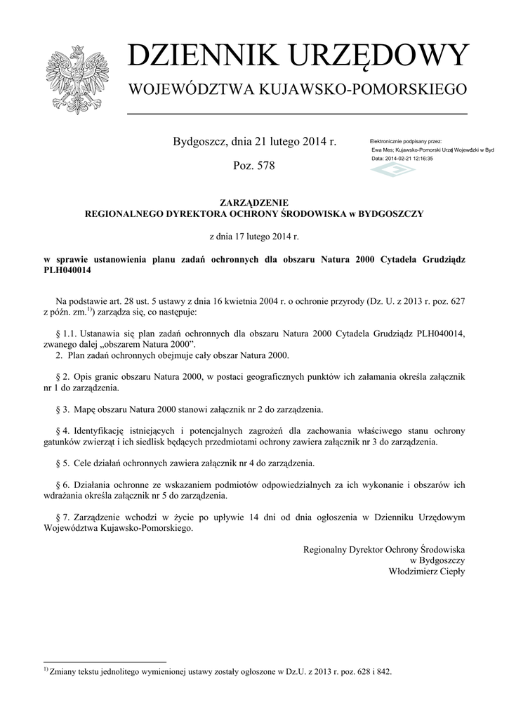 DZIENNIK URZĘDOWY WOJEWÓDZTWA KUJAWSKO-POMORSKIEGO Bydgoszcz, dnia 21 lutego 2014 r. Elektronicznie podpisany przez: Ewa Mes; Kujawsko-Pomorski Urząd Wojewódzki w Bydgoszcz Data: 2014-02-21 12:16:35 Poz. 578 ZARZĄDZENIE REGIONALNEGO DYREKTORA OCHRONY ŚRODOWISKA w BYDGOSZCZY z dnia 17 lutego 2014 r. w sprawie ustanowienia planu zadań ochronnych dla obszaru Natura 2000 Cytadela Grudziądz PLH040014 Na podstawie art. 28 ust. 5 ustawy z dnia 16 kwietnia 2004 r. o ochronie przyrody (Dz. U. z 2013 r. poz. 627 z późn. zm.1)) zarządza się, co następuje: § 1.1. Ustanawia się plan zadań ochronnych dla obszaru Natura 2000 Cytadela Grudziądz PLH040014, zwanego dalej „obszarem Natura 2000”. 2. Plan zadań ochronnych obejmuje cały obszar Natura 2000. § 2. Opis granic obszaru Natura 2000, w postaci geograficznych punktów ich załamania określa załącznik nr 1 do zarządzenia. § 3. Mapę obszaru Natura 2000 stanowi załącznik nr 2 do zarządzenia. § 4. Identyfikację istniejących i potencjalnych zagrożeń dla zachowania właściwego stanu ochrony gatunków zwierząt i ich siedlisk będących przedmiotami ochrony zawiera załącznik nr 3 do zarządzenia. § 5. Cele działań ochronnych zawiera załącznik nr 4 do zarządzenia. § 6. Działania ochronne ze wskazaniem podmiotów odpowiedzialnych za ich wykonanie i obszarów ich wdrażania określa załącznik nr 5 do zarządzenia. § 7. Zarządzenie wchodzi w życie po upływie 14 dni od dnia ogłoszenia w Dzienniku Urzędowym Województwa Kujawsko-Pomorskiego. Regionalny Dyrektor Ochrony Środowiska w Bydgoszczy Włodzimierz Ciepły 1) Zmiany tekstu jednolitego wymienionej ustawy zostały ogłoszone w Dz.U. z 2013 r. poz. 628 i 842. Dziennik Urzędowy Województwa Kujawsko-Pomorskiego –2– Poz. 578 załącznik nr 1 do zarządzenia Regionalnego Dyrektora Ochrony Środowiska w Bydgoszczy z dnia 17 lutego 2014 r. Opis granic obszaru Natura 2000 w postaci geograficznych punktów ich załamania Granicę obszaru Natura 2000 opisuje warstwa wektorowa shp obejmująca współrzędne geograficzne punktów załamania granic (PL-1992), które posiadają następujące wartości: Dziennik Urzędowy Województwa Kujawsko-Pomorskiego –3– Poz. 578 załącznik nr 2 do zarządzenia Regionalnego Dyrektora Ochrony Środowiska w Bydgoszczy z dnia 17 lutego 2014 r. Mapa obszaru Natura 2000 Dziennik Urzędowy Województwa Kujawsko-Pomorskiego –4– Poz. 578 załącznik nr 3 do zarządzenia Regionalnego Dyrektora Ochrony Środowiska w Bydgoszczy z dnia 17 lutego 2014 r. Identyfikacja istniejących i potencjalnych zagrożeń dla zachowania właściwego stanu ochrony gatunków zwierząt i ich siedlisk będących przedmiotami ochrony Lp. Przedmiot ochrony Zagrożenia Opis zagrożenia istniejące potencjalne 1. 1308 mopek Barbastella barbastellus G05.04 wandalizm B02.02 wycinka lasu; E01.03 zabudowa rozproszona; M01.01 zmiana temperatury (np. wzrost temperatury i temperatur skrajnych); E06.02 odbudowa, remont budynków; F03.02.03 chwytanie, trucie, kłusownictwo; G01.08 inne rodzaje sportu i aktywnego wypoczynku; G05.01 wydeptywanie, nadmierne użytkowanie Istniejącym zagrożeniem w całym obszarze jest wandalizm, który obecnie zaznacza się w części niezabezpieczonej obszaru tzn. w obrębie dzieła rogowego na obszarze podmiejskim. Potencjalne zagrożenie stanowi wycinka lasu, zadrzewień i zakrzewień (w tym również samosiewów) na terenie obszaru oraz presja ze strony zabudowy rozproszonej na tym obszarze, powodujące pogorszenie warunków migracji nietoperzy. Niekorzystne zmiany mikroklimatu (w szczególności gwałtowne) wiążą się z pogorszeniem warunków zimowania - hibernacji nietoperzy. Remonty budynków (oraz związana z tym możliwa zmiana użytkowania) stanowią zagrożenie w przypadku nieuwzględnienia biologii gatunku oraz konieczności zachowania schronień zimowych. Jednocześnie zagrożeniem nie są prace mające na celu utrzymanie obecnego stanu technicznego (uwzględniające występowanie gatunku i zachowanie schronień). Potencjalnym zagrożeniem (związanym z wandalizmem) jest chwytanie oraz zabijanie osobników nietoperzy. Potencjalne zagrożenie stanowić może również niekontrolowana lub intensywna turystyka (zwiedzanie korytarzy zajmowanych przez zimujące nietoperze) w okresie hibernacji. 2. 1318 nocek łydkowłosy Myotis dasycneme G05.04 wandalizm B02.02 wycinka lasu; E01.03 zabudowa rozproszona; M01.01 zmiana temperatury (np. wzrost temperatury i temperatur skrajnych); E06.02 odbudowa, remont budynków; F03.02.03 chwytanie, trucie, kłusownictwo; G01.08 inne rodzaje sportu i aktywnego wypoczynku; G05.01 wydeptywanie, nadmierne użytkowanie Istniejącym zagrożeniem w całym obszarze jest wandalizm, który obecnie zaznacza się w części niezabezpieczonej obszaru tzn. w obrębie dzieła rogowego na obszarze podmiejskim. Potencjalne zagrożenie stanowi wycinka lasu, zadrzewień i zakrzewień (w tym również samosiewów) na terenie obszaru oraz presja ze strony zabudowy rozproszonej na tym obszarze, powodujące pogorszenie warunków migracji nietoperzy. Niekorzystne zmiany mikroklimatu (w szczególności gwałtowne) wiążą się z pogorszeniem warunków zimowania - hibernacji nietoperzy. Remonty budynków (oraz związana z tym możliwa zmiana użytkowania) stanowią zagrożenie w przypadku nieuwzględnienia biologii gatunku oraz konieczności zachowania schronień zimowych. Jednocześnie zagrożeniem nie są prace mające na celu utrzymanie obecnego stanu technicznego (uwzględniające występowanie gatunku i zachowanie schronień). Potencjalnym zagrożeniem (związanym z wandalizmem) jest chwytanie oraz zabijanie osobników nietoperzy. Potencjalne zagrożenie stanowić może również niekontrolowana lub intensywna turystyka (zwiedzanie korytarzy zajmowanych przez zimujące nietoperze) w okresie hibernacji. 3. 1324 nocek duży Myotis myotis G05.04 wandalizm B02.02 wycinka lasu; E01.03 zabudowa rozproszona;
