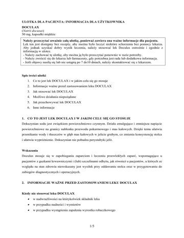 ULOTKA DLA PACJENTA: INFORMACJA DLA UŻYTKOWNIKA DOCULAX (Natrii docusas) 50 mg, kapsułki miękkie Należy przeczytać uważnie całą ulotkę, ponieważ zawiera ona ważne informacje dla pacjenta. Lek ten jest dostępny bez recepty, aby można było leczyć niektóre schorzenia bez pomocy lekarza. Aby jednak uzyskać dobry wynik leczenia, należy stosować lek Doculax ostrożnie i zgodnie z informacją w ulotce. - Należy zachować tę ulotkę, aby można ją było przeczytać ponownie w razie potrzeby. - Należy zwrócić się do lekarza lub farmaceuty, gdy potrzebna jest rada lub dodatkowa informacja. - Jeśli objawy nasilą się lub nie ustąpią po 7 do10 dniach, należy skontaktować się z lekarzem. Spis treści ulotki 1. Co to jest lek DOCULAX i w jakim celu się go stosuje 2. Informacje ważne przed zastosowaniem leku DOCULAX 3. Jak stosować lek DOCULAX 4. Możliwe działania niepożądane 5. Jak przechowywać lek DOCULAX 6. Inne informacje 1. CO TO JEST LEK DOCULAX I W JAKIM CELU SIĘ GO STOSUJE Dokuzynian sodu jest związkiem powierzchniowo czynnym. Działa emulgująco i zmniejsza napięcie powierzchniowe na granicy nabłonka przewodu pokarmowego i mas kałowych. Dzięki temu ułatwia przenikanie wody i tłuszczów w głąb mas kałowych w jelicie grubym, co zmienia konsystencję stolca i ułatwia wypróżnienie. Dokuzynian nie pobudza perystaltyki jelit. Wskazania Doculax stosuje się w zapobieganiu zaparciom i leczeniu przewlekłych zaparć, wspomagająco u pacjentów z guzkami krwawniczymi i (lub) szczelinami odbytu, jak również u pacjentów, u których ze względu na stan zdrowia niewskazany jest wysiłek przy oddawaniu stolca oraz w przygotowaniu do zabiegów diagnostycznych i operacyjnych. 2. INFORMACJE WAŻNE PRZED ZASTOSOWANIEM LEKU DOCULAX Kiedy nie stosować leku DOCULAX w nadwrażliwości na którykolwiek składnik leku w przypadku nudności i wymiotów w przypadku wystąpienia zapalenia wyrostka robaczkowego 1/5 w przypadku wystąpienia niedrożności jelit oraz stanów zagrażających wystąpieniem niedrożności jelit (nagromadzenie mas kałowych, zapalenie jelit, zwężenie jelit, zrosty otrzewnowe, przepukliny, polipy, guzy) w razie ostrego bólu o nieznanej przyczynie w jamie brzusznej w przypadku krwawienia z przewodu pokarmowego o nieznanej przyczynie w przypadku stanów odwodnienia organizmu (patrz również interakcje). Kiedy zachować szczególną ostrożność stosując lek DOCULAX Długotrwałe stosowanie leku (powyżej 7 do 10 dni) może spowodować przyzwyczajenie na dokuzynian sodu i brak reakcji na leczenie. W przypadku zaobserwowania zaburzeń motoryki jelita grubego (objawiających się jako zmiany nawyków dotyczących wypróżnień, np. częstości oddawania stolca i jego konsystencji), które utrzymują się przez okres dłuższy niż 2 tygodnie, środki przeczyszczające należy stosować ostrożnie i zasięgnąć porady lekarskiej. Chodzi tu zwłaszcza o uniknięcie przeoczenia nowotworu jelit, którego objawem mogą być wspomniane zmiany nawyków. Wystąpienie krwawienia z odbytnicy lub osłabienia naturalnych ruchów jelit (przejawiających się utrudnieniem albo niemożnością oddawania stolca) po zastosowaniu środków przeczyszczających może wskazywać na poważne schorzenie. W takim przypadku należy zaprzestać stosowania leku. Stosowanie leku DOCULAX z innymi lekami Należy powiedzieć lekarzowi o wszystkich przyjmowanych ostatnio lekach, również tych, które wydawane są bez recepty. Leku nie należy stosować z: - olejem mineralnym (parafiną ciekłą), ponieważ ich jednoczesne stosowanie może powodować nasilenie odkładania się oleju mineralnego w węzłach chłonnych, błonie śluzowej jelita, w wątrobie i śledzionie; może to powodować przewlekłe zapalenie tych narządów oraz dodatkowo naciekanie komórek wątroby - dantronem, ponieważ lek zwiększa wchłanianie dantronu powodując wzrost jego toksyczności, co może prowadzić do uszkodzenia wątroby - droperidolem, ze względu na ryzyko kardiotoksyczności (uszkodzenie mięśnia sercowego) - lewometadonem, ponieważ ich jednoczesne stosowanie może prowadzić do poważnych zaburzeń rytmu serca - glikozydami naparstnicy, ze względu na możliwość nasilenia ich działania kardiotoksycznego, poprzez obniżenie stężenia potasu w surowicy krwi - kortykosteroidami, ponieważ dokuzynian nasila ich działanie obniżające stężenie potasu; interakcja ta może zajść dopiero przy długotrwałym stosowaniu obu leków 2/5 - kwasem acetylosalicylowym, ponieważ ich jednoczesne stosowanie może nasilać działanie niepożądane kwasu acetylosalicylowego na błonę śluzową przewodu pokarmowego - tetracyklinami, ponieważ dokuzynian zmniejsza biodostępność antybiotyków z tej grupy - lekami moczopędnymi, ponieważ długotrwałe, równoczesne stosowanie może powodować nasilenie utraty potasu lub osłabienie działania oszczędzającego potas leków moczopędnych, z takim mechanizmem działania. Stosowanie leku DOCULAX u dzieci Lek jest zalecany dla dzieci powyżej 6 lat. Ciąża i karmienie piersią Przed zastosowaniem każdego leku należy poradzić się lekarza. Lek może być stosowany w ciąży jedynie w przypadkach, gdy w opinii lekarza korzyść dla matki przeważa nad potencjalnym ryzykiem dla płodu. Dokuzynian sodu przenika do mleka matki i dlatego nie zaleca się stosowania leku przez kobiety karmiące piersią. Prowadzenie pojazdów i obsługa maszyn Nie przeprowadzono badań nad wpływem leku na zdolność prowadzenia pojazdów mechanicznych i obsługiwania urządzeń mechanicznych w ruchu. Ważne informacje o niektórych składnikach leku DOCULAX Lek zawiera sorbitol. Jeśli u pacjenta stwierdzono nietolerancję niektórych cukrów, to przed przyjęciem leku należy skontaktować się z lekarzem. 3. JAK STOSOWAĆ LEK DOCULAX W razie wątpliwości związanych ze stosowaniem leku należy zwrócić się do lekarza lub farmaceuty. Lek stosuje się do