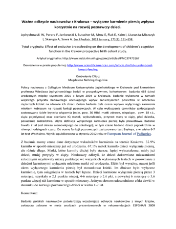 Ważne odkrycie naukowców z Krakowa – wyłączne karmienie piersią wpływa korzystnie na rozwój poznawczy dzieci. Jędrychowski W, Perera F, Jankowski J, Butscher M, Mroz E, Flak E, Kaim I, Lisowska-Miszczyk I, Skarupa A, Sowa A. Eur J Pediatr. 2012 January; 171(1): 151–158. Tytuł oryginału: Effect of exclusive breastfeeding on the development of children's cognitive function in the Krakow prospective birth cohort study. Artykuł oryginalny: http://www.ncbi.nlm.nih.gov/pmc/articles/PMC3747316/ Doniesienia w prasie popularnej: http://www.scientificamerican.com/article.cfm?id=surety-bondbreast-feeding Omówienie CNoL: Magdalena Nehring-Gugulska Polscy naukowcy z Collegium Medicum Uniwersytetu Jagiellońskiego w Krakowie pod kierunkiem profesora Wiesława Jędrychowskiego badali w prospektywnym, kohortowym badaniu 468 dzieci urodzonych między styczniem 2001 a lutym 2004 w Krakowie. Badanie wykonano w ramach większego projektu badawczego oceniającego wpływ zanieczyszczeń powietrza w otoczeniu ciężarnych kobiet na zdrowie ich dzieci. Celem badania była ocena wpływu wyłącznego karmienia mlekiem kobiecym na rozwój funkcji poznawczych. W celu wykluczenia czynników zakłócających zastosowano ścisłe kryteria włączenia (m.in. pow. 36 HBd, matki zdrowe, niepalące, pow. 18 r.ż., ciąża pojedyncza) oraz oceniano IQ matek, wykształcenie, przyrost masy w ciąży, płeć dziecka, posiadanie rodzeństwa. Użyta definicja wyłącznego karmienia piersią była prawidłowa. Badanie trwało 7 lat (od okresu niemowlęcego do szkolnego), w tym czasie badano dzieci pięciokrotnie w równych odstępach czasu. Do oceny funkcji poznawczych zastosowano test Bayleya, a w wieku 6-7 lat test Wechslera. Wyniki opublikowano w styczniu 2012 roku w European Journal of Pediatrics. Z badania mamy cenne dane dotyczące wskaźników karmienia na terenie Krakowa. 32.9% karmiło w sposób mieszany już od urodzenia. 67.1% matek karmiło dzieci wyłącznie piersią, ale różnie długo. Matki, które karmiły dłużej były starsze, lepiej wykształcone, miały już dzieci, mniej przytyły w ciąży. Naukowcy odkryli, że dzieci dokarmiane mieszankami sztucznymi uzyskiwały niższą punktację we wszystkich wykonanych testach w porównaniu z dziećmi karmionymi wyłącznie mlekiem matki od urodzenia. Efekt był wyraźny, nawet jeśli okres wyłącznego karmienia piersią był stosunkowo krótki. Im dłuższe było wyłączne karmienie, tym osiągnięcia w testach był lepsze. Dzieci karmione wyłącznie piersią przez 3 miesiące, uzyskały o 2,1 punktu więcej, 4-6 miesięcy o 2,6 pkt, a powyżej 6 miesięcy o 3,6 punktu więcej niż karmione w sposób mieszany. Jednym słowem udowodniono efekt dawki w stosunku do rozwoju poznawczego dzieci w wieku 1-7 lat. Komentarz: Badania polskich naukowców potwierdzają wcześniejsze odkrycia naukowców z innych krajów, zwłaszcza zebrane w meta analizach prezentowanych w rekomendacjach ESPGHAN 2009 (http://kobiety.med.pl/cnol/images/cnol/Publikacje/espghan.pdf) lub (http://kobiety.med.pl/cnol/images/cnol/Publikacje/Stanowisko%20AAP.pdf). AAP 2012 Wiele znanych nam badań dotyczyło jednak dzieci urodzonych przedwcześnie, tu mamy kohortę dzieci urodzonych po 36 tygodniu ciąży. Grupą kontrolną są dzieci, które dostają mleko matki, ale są dokarmiane mieszanką. I ta „niewyłączność” skutkuje pogorszeniem wyników w testach. Większość znanych doniesień porównywało grupy karmione piersią i karmione sztucznie (np. Andersona i wsp.) Tym bardziej cenne wydaje się badanie krakowskie. Ostatnie doniesienie na temat istoty białej są tylko biologiczno-chemicznym wyjaśnieniem jednej z przyczyn takiego stanu rzeczy. Wykazano, że karmienie wyłącznie mlekiem matki jest pozytywnie skorelowane z intensywnym rozwojem struktury istoty białej, lepszymi umiejętnościami językowymi, percepcją wizualną i kontrolą motoryczną. Pomimo, że mechanizm pozostaje nieznany, wiemy, że mleko matki jest bogate w długołańcuchowe kwasy tłuszczowe (kwas dokozahexaenowy DHA i arachidonowy AA, które przyspieszają mielinizację neuronów i wzrost istoty białej. Mieszanka zawiera tylko substancje - prekursory powyższych kwasów (Reoni SCL, Dean DC, Piryatinsky I et al (2013) Breastfeeding and early white matter development: A cross-sectional study. Neurolmage. 82. 77-86, CNoLNews, grudzień 2013) W okresie tak intensywnego rozwoju mózgu jakim jest okres noworodkowy i niemowlęcy, gdy mózg prawie podwaja swoją masę, a wzrost dotyczy głównie istoty białej, należy dostarczać dziecku najlepszej substancji odżywiającej tkankę – MLEKO MATKI. Profesor Wiesław Jędrychowski – emerytowany profesor zwyczajny, członek korespondent Polskiej Akademii Umiejętności, były wieloletni kierownik Katedry Epidemiologii i Medycyny Zapobiegawczej Uniwersytetu Jagiellońskiego i Collegium Medicum w Krakowie, założyciel Polskiego Towarzystwa Epidemiologii Środowiskowej, autor wielu publikacji z zakresu epidemiologii chorób przewlekłych układu oddechowego u dzieci i dorosłych oraz chorób nowotworowych przewodu pokarmowego.
