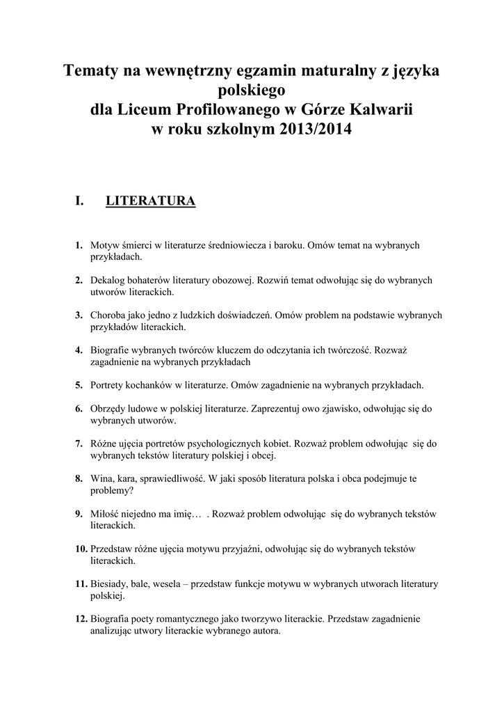 Tematy na wewnętrzny egzamin maturalny z języka polskiego dla Liceum Profilowanego w Górze Kalwarii w roku szkolnym 2013/2014 I. LITERATURA 1. Motyw śmierci w literaturze średniowiecza i baroku. Omów temat na wybranych przykładach. 2. Dekalog bohaterów literatury obozowej. Rozwiń temat odwołując się do wybranych utworów literackich. 3. Choroba jako jedno z ludzkich doświadczeń. Omów problem na podstawie wybranych przykładów literackich. 4. Biografie wybranych twórców kluczem do odczytania ich twórczość. Rozważ zagadnienie na wybranych przykładach 5. Portrety kochanków w literaturze. Omów zagadnienie na wybranych przykładach. 6. Obrzędy ludowe w polskiej literaturze. Zaprezentuj owo zjawisko, odwołując się do wybranych utworów. 7. Różne ujęcia portretów psychologicznych kobiet. Rozważ problem odwołując się do wybranych tekstów literatury polskiej i obcej. 8. Wina, kara, sprawiedliwość. W jaki sposób literatura polska i obca podejmuje te problemy? 9. Miłość niejedno ma imię… . Rozważ problem odwołując się do wybranych tekstów literackich. 10. Przedstaw różne ujęcia motywu przyjaźni, odwołując się do wybranych tekstów literackich. 11. Biesiady, bale, wesela – przedstaw funkcje motywu w wybranych utworach literatury polskiej. 12. Biografia poety romantycznego jako tworzywo literackie. Przedstaw zagadnienie analizując utwory literackie wybranego autora. 13. Walka dobra ze złem. Na podstawie wybranych przykładów przedstaw literackie ujęcia tego tematu. 14. Motyw rewolucji w literaturze. Omów problem, odwołując się do wybranych utworów. 15. Różne wizje przyszłości zawarte w literaturze fantastycznonaukowej. Scharakteryzuj je, analizując wybrane powieści. 16. Rola motywów ludowych w literaturze romantycznej i młodopolskiej. Omów problem na wybranych przykładach. 17. Różne ujęcia motywu przemiany wewnętrznej człowieka. Omów zagadnienie odwołując się do wybranych przykładów literackich różnych epok. 18. Motywy tyrtejskie w literaturze polskiej różnych epok. Omów na wybranych przykładach. 19. Losy polskiego emigranta jako temat literatury romantycznej i współczesnej. Przedstaw problem na wybranych przykładach. 20. Młodzi bohaterowie, ich pasje, dążenia, rozterki i klęski. Omów temat na wybranych przykładach literackich. 21. Motyw kraju lat dziecinnych w literaturze. Zaprezentuj temat w oparciu o wybrane przykłady literackie. 22. Różne ujęcia tematu samotności człowieka w literaturze. Przedstaw problem na wybranych przykładach literackich. 23. Różne kreacje ludzi sprawujących władzę. Omów problem, odwołując się do wybranych dzieł. 24. Historia jako temat i jako pretekst w polskiej epice XIX i XX wieku. Przeanalizuj problem odwołując się do wybranych utworów literackich. 25. „Tyle o sobie wiemy, ile nas sprawdzono” napisała W. Szymborska. Przedstaw Twoje refleksje w odniesieniu do wybranych bohaterów literackich stojących w obliczu próby. 26. Postawy ludzi wobec cierpienia w literaturze polskiej i obcej. Omów zagadnienie na wybranych przykładach. 27. Motyw rycerza – żołnierza w literaturze. Omów problem analizując wybrane utwory z trzech epok. 28. „Aby istnieć człowiek musi się buntować” ( A. Camus). Przedstaw źródła i sens buntu wybranych bohaterów literatury. 29. Różne sposoby kreowania bohatera. Rozważ zagadnienie na przykładzie tekstów dwóch dowolnych epok literackich. 30. Motyw zbrodni i zbrodniarza. Omów temat w oparciu o wybrane przykłady literackie XIX i XX wieku. 31. Duchy, zjawy, sny, wizje…. Omów ich rolę i znaczenie w wybranych utworach. 32. Różne modele rodziny utworach literackich. Omów temat w oparciu wybrane przykłady. 33. Na przykładzie wybranych utworów przedstaw funkcjonowanie motywu dziecka w literaturze. 34. Oblicza samotności w literaturze. Przedstaw problem, odwołując się do wybranych utworów. 35. Portrety Żydów polskich w literaturze. Przedstaw różnorodność ujęcia postaci w wybranych dziełach. 36. Przedstaw literacki obraz miasta w wybranych utworach XIX i XX wieku. 37. Wędrówką jest życie człowieka – omów funkcje motywu wędrówki w wybranych utworach literackich. 38. Bunt i pokora jako sposoby zachowań człowieka wobec Boga. Przedstaw je na przykładzie wybranych utworów literackich. 39. Wady narodowe Polaków w literaturze różnych epok . Omów problem w oparciu o wybrane utwory. 40. Porównaj literackie wizje Kresów w wybranych utworach literackich. II. ZWIĄZKI LITERATURY Z INNYMI DZIEDZINAMI SZTUKI 1. Literatura i film wobec Holocastu. Rozwiń temat, odwołując się do wybranych przykładów. 2. W wybranych przykładach przedstaw różne sposoby ujęcia motywu wiosny w dziełach literackich i plastycznych. 3. Temat powstania styczniowego w literaturze i malarstwie. Omów problem na wybranych przykładach. 4. Różne sposoby kreacji bohatera – karierowicza w literaturze i filmie. Omów zagadnienie na wybranych przykładach. 5. Przedstaw funkcjonowanie i rolę motywu ojca w utworach literackich i tekstach kultury. 6. Motyw walki ze złem w literaturze fantasy i jej filmowej interpretacji. Omów temat odwołując się do wybranych przykładów tego gatunku. 7. Szlachecki dworek w literaturze i malarstwie. Porównaj funkcjonowanie motywu. 8. Symbolizm w sztukach plastycznych i literaturze. Porównaj środki obrazowania w różnych tekstach kultury. 9. Sposoby kreowania postaci kobiecych w literaturze i malarstwie. Rozważ problem odwołując się do wybranych przykładów literackich i plastycznych. 10. Literackie i fotograficzne świadectwa czasu wojny. Zaprezentuj i porównaj wartości poznawcze interpretowanych przykładów faktu i zdjęć. 11. Koncepcje piękna w literaturze, malarstwie i architekturze. Zanalizuj wybrane dzieła. 12. Wielcy buntownicy – bohaterowie literatury i filmu – co było przyczyną ich buntu, co było ich konsekwencją – omów w oparciu o