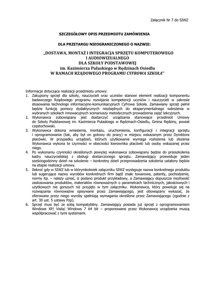 Załącznik Nr 7 do SIWZ SZCZEGÓŁOWY OPIS PRZEDMIOTU ZAMÓWIENIA DLA PRZETARGU NIEOGRANICZONEGO O NAZWIE: „DOSTAWA, MONTAŻ I INTEGRACJA SPRZĘTU KOMPUTEROWEGO I AUDIOWIZUALNEGO DLA SZKOŁY PODSTAWOWEJ im. Kazimierza Pułaskiego w Rędzinach Osiedlu W RAMACH RZĄDOWEGO PROGRAMU CYFROWA SZKOŁA’’ Informacje dotyczące realizacji przedmiotu umowy: 1. Zakupiony sprzęt dla szkoły, nauczycieli oraz uczniów stanowi element realizacji komponentu badawczego Rządowego programu rozwijania kompetencji uczniów i nauczycieli w zakresie stosowania technologii informacyjno-komunikacyjnych Cyfrowa Szkoła. Zamawiany sprzęt pełnił będzie funkcję pomocy dydaktycznych niezbędnych do eksperymentalnego wdrożenia w wybranych szkołach innowacyjnych scenariuszy metodycznych prowadzenia zajęć lekcyjnych. 2. Wykonawca zobowiązany jest dostarczyć urządzania stanowiące przedmiot Umowy do Szkoły Podstawowej im. Kazimierza Pułaskiego w Rędzinach-Osiedlu, Gmina Rędziny, powiat częstochowski. 3. Wykonawca dokona wniesienia, montażu, uruchomienia, konfiguracji i integracji sprzętu i oprogramowania (tak, aby był on gotowy do pracy) w miejscu wskazanym przez Dyrektora placówki. W przypadku urządzeń, których użytkowanie wymaga rozłożenia lub złożenia Wykonawca wykona te czynności w obecności kierownika placówki lub osoby wskazanej przez niego. 4. Po wykonaniu czynności określonych powyżej wykonawca zobowiązany będzie do przeszkolenia kadry nauczycielskiej z obsługi dostarczonego sprzętu. Zamawiający przewiduje jeden sześciogodzinny dzień na szkolenie – konkretny dzień przeprowadzenia szkolenia ustalony będzie na etapie realizacji umowy. 5. Ilekroć gdy w SIWZ lub w którymkolwiek załączniku SIWZ występuje nazwa konkretnego produktu lub sugerujące nazwy wyrobów konkretnych firm bądź znaki towarowe, patenty, pochodzenie, normy itp. – należy uznać, iż podano produkt przykładowy, a Zamawiający dopuszcza możliwość zastosowania produktów, materiałów równoważnych o parametrach technicznych, jakościowych i użytkowych nie gorszych niż przyjęto w tym załączniku. Wykonawca, który powołuje się na rozwiązania równoważne opisywane przez Zamawiającego, jest obowiązany wykazać, że oferowane przez niego wyroby spełniają wymagania określone przez Zamawiającego (zgodnie z art. 30 ust. 5 ustawy Pzp). 6. Sprzęt musi być ze sobą kompatybilny. Zamawiający posiada już sprzęt z oprogramowaniem Windows XP/ Vista/ Windows 7 64 bit – proponowane przez Wykonawcę urządzenia muszą współpracować z tymi systemami. Zestawienie sprzętu: Część I – dostawa komputerów przenośnych (laptopów) i urządzeń sieciowych I. Komputer przenośny dla nauczyciela (2 szt.) Nazwa Lp. Wymagane przez zamawiającego parametry minimalne komponentu 1 Procesor 2 Chipset 3 Pamięć operacyjna RAM 4 Ekran 5 Karta graficzna Wyjścia karty graficznej Dysk twardy 6 7 8 9 Napęd optyczny Czytnik kart pamięci Dedykowany do pracy w komputerach przenośnych, architektura 64 bity, wielordzeniowy. Procesor ma osiągnąć ponad 2200 punktów w teście Single CPU Systems w kategorii Passmark CPU Mark, według wyników opublikowanych na stronie http://www.cpubenchmark.net/cpu_list.php.. Dostosowany do zaproponowanego procesora Minimum 4 GB DDR3 (1600 MHz) (pamięć RAM rozszerzalna do 8 GB) Wielkość matrycy co najmniej 15.6”, panoramiczna z powłoką antyrefleksyjną, matowa typu non-glare, podświetlanie LED Zintegrowana lub zewnętrzna Obowiązkowo wyjście HDMI, D-Sub opcjonalnie DisplayPort Minimum 500 GB, SATA DVD+/-RW 3w1 SD, SDHC, SDXC WiFi IEEE 802.11b/g/n 10 Interfejsy Komunikacyjne 12 Interfejsy zewnętrzne Kamera 13 Dźwięk 14 Bateria 15 Klawiatura i mysz 16 System operacyjny 11 17 Pakiet biurowy Gigabit Ethernet LAN 10 / 100 / 1 000 Co najmniej 2xUSB 2.0 i 2xUSB 3.0, wyjście słuchawkowe, wejście mikrofonowe Zintegrowana, kolorowa o rozdzielczości co najmniej 0.3 Mpix Zintegrowana karta muzyczna stereo, zintegrowane głośniki stereo, wbudowany mikrofon Praca na baterii minimum 3 godziny, ładowarka lub zasilacz w zestawie. Zaimplementowane funkcje oszczędzania energii Klawiatura QWERTY bez dodatkowych znaków diakrytycznych lub ze znakami dla języka polskiego. Wbudowany Touchpad. Dodatkowo mysz zewnętrzna optyczna z dwoma przyciskami i kółkiem przewijania. - Microsoft Windows 7 Home Premium PL 64Bit SP1 (preferowany system operacyjny ze względu na pełną integralność z istniejącą siecią komputerową szkoły) Microsoft Office 2010 Standard licencja MOLP Edu na 29 stanowisk (obejmuje komputery dla uczniów i nauczycieli), (z oprogramowaniem Word, Excel, Outlook, PowerPoint), zamawiający nie dopuszcza licencji typu OEM, lub inne równoważne spełniające wymagania opisane w SIWZ 18 Dodatkowe oprogramowanie 19 Waga 20 21 Warunki gwarancji Certyfikaty i standardy - oprogramowanie antywirusowe (zapewniający ochronę przed wirusami, trojanami, spamem, hakerami oraz innymi zagrożeniami płynącymi z Internetu. Aktualizacja baz przez 3 lata, licencja ważna 3 lata) - oprogramowanie zabezpieczające komputer w przypadku kradzieży, - oprogramowanie do zarządzania zestawem przenośnych komputerów dla potrzeb przeprowadzania zajęć lekcyjnych typu eKlasa - oprogramowanie zabezpieczające uczniów przed dostępem do treści niepożądanych w rozumieniu art. 4a ustawy z dnia 07 września 1991 r. o systemie oświaty, np. „Opiekun ucznia w Internecie” z baterią: maksymalnie 2,5 kg Gwarancja 36 miesięcy deklaracja zgodności CE certyfikat ISO 9001 dla producenta sprzętu 22 23 Efektywność energetyczna Urządzenie musi wypełniać warunki Energy Star 5.0. Dodatkowe dołączony nośnik ze sterownikami W przypadku, gdy zaoferowany sprzęt nie jest oznaczony logo ENERGY STAR, należy wykazać, że przeszedł on równoważne testy energetyczne. II. Komputer przenośny dla ucznia (27 szt.) Nazwa Lp. Wymagane przez zamawiającego parametry mini
