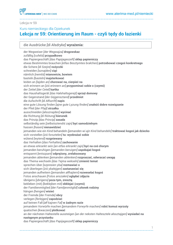 www.aterima-med.pl/niemiecki Lekcja nr 59 Kurs niemieckiego dla Opiekunek Lekcja nr 59: Orientierung im Raum - czyli tędy do łazienki die Ausdrücke [di Ałsdryke] wyrażenia: der Wegweiser [der Wegwajza] drogowskaz zufällig [cufeliś] przypadkowo das Papiergeschäft [das Papijageszeft] sklep papierniczy etwas Bestimmtes brauchen [etfas Besztymtes brałchen] potrzebować czegoś konkretnego die Schere [di Szejre] nożyczki schneiden [sznajden] ciąć nämlich [nemliś] mianowicie, bowiem basteln [basteln] majsterkować leiden an [lajden an] chorować na, cierpieć na sich erinnern an [ziś erinnern an] przypominać sobie o (czymś) der Zettel [der Cetel] kartka das Haushaltsgerät [das Hałshaltsgerejt] sprzęt domowy der Gegenstand [der Gejgensztand] przedmiot die Aufschrift [di Ałfszrift] napis eine gute Lösung finden [ajne gute Lyzung finden] znaleźć dobre rozwiązanie der Pfeil [der Pfajl] strzałka ausschneiden [ałssznajden] wycinać die Richtung [di Riśtung] kierunek das Prinzip [das Princip] zasada selbständig sein [zelbstsztendiś zajn] być samodzielnym hassen [hasen] nienawidzieć jemanden wie ein Kind behandeln [jemanden wi ajn Kind behandeln] traktować kogoś jak dziecko sich vorstellen [ziś forsztelen] tu: wyobrażać sobie wütend [wytend] rozgniewany das Verhalten [das Ferhalten] zachowanie an etwas erkrankt sein [an etfas erkrankt zajn] być na coś chorym jemanden beruhigen [jemanden beruigen] uspokajać kogoś entspannt [entszpant] odprężony, zrelaksowany jemanden ablenken [jemanden ablenken] rozpraszać, odwracać uwagę das Thema wechseln [das Tejma wekseln] zmienić temat sprechen über [szpresien yba] rozmawiać o sich überlegen [ziś ybalejgen] zastanawiać się jemanden aufheitern [jemanden ałfhajtern] rozweselać kogoś Fotos anschauen [Fotos anszałen] oglądać zdjęcia übrigens [ybrigens] poza tym, zresztą bekleben (mit) [beklejben mit] obklejać (czymś) der Familienmitglied [der Familjenmitglid] członek rodziny hängen [hengen] wisieć der Fremde [der Fremde] obcy verlegen [ferlejgen] zapodziać auf keinen Fall [ałf kajnen Fal] w żadnym razie jemandem Vorwürfe machen [jemandem Forwyrfe machen] robić komuś wyrzuty quatschen [kwaczen] plotkować an der nächsten Haltestelle aussteigen [an der neksten Haltesztele ałssztajgen] wysiadać na następnym przystanku das Papiergeschäft [das Papijageszeft] sklep papierniczy 1 www.aterima-med.pl/niemiecki der Pinsel [der Pinzel] pędzel der Klebstoff [der Klebsztof] klej der Tacker [der Taker] zszywacz die Heftklammer [di Heftklama] zszywka der Kugelschreiber/ Kuli [der Kugleszrajber/ Kuli] długopis der Bleistift [der Baljsztyft] ołówek der Buntstift [der Buntschtyft] kredka das Lienal [das Lineal] linijka der Textmarker [der Tekstmarka] marker der Markierstift [der Markirsztyft] zakreślacz der Spitzer [der Szpica] temperówka das Zeichenblock /Zeichenheft [das Zajsienblok/Cajsienheft] blok rysunkowy die Knetmasse [di Knetmase] plastelina die Modelliermasse [di Modelirmase] modelina der Lehm [der Lejm] glina die Nadel [di Nadel] igła der Faden [der Faden] nitka die Strickwolle [di Sztrikwole] włóczka die Kordonettseide [di Kordonetzajde] kordonek die Nähmaschine [di Nejmaszine] maszyna do szycia das Handarbeitszubehör [das Handarbajts-cubehyr] przybory do robótek ręcznych der Fingerhut [der Fingahut] naparstek die Stecknadel [di Szteknadel] szpilka die Reißzwecke [di Rajs-cweke] pinezka etwas mit einer Reißzwecke anheften [etfas mit Rajs-cweken anhaften] przypinać coś pinezką die Häkelnadel [di Hekelnadel] szydełko der Nagel [der Nagel] gwóźdź der Hammer [der Hama] młotek die Schraube [di Szrałbe] śrubka der Schraubenzieher/Schraubendreher [der Szrałbencija/ Szrałbendreja] śrubokręt der Messschieber [der Mes-sziba] suwmiarka der Draht [der Drat] drut die Wasserwaage [di Wasawage] poziomica die Säge [di Zejge] – piła die Axt [di Akst] siekiera schneiden [sznajden] ciąć ausschneiden [ałssznajden] wycinać etwas schmücken [etfas szmyken] ozdabiać kleben [klejben] kleić malen [malen] malować (np. obraz) ausmalen [ałsmalen] kolorować streichen [sztrajsien] malować (np. ścianę) zeichnen [cajśnen] rysować kneten [kneten] lepić nähen [nejen] szyć anschneiden [ansznajden] doszywać aufschneiden [ałfsznajden] pruć stricken [sztriken] robić na drutach häkeln [hekeln] szydełkować einfädeln [ajnfedeln] nawlekać einschlagen [ajnszlagen] wbijać einschrauben [ajnszrałben] wkręcać eine Schraube anziehen [ajne Szrałbe ancijen] dokręcać śrubkę sägen [zejgen] – piłować messen [mesen] mierzyć 2 www.aterima-med.pl/niemiecki Materiał stanowi własność firmy ATERIMA Sp. z o.o. Sp. K. ul. Puszkarska 7f, 30-644 Kraków. Reprodukcja, rozpowszechnianie lub inne wykorzystywanie całości lub części materiału w jakiejkolwiek formie dla celów innych, niż cele niekomercyjne i osobiste jest zakazane. 3 Powered by TCPDF (www.tcpdf.org)