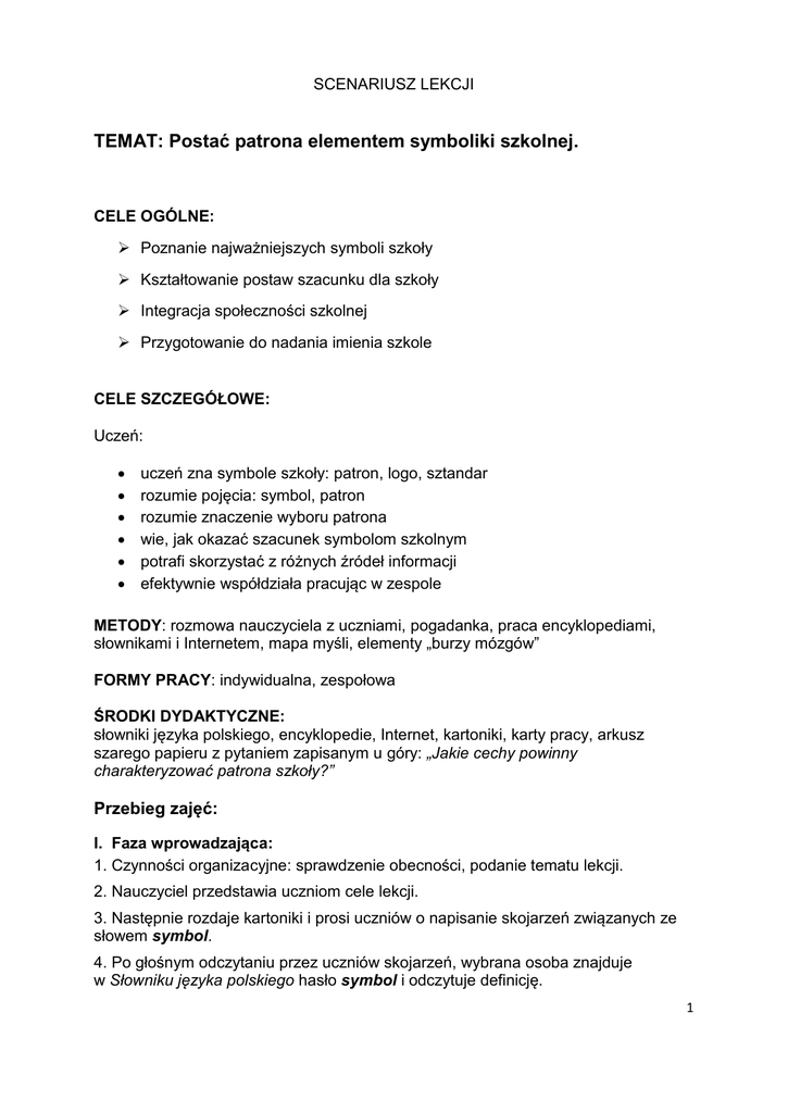 SCENARIUSZ LEKCJI TEMAT: Postać patrona elementem symboliki szkolnej. CELE OGÓLNE: Poznanie najważniejszych symboli szkoły Kształtowanie postaw szacunku dla szkoły Integracja społeczności szkolnej Przygotowanie do nadania imienia szkole CELE SZCZEGÓŁOWE: Uczeń: uczeń zna symbole szkoły: patron, logo, sztandar rozumie pojęcia: symbol, patron rozumie znaczenie wyboru patrona wie, jak okazać szacunek symbolom szkolnym potrafi skorzystać z różnych źródeł informacji efektywnie współdziała pracując w zespole METODY: rozmowa nauczyciela z uczniami, pogadanka, praca encyklopediami, słownikami i Internetem, mapa myśli, elementy „burzy mózgów” FORMY PRACY: indywidualna, zespołowa ŚRODKI DYDAKTYCZNE: słowniki języka polskiego, encyklopedie, Internet, kartoniki, karty pracy, arkusz szarego papieru z pytaniem zapisanym u góry: „Jakie cechy powinny charakteryzować patrona szkoły?” Przebieg zajęć: I. Faza wprowadzająca: 1. Czynności organizacyjne: sprawdzenie obecności, podanie tematu lekcji. 2. Nauczyciel przedstawia uczniom cele lekcji. 3. Następnie rozdaje kartoniki i prosi uczniów o napisanie skojarzeń związanych ze słowem symbol. 4. Po głośnym odczytaniu przez uczniów skojarzeń, wybrana osoba znajduje w Słowniku języka polskiego hasło symbol i odczytuje definicję. 1 Symbol – znak umowny występujący zwykle w formie wizualnej, pełniący funkcję zastępczą wobec pewnego przedmiotu (pojęcia, stanu rzeczy itp.) i przywodzący ów przedmiot na myśl (budzący związane z nim reakcje). II. Faza realizacyjna: 1. Nauczyciel pisze temat lekcji na tablicy, a uczniowie zapisują go w zeszytach. 2. Na podstawie informacji nowo zdobytych oraz już posiadanych, uczniowie formułują własną definicję symbolu, a następnie zapisują ją w zeszytach. 3. Rozmowa z uczniami na temat znanych im symboli. 4. Uczniowie wymieniają polskie symbole narodowe (godło, flaga, hymn). 5. Nauczyciel dzieli klasę na grupy 3-4 osobowe i rozdaje do uzupełnienia mapy myśli (Karta pracy Nr 1). 6. Uczniowie w grupach wypisują wszystkie skojarzenia. Czas 3-4 min. 7. Przedstawiciele poszczególnych grup prezentują wyniki swojej pracy, porównują swoje skojarzenia, a następnie wspólnie ustalają właściwy schemat przedstawiający omawiane zagadnienie. „SZKOŁA TO…”- karta pracy Nr 1 sala gimnastyczna klasy gabinet dyrektora biblioteka jadalnia patron logo sztandar SYMBOLE BUDYNEK LUDZIE uczniowie nauczyciele pracownicy administracyjni np.: dyrektor - p. sekretarka - p. porządkowe - p. kucharki 2 8. Nauczyciel każdemu uczniowi daje do uzupełnienia krzyżówkę (Karta pracy Nr 2). Czas 3-4 min. KRZYŻÓWKA - karta pracy Nr 2 W poziomych rzędach wpisz rozwiązania następujących pojęć: 1) Człowiek kochający swoją Ojczyznę. 2) Typ szkoły w Raszówce. 3) Oszklona szafka do przechowywania eksponatów. 4) Główny uroczysty symbol w obecności którego uczniowie szkoły składają przyrzeczenie. 5) Graficzny symbol, znak rozpoznawczy: organizacji, firmy, szkoły… 6) Uroczysta pieśń patriotyczna. 4. S 1. P A T R I O W A 2. P O D S T A W 3. G A B L O T A Z T A N D A R 5. L O Y M N 6. H G O T A O Hasło: PATRON 9. Uczniowie wyszukują znaczenia następujących haseł w różnych źródłach informacji (słowniki, encyklopedie, Internet): sztandar, logo, patron – praca w grupach. Czas 5 min. 10. Prezentacja wyników pracy grup, np.: Grupa I Sztandar – to chorągiew o odpowiedniej barwie, z wyhaftowanym lub wymalowanym symbolem, stanowiąca znak: państwa, organizacji, szkoły, któremu członkowie danej społeczności winni okazywać szacunek. Grupa II Logo jest znakiem rozpoznawczym organizacji, firmy, szkoły… Należy je eksponować podczas uroczystości, na sztandarze, dyplomach, oficjalnych pismach urzędowych, znaczkach, identyfikatorach itp. Grupa III Definicja hasła „patron” odnosi się do wielu pojęć, a między innymi: - patron – to opiekun, protektor, osoba lub instytucja roztaczająca opiekę - patron – to osoba/postać (zwykle nieżyjąca) darzona wielkim szacunkiem, której imię jest nadawane jakiejś instytucji (szkole, jednostce wojskowej) lub jakiemuś miejscu 3 - patron – symboliczny religijny opiekun kraju, miasta, profesji, obiektu budowlanego, ludzi itp. Wg ks. Jana Twardowskiego „Patron szkoły - to duch opiekuńczy szkoły”. 11. Nauczyciel rozdaje kartoniki i prosi uczniów o napisanie odpowiedzi na pytanie – „Jakie cechy powinny charakteryzować patrona szkoły?” 12. Uczniowie zapisują nazwy cech na kartonikach i kolejno umieszczają je pod pytaniem: „Jakie cechy powinny charakteryzować patrona szkoły?” na planszy zawieszonej na tablicy. Postać patrona powinna być, np.: - opiekuńcza - mądra - darzona wielkim szacunkiem - zasłużona - dawać innym dobry przykład - ………………….. 13. Odczytanie cech patrona i podsumowanie zadania. III. Faza podsumowująca: Podsumowanie wiadomości zdobytych w toku lekcji. Opracowała: Irena Wituszyńska 4