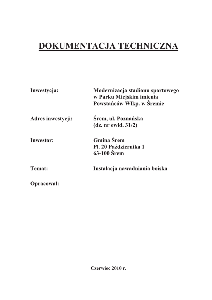 DOKUMENTACJA TECHNICZNA Inwestycja: Modernizacja stadionu sportowego w Parku Miejskim imienia PowstaĔców Wlkp. w ĝremie Adres inwestycji: ĝrem, ul. PoznaĔska (dz. nr ewid. 31/2) Inwestor: Gmina ĝrem Pl. 20 PaĨdziernika 1 63-100 ĝrem Temat: Instalacja nawadniania boiska Opracował: Czerwiec 2010 r. SPIS TREĝCI. 1. ZAKRES OPRACOWANIA. 2. OPIS INSTALACJI. 2.1. SIEû PODZIEMNA. 2.1.1. ZASILANIE. 2.1.2. INSTALACJA ZRASZAJĄCA. 2.2. ZRASZACZE. 2.3. STEROWANIE. 2.4. ZESTAW POMPOWY. 3. ZASADY PRACY SYSTEMU. 4. RYSUNKI I SCHEMATY TECHNICZNE. 2 1. ZAKRES OPRACOWANIA. Inwestycja obejmuje wykonanie instalacji nawadniającej płytĊ główną stadionu sportowego w Parku Miejskim im. PowstaĔców Wlkp. w ĝremie. Zadanie jest czĊĞcią procesu inwestycyjnego polegającego na modernizacji stadionu (obejmującego m.in. wymianĊ nawierzchni boiska, modernizacjĊ trybun i wieĪy sĊdziowskiej). Niniejsza dokumentacja stanowi adaptacjĊ rozwiązania systemowego firmy Rain Bird. 2. OPIS INSTALACJI. 2.1. SIEû PODZIEMNA. 2.1.1. ZASILANIE. Instalacja doprowadzająca wodĊ do nawadniania zasilana bĊdzie z istniejącego przyłącza wodociągowego. CiĞnienie dyspozycyjne w sieci wodociągowej wynosi ok. 2 – 2,5 bara. Do zasilania w wodĊ wykorzystany zostanie odcinek ok. 100 mb istniejącej instalacji. Włączenie nowej instalacji w istniejący rurociąg wykonane bĊdzie za pomocą trójnika kołnierzowego DN 100x80 lub DN 80x80 (w zaleĪnoĞci od Ğrednicy istn. przewodu). BezpoĞrednio za trójnikiem naleĪy przewidzieü zasuwĊ odcinającą DN80 z obudową teleskopową oraz skrzynką uliczną. Instalacja zasilająca zostanie wykonana z rur PE Ø90 mm łączonych przez zgrzewanie doczołowe lub elektrooporowe (głĊbokoĞü ułoĪenia ok. 1,5 m). 3 Rury wprowadzone zostaną do pomieszczenia technicznego w budynku Hotelu Sportowego, gdzie zamontowany bĊdzie zestaw pompowy. Całkowita długoĞü przewodów zasilających wynosi ok. 230 mb. 2.1.2. INSTALACJA ZRASZAJĄCA. Wykonana jest jako pierĞcieĔ dookoła płyty z rur polietylenowych PE ∅ 63 – PN 10 układanych na głĊbokoĞci około 60 – 80 cm poniĪej powierzchni terenu. Całkowita długoĞü sieci bez rurociągu zasilającego wynosi około 500 mb. WzdłuĪ sieci prowadzone są kable sterujące YKY 2x1,5 i 3x1,5 (długoĞci ok. 700 mb) jako połączenie kaĪdego zaworu elektromagnetycznego ze sterownikiem. PomiĊdzy płytą boiska a budynkiem pompowni /gdzie zamontowany bĊdzie sterownik/ ułoĪony zostanie kabel sterujący YKY 18x1,5 (długoĞci ok. 50 mb). Na instalacji nawadniającej zainstalowane zostaną zraszacze typu Eagle produkcji Rain Bird. Odwodnienie instalacji realizowane bĊdzie poprzez przedmuchanie sprĊĪonym powietrzem. 2.2. ZRASZACZE. Z uwagi na zbyt niskie ciĞnienie panujące w sieci wodociągowej i związaną z tym koniecznoĞü zastosowania zestawu pompowego zastosowano rozwiązanie oparte na zraszaczach wynurzanych typu Eagle 900 i Eagle 950 produkcji Rain Bird. 4 Dobrano 3 zraszacze Eagle 900, które zamontowane zostaną w płycie boiska oraz 12 zraszaczy typu Eagle 950, które zamontowane bĊdą na obrzeĪu płyty boiska. Zraszacz EAGLE 900 E (pełno zakresowy) z dyszą 60 (czarną) posiada nastĊpujące parametry: - promieĔ zraszania 27,7 m. /przy ciĞnieniu 6,0 bara/, - wydatek wody 11,03 m3/h, - intensywnoĞü opadu 17 mm/h. Zraszacz EAGLE 950 (sektorowy) z dyszą 28 (zieloną) posiadają nastĊpujące parametry: - promieĔ zraszania 26,9 m. /przy ciĞnieniu 6,0 bara/, - wydatek wody 10,93 m3/h, - intensywnoĞü opadu 35 mm/h. Oba typy zraszaczy wyposaĪone są w zawory elektromagnetyczne, pozwalające dowolnie sterowaü procesem nawadniania. 2.3. STEROWANIE. Do sterowania pracą systemu dobrano sterownik DIALOG Plus (8 sekcji) z modułem rozszerzającym o 8 sekcji. Ponadto w układ sterujący podłączony jest wyłącznik deszczowy RAIN CHECK, które wstrzymuje pracĊ instalacji nawadniającej w czasie opadu naturalnego (oszczĊdnoĞü wody). 5 2.4. ZESTAW POMPOWY. W celu zapewnienia odpowiednich warunków nawadniania płyty boiska (z uwagi na zbyt niskie ciĞnienie w sieci wodociągowej) zastosowano zestaw pompowy z pompą Grundfos typu Cr 15-5. Podstawowe elementy zestawu pompowego stanowią: • pompa Grundfos CR 15-5 (moc 4,0 kW) • zawór odcinający kołnierzowy DN80 • filtr siatkowy typu FS DN80, chroniący pompĊ przed zanieczyszczeniami • zawór zwrotny antyskaĪeniowy typ EA DN 80 (po stronie ssącej), zabezpieczający przed cofaniem wody do sieci wodociągowej Uwaga: Zawór antyskaĪeniowy moĪe zostaü zamontowany bezpoĞrednio za zestawem wodomierzowym w budynku kasy stadionu • kompensator ZKB DN 80 • zawory odcinające kołnierzowe DN 50 (przed i za pompą) • zawór zwrotny Socla DN 50 typ 895 (po stronie tłocznej) • elektrozawór startowy PGA 2”, otwierający dopływ wody do instalacji nawadniającej • wyłączniki ciĞnieniowe Grundfos Skrzynka sterowania i zabezpieczeĔ powinna byü wyposaĪona w: • wyłącznik główny, przewody zasilające • układ zabezpieczający przed suchobiegiem • układ kontroli ciĞnienia maksymalnego • układ łagodnego rozruchu „SOFT-START” • układ zabezpieczający przed zanikiem, asymetrią faz 6 • układ zasilania zaworu startowego 3. ZASADA PRACY SYSTEMU. Przewiduje siĊ nawadnianie płyty w godzinach wieczornych lub wczesno rannych, jeden raz w ciągu doby. Ze wzglĊdu na długoĞü rurociągu zasilającego (straty ciĞnienia na przewodzie ssawnym) zakłada siĊ jednoczesną pracĊ tylko jednego zraszacza. Czas pracy jednego zraszacza wynosi około 12 – 25 minut. 7