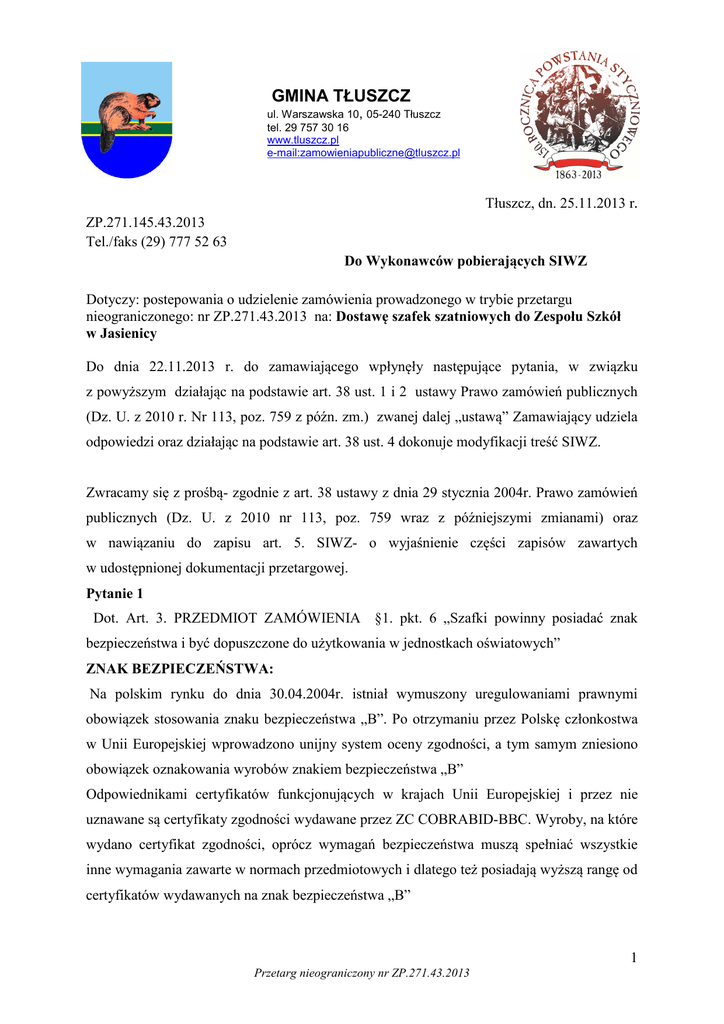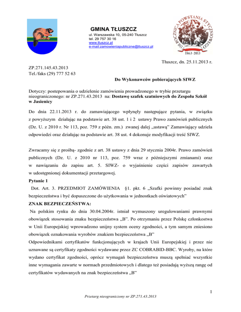 GMINA TŁUSZCZ ul. Warszawska 10, 05-240 Tłuszcz tel. 29 757 30 16 www.tluszcz.pl e-mail:[email protected] Tłuszcz, dn. 25.11.2013 r. ZP.271.145.43.2013 Tel./faks (29) 777 52 63 Do Wykonawców pobierających SIWZ Dotyczy: postepowania o udzielenie zamówienia prowadzonego w trybie przetargu nieograniczonego: nr ZP.271.43.2013 na: Dostawę szafek szatniowych do Zespołu Szkół w Jasienicy Do dnia 22.11.2013 r. do zamawiającego wpłynęły następujące pytania, w związku z powyższym działając na podstawie art. 38 ust. 1 i 2 ustawy Prawo zamówień publicznych (Dz. U. z 2010 r. Nr 113, poz. 759 z późn. zm.) zwanej dalej „ustawą” Zamawiający udziela odpowiedzi oraz działając na podstawie art. 38 ust. 4 dokonuje modyfikacji treść SIWZ. Zwracamy się z prośbą- zgodnie z art. 38 ustawy z dnia 29 stycznia 2004r. Prawo zamówień publicznych (Dz. U. z 2010 nr 113, poz. 759 wraz z późniejszymi zmianami) oraz w nawiązaniu do zapisu art. 5. SIWZ- o wyjaśnienie części zapisów zawartych w udostępnionej dokumentacji przetargowej. Pytanie 1 Dot. Art. 3. PRZEDMIOT ZAMÓWIENIA §1. pkt. 6 „Szafki powinny posiadać znak bezpieczeństwa i być dopuszczone do użytkowania w jednostkach oświatowych” ZNAK BEZPIECZEŃSTWA: Na polskim rynku do dnia 30.04.2004r. istniał wymuszony uregulowaniami prawnymi obowiązek stosowania znaku bezpieczeństwa „B”. Po otrzymaniu przez Polskę członkostwa w Unii Europejskiej wprowadzono unijny system oceny zgodności, a tym samym zniesiono obowiązek oznakowania wyrobów znakiem bezpieczeństwa „B” Odpowiednikami certyfikatów funkcjonujących w krajach Unii Europejskiej i przez nie uznawane są certyfikaty zgodności wydawane przez ZC COBRABID-BBC. Wyroby, na które wydano certyfikat zgodności, oprócz wymagań bezpieczeństwa muszą spełniać wszystkie inne wymagania zawarte w normach przedmiotowych i dlatego też posiadają wyższą rangę od certyfikatów wydawanych na znak bezpieczeństwa „B” 1 Przetarg nieograniczony nr ZP.271.43.2013 NORMY DOPUSZCZAJĄCE DO UŻYTKOWANIA SZAFEK W JEDNOSTKACH OŚWIATOWYCH Na rynku istniały dwie normy: PN-F-06009:2001 (wymagania krytyczne dotyczące bezpieczeństwa użytkowania i higieniczności mebli oraz wymagania istotne dotyczące funkcjonalności i przydatności użytkowej. Określono zasady pakowania, przechowywania i transportu. Opisano badania sprawdzające wymagania.)- Norma wycofana 2011-12-02 PN-F-06010-05:1990 (meble szkolne i przedszkolne- meble do przechowywaniapodstawowe wymiary funkcjonalne)- Norma wycofana 2010-10-27 OBIE FORMY WYCOFANE BEZ ZASTĄPIENIA Odpowiedź: Zamawiający dokonuje modyfikacji treści SIWZ poprzez wykreślenie art. 3 §1 ust. 6 Szafki powinny posiadać znak w jednostkach oświatowych bezpieczeństwa i być dopuszczone do użytkowania Z poważaniem, Z up. Burmistrza mgr Waldemar Jan Banaszek Zastępca Burmistrza 2 Przetarg nieograniczony nr ZP.271.43.2013