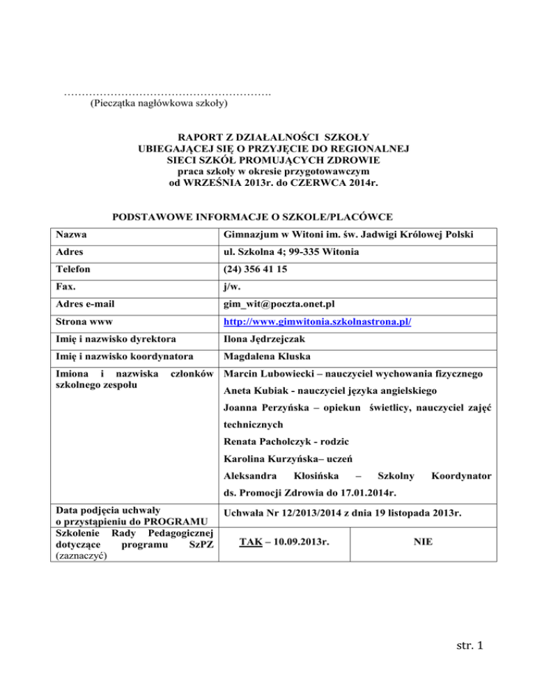 raport z działalności szkoły - Gimnazjum w Witoni im. św. Jadwigi