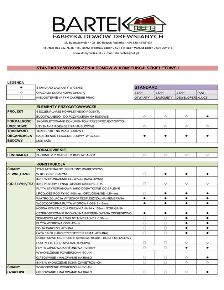 ul. Budowlanych 4 ▪ 21-300 Radzyń Podlaski ▪ NIP: 538-16-56-934 tel/fax: 083 352 76 86 ▪ tel. kom.: Mirosław Bober 0 501 511 888 ▪ Mariusz Bober 0 501 309 913 www.domybartek.pl ▪ e-mail: [email protected] STANDARDY WYKOŃCZENIA DOMÓW W KONSTUKCJI SZKIELETOWEJ LEGENDA ● ○ STANDARD ZAWARTY W CENIE STANDARD OPCJA ZA DODATKOWĄ OPŁATĄ STAN STAN STAN NIEDOSTĘPNE W TYM ZAKRESIE PRAC OTWARTY ZAMKNIĘTY DEWELOPERSKI KLUCZ POD ELEMENTY PRZYGOTOWAWCZE PROJEKT 4 EGZEMPLARZE KOMPLETNEGO POJEKTU BUDOWLANEGO - DO POZWOLENIA NA BUDOWĘ FORMALNOŚCI SKOMPLETOWANIE DOKUMENTÓW PRZEDPROJEKTOWYCH URZĘDOWE UZYSKANIE POZWOLENIA NA BUDOWĘ TRANSPORT TRANSPORT NA PLAC BUDOWY ORGANIZACJA NADZÓR NAD PLACEM BUDOWY W CZASIE BUDOWY MONTAŻU ○ ○ ○ ● ○ ○ ○ ○ ● ● ● ● ○ ○ ○ ○ ● ● ● ○ ○ ○ ● ● ● ● ● ● ● ● ● ● ● ● ● ● ● ● ● ● ● ● ● ● ● ○ ● ○ ● ○ ○ ● ○ ○ ● POSADOWIENIE FUNDAMENT ZGODNIE Z PROJEKTEM BUDOWLANYM ŚCIANY TYNK MINERALNY ,ZBROJONY,WARSTWOWY ZEWNĘTRZNE W KOLORZE BIAŁYM KONSTRUKCJA INNE WYKOŃCZENIA ELEWACJI (SZALÓWKA) (OD ZEWNĄTRZ) INNE KOLORY TYNKU ,OPASKI OKIENNE ,ITP. PLYTA STYROPIANOWA JAKO DODATKOWE OCIEPLENIE I PODŁOŻE POD TYNK -100mm (OPCJONALNIE -120mm) WIATROIZOLACJA WYSOKOPRZEPUSZCZALNA MEMBRANA WODOODPORNA PŁYTA WIÓROWA OSB 3 -12mm NOŚNA KONSTUKCJA DREWNIANA 44 x 150mm STRUGANA CZTEROSTRONNIE PODWALINA IMPREGNOWANA CIŚNIENIOWO TERMOIZOLACJA Z WEŁNY MINERALNEJ -150mm PŁYTA WIÓROWA OSB -12mm FOLIA PAROIZOLACYJNA ŁATA 32x50 (JAKO PRZESTRZEŃ INSTALACYJNA) DODATKOWE OCIEPLENIE 50mm lub 100mm , RUSZT METALOWY POD PŁYTĘ GIPSOWO-KARTONOWĄ PŁYTA GIPSOWA-KARTONOWA -12,5mm WYKOŃCZENIE POWIERZCHNI ŚCIAN GIPSOWANIE I MALOWANIE NA BIAŁO INNE WYKOŃCZENIE ŚCIAN ZWNĘTRZNYCH ŚCIANY WYKOŃCZENIE POWIERZCHNI ŚCIAN DZIAŁOWE GIPSOWANIE I MALOWANIE NA BIAŁO PŁYTA GIPSOWO-KARTONOWA -12,5mm KONSTUKCJA DREWNIANA 44 x 100mm ○ ○ IZOLACJA AKUSTYCZNA WEŁNA MINERALNA 100mm PŁYTA GIPSOWO-KARTONOWA -12,5mm ● ● ● ● ● ● ● ● ○ ○ ○ ○ ○ ● ● ● ○ ● ● ● ● ● ● ● ● ● ● ● ● ● ○ ● WYKOŃCZENIE POWIERZCHNI ŚCIAN GIPSOWANIE I MALOWANIE NA BIAŁO INNE WYKOŃCZENIE ŚCIAN WEWNĘTRZNYCH STROP PANELE PODŁOGOWE W WYSOKIEJ KLASIE ŚCIERALNOŚCI PODDASZEM WYLEWKA BETONOWA ZBROJONA - 60mm STYROPIAN 50mm UŻYTKOWYM PŁYTA OSB 3 - gr. 18mm (OD GÓRY) DREWNIANA KONSTRUKCJA NOŚNA 50x200-250mm ● ● ● ● WEŁNA MINERALNA JAKO IZOLACJA TERMICZA I AKUSTYCZNA -100mm PAROIZOLACJA 0,2mm RUSZT DREWNIANY 30x50mm PŁYTA GIPSOWO-KARTONOWA -12,5mm WYKOŃCZENIE POWIERZCHNI SUFITU GIPSOWANIE I MALOWANIE NA BIAŁO DACH BLACHODACHÓWKA LUB GONT BITUMICZNY W WYBRANYM KOLORZE INNE POKRYCIE DACHOWE (DACHÓWKA) OBRÓBKI BLACHARSKIE ○ ○ ○ ● ○ ● ● ○ ● ● ○ ● ○ ● ● ● ● ● ● ● ● ● ● ● ● ● ● ● ● ● ● ● ● ● ● ● ● ● ○ ○ ○ ○ ● ● ● ● ○ ● ● ● ● ● ● ● ● ● ● ● ● ● ○ ○ ● ○ ○ ● ○ ○ ● ŁATY IMPREGNOWANE CIŚNIENIOWO 32x50mm LUB W DOMACH Z DESKA STRUGANA NA PIÓRO-WPUST 20mm PODDASZEM KONTRŁATY IMPREGNOWANE CIŚNIENIOWO -20x50mm UŻYTKOWYM MEMBRANA DACHOWA PREFABRYKOWANA DREWNIANA KONSTRUKCJA NOŚNA DACHU STRUGANA CZTEROSTRONNIE I IMPREGNOWANA (OD GÓRY) IZOLACJA TERMICZNA Z WEŁNY MINERALNEJ-200mm FOLIA PAROIZOLACYJNA RUSZT DREWNIANY 44x50mm IZOLACJA TERMICZNA Z WEŁNY MINERALNEJ-50mm PŁYTA GIPSOWO-KARTONOWA -12,5mm WYKOŃCZENIE POWIERZCHNI ŚCIAN GIPSOWANIE I MALOWANIE NA BIAŁO POSADZKA WARSTWA IZOLACYJNA ZE STYROPIANU -150mm FOLIA 0,2mm WARSTWY NA WYLEWKA BETONOWA ZBROJONA -60mm PARTERZE PANELE PODŁOGOWE W WYSOKIEJ KLASIE ŚCIERALNOŚCI (OD DOŁU) LUB MONTAŻ TERAKOTY ELEMENTY ZEWNETRZNE DOMU PODBITKA DREWNIANA MALOWANA NA WYBRANY KOLOR ODWODNIENIE RYNNY I RURY SPUSTOWE PLASTIKOWE W WYRANYM DACHU KOLORZE OKNA ENERGOOSZCZEDNE DREWNIANE W KOLORZE WG DOSTEPNEJ PALETY BARW SZYBY O WSPÓŁCZYNNIKU U=1,1 W/M2k ○ OKIENNICE DREWNIANE MALOWANE W WYBRANYM KOLORZE OKUCIA MALOWANE PROSZKOWO (CZARNE) ROLETY ZEWNETRZNE (BIAŁE LUB BRĄZOWE) PARAPETY ZEWNĘTRZNE METALOWE DRZWI ENERGOOSZCZEDNE DREWNIANE W KOLORZE WG DOSTEPNEJ WEJŚCIOWE PALETY BARW ● ● ● ○ ○ ● ● ○ ● WYPOSAŻONE W OKUCIA ZABEZPIECZAJĄCE 4 PUNKTOWE ELEMENTY WEWNETRZNE DOMU SCHODY DREWNIANE SOSNOWE AŻUROWE Z PORĘCZĄ SCHODY WG IDYWIDUALNEGO DOBORU DREWNA I WZORU SCHODY STRYCHOWE ROZKŁADANE DREWNIANE WENTYLACJA WYWIEWKI WENTYLACYJNE W SYSTEMIE POKRYCIA DACHOWEGO W KOLORZE ZBLIŻONYM DO DACHU ○ ● ● ● ● ● ● ● ○ ○ ○ ● ○ ○ ○ ● ● ○ ○ ○ ○ ○ ○ ○ ○ ○ RURY O ŚREDNICY 125mm KRATKI WENTYLACYJNE W KOLORZE BIAŁYM KOMINY PREFABRYKOWANY KOMIN SYSTEMOWY FIRMY SCHIEDEL WG IDYWIDUALNEGO DOBORU PARAPETY DREWNIANE MALOWANE NA WYBRANY KOLOR WEWNĘTRZNE O GRUBOŚCI 30mm DRZWI DREWNIANE SOSNOWE MALOWANE NA WYBRANY KOLOR WEWNĘTRZNE DRZWI WG WŁASNEGO WZORU SZAFY Z PŁYTY LAMINOWANEJ LUB WNĘKOWE Z PŁYTY W OKLEINIE NATURALNEJ MALOWANEJ INSTALACJE WEWNĘTRZNE INSTALACJA KOMPLETNA INSTALACJA ELEKTRYCZNA ELEKTRYCZNA TABLICA ROZDZIELACZA WRAZ WYPOSAŻENIEM OSPRZĘT ELEKTRYCZNY W KOLORZE BIAŁYM INSTALACJA KOMPLETNA INSTALACJA WODNA I KANALIZACYJNA WODNA I ZBIORNIK NA CIEPŁĄ WODĘ UŻYTKOWĄ -100L KANALIZACYJNA URZĄDZENIA SANITARNE I BATERIE INSTALACJA INSTALACJA Z RUR Z TWORZYWA SZTUCZNEGO CENTRALNEGO GRZEJNIKI PŁYTOWE WYPOSARZONE W GŁOWICE OGRZEWANIA TERMOSTATYCZNE , KOCIOŁ OGRZEWANIE PODŁOGOWE , POMPA CIEPŁA LUB INNE ŹRÓDŁA CIEPŁA WYKOŃCZENIE WEWNĘTRZNE POMIESZCZEŃ - DOTYCZY STANDARDU POD KLUCZ PODSTAWOWY ,OPISANY PNIŻEJ STANDARD WYKONANIA POMIESZCZEŃ MOŻNA ZA DOPŁATĄ DOWOLNIE PODWYŻSZAĆ ZGODNIE Z INDYWIDUALNYMI POTRZEBAMI WIATROŁAP PODŁOGA - TERAKOTA WRAZ Z COKOŁEM (MATERIAŁ INWESTORA) ŚCIANY I SUFIT - PŁYTA GIPSOWO-KARTONOWA SZPACHLOWANA I MALOWANA NA BIAŁO HOL PODŁOGA - TERAKOTA WRAZ Z CO