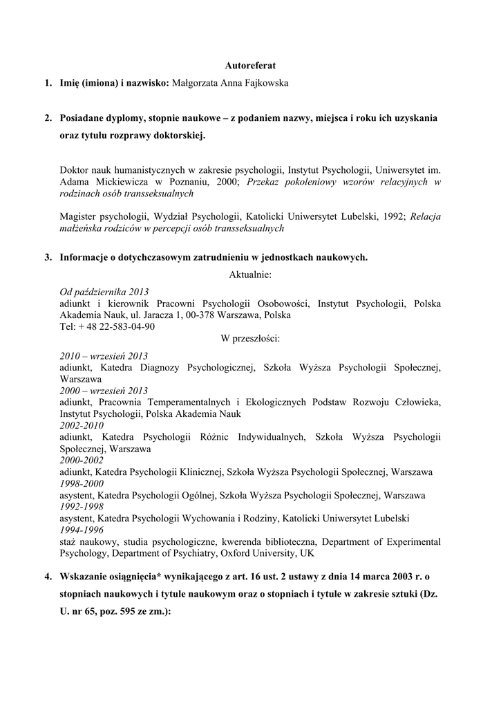 Autoreferat 1. Imię (imiona) i nazwisko: Małgorzata Anna Fajkowska 2. Posiadane dyplomy, stopnie naukowe – z podaniem nazwy, miejsca i roku ich uzyskania oraz tytułu rozprawy doktorskiej. Doktor nauk humanistycznych w zakresie psychologii, Instytut Psychologii, Uniwersytet im. Adama Mickiewicza w Poznaniu, 2000; Przekaz pokoleniowy wzorów relacyjnych w rodzinach osób transseksualnych Magister psychologii, Wydział Psychologii, Katolicki Uniwersytet Lubelski, 1992; Relacja małżeńska rodziców w percepcji osób transseksualnych 3. Informacje o dotychczasowym zatrudnieniu w jednostkach naukowych. Aktualnie: Od października 2013 adiunkt i kierownik Pracowni Psychologii Osobowości, Instytut Psychologii, Polska Akademia Nauk, ul. Jaracza 1, 00-378 Warszawa, Polska Tel: + 48 22-583-04-90 W przeszłości: 2010 – wrzesień 2013 adiunkt, Katedra Diagnozy Psychologicznej, Szkoła Wyższa Psychologii Społecznej, Warszawa 2000 – wrzesień 2013 adiunkt, Pracownia Temperamentalnych i Ekologicznych Podstaw Rozwoju Człowieka, Instytut Psychologii, Polska Akademia Nauk 2002-2010 adiunkt, Katedra Psychologii Różnic Indywidualnych, Szkoła Wyższa Psychologii Społecznej, Warszawa 2000-2002 adiunkt, Katedra Psychologii Klinicznej, Szkoła Wyższa Psychologii Społecznej, Warszawa 1998-2000 asystent, Katedra Psychologii Ogólnej, Szkoła Wyższa Psychologii Społecznej, Warszawa 1992-1998 asystent, Katedra Psychologii Wychowania i Rodziny, Katolicki Uniwersytet Lubelski 1994-1996 staż naukowy, studia psychologiczne, kwerenda biblioteczna, Department of Experimental Psychology, Department of Psychiatry, Oxford University, UK 4. Wskazanie osiągnięcia* wynikającego z art. 16 ust. 2 ustawy z dnia 14 marca 2003 r. o stopniach naukowych i tytule naukowym oraz o stopniach i tytule w zakresie sztuki (Dz. U. nr 65, poz. 595 ze zm.): a) tytuł osiągnięcia naukowego: Personality Coherence and Incoherence: A Perspective on Anxiety and Depression b) Małgorzata Fajkowska (2013). Personality Coherence and Incoherence: A Perspective on Anxiety and Depression. Clinton Corners, NY: Eliot Werner Publications. c) omówienie celu naukowego ww. pracy i osiągniętych wyników wraz z omówieniem ich ewentualnego wykorzystania: Wskazana przeze mnie książka podejmuje problematykę osobowości koherentnej i niekoherentnej oraz jej roli w wyjaśnianiu lęku i depresji. Z przeglądu literatury przedmiotu wynika, że istnieje tylko kilka pozycji naukowych wprowadzających czytelnika w zagadnienie koherencji osobowości. Książki te zazwyczaj koncentrują się na tzw. integrujących modelach osobowości, mających ogromne znaczenie w kształtowaniu i definiowaniu tego obszaru nauki. Niemniej jednak, żaden z proponowanych modeli teoretycznych, zamieszczonych w tych publikacjach, nie uwzględnia temperamentu i systemu uwagi, jako kluczowych elementów osobowości koherentnej. Ponadto, żaden z nich nie wyjaśnia fenomenu osobowości niekoherentnej. Przedstawiona przeze mnie koncepcja zawarta w pracy obejmuje te właśnie treści, co - jak sądzę - stanowi o oryginalności proponowanego przeze mnie ujęcia teoretycznego. Głównym czynnikiem motywującym do napisania tej monografii było pytanie czym jest intraindywidualna koherencja i niekoherencja osobowości. Dodatkową inspirację stanowiło zagadnienie dotyczące funkcjonalnej roli osobowości koherentnej i niekoherentnej oraz jej związku z jakością i dynamiką wykonywania zadań poznawczych. Zatem, podstawowym celem powstania tej książki była prezentacja nowej teorii dotyczącej rozumienia struktury osobowości koherentnej/niekoherentnej. Prócz tego, przyjęłam, że wprowadzenie do tej teorii cech afektywnych (lęku i depresji) jako elementów intraindywidualnej koherencji/niekoherencji może przyczynić się do bardziej kompletnego wyjaśnienia funkcjonalnych relacji pomiędzy negatywnym afektem a uwagowym przetwarzaniem informacji. Stąd, napisanie tej książki miało także przyczynić się do rozwoju i poszerzenia wiedzy na temat lęku i depresji poprzez włączenie ich do nadrzędnie zintegrowanego schematu - systemu osobowości - co pozwala lepiej uchwycić złożoną naturę tych cech i specyfikę ich roli w wykonywaniu zadań poznawczych. Poniżej streszczam te zagadnienia zawarte w monografii, które wydają mi się szczególnie istotne z punktu widzenia wkładu przedstawionej przeze mnie teorii do rozwoju psychologii osobowości i poszerzenia wiedzy z zakresu lęku i depresji. 2 Osobowość jako system złożony: perspektywa metateoretyczna Proponowane przeze mnie podejście do osobowości – Model Osobowości jako System Złożony (Complex-System Approach to Personality; C-SAP) – promuje stanowisko integracyjne w nauce o osobowości. W ramach tego modelu prawdziwym wyzwaniem było sformułowanie takiej podstawy teoretycznej, która kumulowałaby osiągnięcia niektórych wcześniejszych teorii osobowości, aby stworzyć możliwość opisu i wyjaśnienia funkcjonowania jednostki na poziomie intra- i interindywidualnym. Punktem wyjścia w formułowaniu Modelu Osobowości jako Systemu Złożonego była identyfikacja uniwersalnych zasad, mechanizmów, procesów, które pozostają stałe i dają możliwość wyjaśnienia zasadniczych, oraz równoległych charakterystyk osobowości: struktury i dynamiki, stałości i zmienności, a także jej podstawowych funkcji (regulacyjnej i integracyjnej). Odpowiadając na to wyzwanie, odwołuję się do zasad, mechanizmów i procesów jakie wykorzystują w wyjaśnieniu i opisie różnych zjawisk psychologicznych podejścia odnoszące się do teorii systemów złożonych (np. społeczno-poznawcze teorie osobowości, Transakcyjny Model Temperamentu Eliasza). Innymi słowy, przyjęłam iż wprowadzenie do modelu wybranych metateoretycznych aspektów, zaczerpniętych z teorii systemów, może przyczynić się do rozwiązania niektórych, pozostających nadal bez odpowiedzi pytań w obszarze psychologi