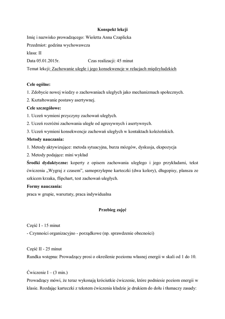 Konspekt lekcji Imię i nazwisko prowadzącego: Wioletta Anna Czaplicka Przedmiot: godzina wychowawcza klasa: II Data 05.01.2015r. Czas realizacji: 45 minut Temat lekcji: Zachowanie uległe i jego konsekwencje w relacjach międzyludzkich Cele ogólne: 1. Zdobycie nowej wiedzy o zachowaniach uległych jako mechanizmach społecznych. 2. Kształtowanie postawy asertywnej. Cele szczegółowe: 1. Uczeń wymieni przyczyny zachowań uległych. 2. Uczeń rozróżni zachowania uległe od agresywnych i asertywnych. 3. Uczeń wymieni konsekwencje zachowań uległych w kontaktach koleżeńskich. Metody nauczania: 1. Metody aktywizujące: metoda sytuacyjna, burza mózgów, dyskusja, ekspozycja 2. Metody podające: mini wykład Środki dydaktyczne: koperty z opisem zachowania uległego i jego przykładami, tekst ćwiczenia „Wygraj z czasem”, samoprzylepne karteczki (dwa kolory), długopisy, plansza ze szkicem krzaka, flipchart, test zachowań uległych. Formy nauczania: praca w grupie, warsztaty, praca indywidualna Przebieg zajęć Część I - 15 minut - Czynności organizacyjno - porządkowe (np. sprawdzenie obecności) Część II - 25 minut Rundka wstępna: Prowadzący prosi o określenie poziomu własnej energii w skali od 1 do 10. Ćwiczenie I – (3 min.) Prowadzący mówi, że teraz wykonają króciutkie ćwiczenie, które podniesie poziom energii w klasie. Rozdając karteczki z tekstem ćwiczenia kładzie je drukiem do dołu i tłumaczy zasady: - odwracamy karteczki na mój znak, - mamy tylko trzy minuty na wykonanie tego ćwiczenia, - osoba, która wykona ćwiczenie pierwsza podnosi rękę do góry i nie przeszkadza innym, - osoba, która zrezygnuje z wykonania ćwiczenia odwraca kartkę tekstem do dołu i nie przeszkadza innym, - wykonujemy polecenia dokładnie, czyli jeżeli w poleceniu jest „powiedz głośno” to wykonujecie to, chcę Was słyszeć. Podczas wykonywania ćwiczenia prowadzący cały czas sygnalizuje upływ czasu, rozpraszając tym uwagę uczniów. Jest to konieczne, żeby ćwiczenie udało się. - załącznik nr 1 Prowadzący tłumaczy, na czym polegał haczyk w tym ćwiczeniu i, że tzw. „owczy pęd”, czyli bezrefleksyjne robienie tego, co robią inni jest rodzajem zachowania uległego. Prowadzący podaje temat zajęć: „Zachowanie uległe i jego konsekwencje w relacjach międzyludzkich”. Ćwiczenie II - (7 minut) Prowadzący dzieli klasę na cztery zespoły pięcioosobowe. Rozdaje koperty mówiąc, że w środku jest definicja zachowania uległego i opisy różnych scenek (każda grupa ma inne). Z tych scenek uczniowie muszą wybrać te, które są przykładem zachowań uległych. Praca w grupach: Każda z grup zapoznaje się z definicją zachowania uległego i wybiera właściwe scenki. - załącznik 2 Następnie prowadzący prosi każdą z grup o odczytanie definicji i wybrane przykłady. Gdy jedna grupa czyta swoje wybrane scenki reszta sprawdza czy wybrali prawidłowo. Ćwiczenie II – (10 min) Prowadzący prosi, żeby każdy wyobraził sobie, że jest osobą zachowującą się zawsze ulegle. Rozdaje grupom karteczki samoprzylepne. Zastanówcie się, dlaczego tak zachowują się osoby uległe. Jakie mogą być tego przyczyny? Każdy pomysł jest dobry. Zapisujecie go na karteczce i przyklejacie do korzeni krzaczka. Przykładowe pomysły: - obawiamy się odrzucenia, - bo chcemy, żeby wszyscy nas lubili, - obawiamy się porażki, - obawiamy się braku akceptacji, - obawiamy się reakcji innych ludzi, - uważamy, że to grzeczne zachowanie, - wolimy uniknąć konfliktu, - mamy niską samoocenę, - nieumiejętność wyrażania własnych uczuć, - ucieczka od podejmowania decyzji, - niewiara we własne możliwości, - nie jesteśmy asertywni, - chcemy manipulować innymi ludźmi, - chcemy osiągnąć jakieś korzyści. Prowadzący jeszcze raz odczytuje wszystkie pomysły Ćwiczenie III – (5min) Znamy już przyczyny zachowań uległych – przynajmniej niektóre – a teraz spróbujmy ustalić skutki takiego zachowania w relacjach z otoczeniem, z kolegami. Każda grupa zastanowi się nad skutkami i wypisze je na karteczkach. Później przykleimy je w miejscu, gdzie krzak powinien mieć owoce. Te „owoce” będą symbolem skutków naszego postępowania. Przykładowe skutki: - niedowartościowanie, - utrata wiary w siebie, - wzbierająca złość, frustracja, gniew - wybuchy agresji, - konformizm, - poczucie krzywdy, - brak osiągania pożądanych celów, - płacz - nieadekwatne reakcje, - izolacja, - brak sympatii ze strony otoczenia, - stres. Część III - 5 minut Uległość to ignorowanie własnych potrzeb, odczuć, poglądów, lekceważenie własnych praw, udawanie zadowolenia z podporządkowania się innym. Wskutek uległości gromadzi się w nas żal, gorycz, pretensje do całego świata. Pozwalamy by nas lekceważono. Taka postawa często prowadzi do wybuchów nieuzasadnionego gniewu, izolacji społecznej, bardzo niskiej samooceny i nieakceptowania nas przez rówieśników. (W zależności od pozostałego czasu podsumowujący mini wykład może być dłuższy). Rozdam Wam teraz mały test. Wykonacie go w domu, ale nie traktujcie tego jak pracy domowej. Niech zrobią go te osoby, które naprawdę chcą dowiedzieć się, jakiego typu zachowanie je cechuje. Oczywiście nikt tego nie będzie sprawdzał. - załącznik nr 3 Dziękuję za aktywność na zajęciach. Załącznik 2 ZACHOWANIA ULEGŁE – charakteryzują się respektowaniem praw innych osób i lekceważeniem praw własnych. Nie uwzględniamy swoich potrzeb, poglądów, odczuć, pozwalamy by nas lekceważono. Osoby uległe myślą takim schematem: Liczą się potrzeby i zdanie innych, a nie moje. ZACHOWANIA ULEGŁE – charakteryzują się respektowaniem praw innych osób i lekceważeniem praw własnych. Nie uwzględniamy swoich potrzeb, poglądów, odczuć, pozwalamy by nas lekceważono. Osoby uległe myślą takim schematem: Liczą się potrzeby i zdanie innych, a nie moje. ZACHOWANIA ULEG