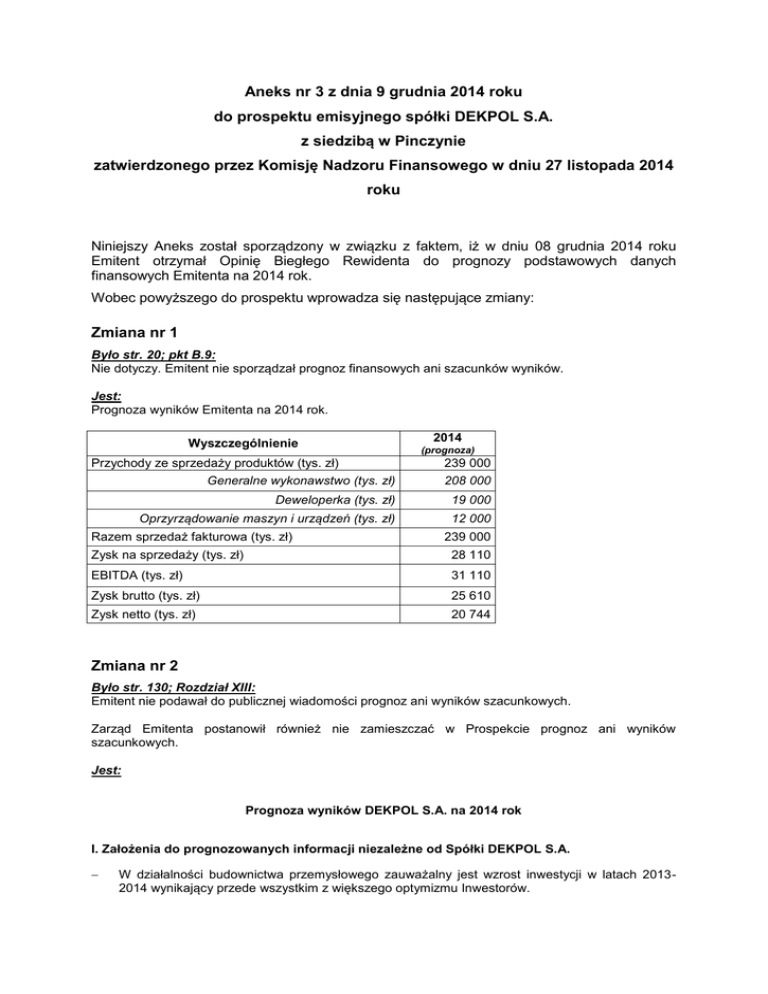 Aneks nr 3 z dnia 9 grudnia 2014 roku do prospektu emisyjnego spółki DEKPOL S.A. z siedzibą w Pinczynie zatwierdzonego przez Komisję Nadzoru Finansowego w dniu 27 listopada 2014 roku Niniejszy Aneks został sporządzony w związku z faktem, iż w dniu 08 grudnia 2014 roku Emitent otrzymał Opinię Biegłego Rewidenta do prognozy podstawowych danych finansowych Emitenta na 2014 rok. Wobec powyższego do prospektu wprowadza się następujące zmiany: Zmiana nr 1 Było str. 20; pkt B.9: Nie dotyczy. Emitent nie sporządzał prognoz finansowych ani szacunków wyników. Jest: Prognoza wyników Emitenta na 2014 rok. Wyszczególnienie 2014 (prognoza) Przychody ze sprzedaży produktów (tys. zł) Generalne wykonawstwo (tys. zł) 239 000 208 000 Deweloperka (tys. zł) 19 000 Oprzyrządowanie maszyn i urządzeń (tys. zł) 12 000 Razem sprzedaż fakturowa (tys. zł) 239 000 Zysk na sprzedaży (tys. zł) 28 110 EBITDA (tys. zł) 31 110 Zysk brutto (tys. zł) 25 610 Zysk netto (tys. zł) 20 744 Zmiana nr 2 Było str. 130; Rozdział XIII: Emitent nie podawał do publicznej wiadomości prognoz ani wyników szacunkowych. Zarząd Emitenta postanowił również nie zamieszczać w Prospekcie prognoz ani wyników szacunkowych. Jest: Prognoza wyników DEKPOL S.A. na 2014 rok I. Założenia do prognozowanych informacji niezależne od Spółki DEKPOL S.A. W działalności budownictwa przemysłowego zauważalny jest wzrost inwestycji w latach 20132014 wynikający przede wszystkim z większego optymizmu Inwestorów. Założono brak decyzji politycznych, które bardzo istotnie i destabilizująco wpłynęłyby na zmiany poziomu inflacji oraz stóp procentowych, a tym samym na osiągane przychody i ponoszone koszty. Założono brak istotnych problemów w zakresie procedur administracyjnych związanych z uzyskiwaniem niezbędnych zezwoleń, jednakże w harmonogramach realizacji poszczególnych inwestycji założono rezerwę na przedłużające się procedury administracyjne w budownictwie. II. Założenia do prognozowanych informacji zależne od Spółki DEKPOL S.A. Przychody z działalności Generalnego wykonawstwa oparto o aktualnie posiadany portfel zleceń. Przychody ze sprzedaży osprzętu do maszyn budowlanych oparto o aktualnie posiadany portfel zleceń oraz portfel nowych zleceń o wysokim prawdopodobieństwie realizacji. Przychody ze sprzedaży z tytułu działalności deweloperskiej oparto wyłącznie o inwestycje, których realizacja jest przesądzona, przy założeniu stabilnego funkcjonowania administracji i gospodarki. Wskaźniki marży dla poszczególnych linii biznesowych Emitenta opierają się na rzeczywistych wskaźnikach roku 2014. Prognoza kosztów zarządu i kosztów sprzedaży wynika z ekstrapolacji kosztów roku 2014. Koszty finansowe opierają się na wskaźnikach oprocentowania wynikających z obowiązujących umów na finansowanie dłużne (kredyty, pożyczki, obligacje, leasing, faktoring). III. Prognoza wybranych elementów rachunku zysków i strat Dane dotyczą DEKPOL S.A. Wyszczególnienie Przychody ze sprzedaży produktów (tys. zł) 2014 239 000 Generalne wykonawstwo (tys. zł) 208 000 Deweloperka (tys. zł) 19 000 Oprzyrządowanie maszyn i urządzeń (tys. zł) 12 000 Razem sprzedaż fakturowa (tys. zł) 239 000 Zysk na sprzedaży (tys. zł) 28 110 EBITDA (tys. zł) 31 110 Zysk brutto (tys. zł) 25 610 Zysk netto (tys. zł) 20 744 IV. Komentarz Zarządu Zarząd Spółki DEKPOL S.A. informuje, iż finansowanie działalności objętej prognozą nastąpi ze środków własnych DEKPOL S.A., obligacji, kredytów bankowych, kredytów kupieckich oraz faktoringu. Raport niezależnego biegłego rewidenta z usługi poświadczającej polegającej na sprawdzeniu wybranych elementów prognozowanych informacji finansowych sporządzonych za okres od 1.01.2014 do 31.12.2014 Dla Akcjonariuszy, Rady Nadzorczej i Zarządu DEKPOL S.A. Przeprowadziliśmy prace poświadczające, których przedmiotem były wybrane elementy prognozowanych informacji finansowych na rok 2014 DEKPOL S.A., z siedzibą w Pinczynie przy ul. Gajowej 31, na które składają się sporządzone w formie planu i oparte na znaczących szacunkach prognozy dotyczące następujących elementów rachunku zysków i strat: Wyszczególnienie Przychody ze sprzedaży produktów (tys. zł) 2014 239 000 Generalne wykonawstwo (tys. zł) 208 000 Deweloperka (tys. zł) 19 000 Oprzyrządowanie maszyn i urządzeń (tys. zł) 12 000 Razem sprzedaż fakturowa (tys. zł) 239 000 Zysk na sprzedaży (tys. zł) 28 110 EBITDA (tys. zł) 31 110 Zysk brutto (tys. zł) 25 610 Zysk netto (tys. zł) 20 744 Prognozowane informacje finansowe zostały sporządzone w celu zamieszczenia ich w Prospekcie Emisyjnym DEKPOL S.A. Za sporządzenie prognozowanych informacji finansowych, w tym także założeń, na których je oparto, odpowiedzialność ponosi Zarząd DEKPOL S.A. Naszym zadaniem było dokonanie sprawdzenia prognozy pod względem prawidłowości jej sporządzenia na podstawie podanych założeń, oraz zgodności zastosowanych zasad rachunkowości przyjętych do opracowania prognozy z zasadami stosowanymi przez DEKPOL S.A. Weryfikację prognozowanych informacji finansowych przeprowadziliśmy stosownie do norm i wytycznych zawartych w Międzynarodowym Standardzie Usług Atestacyjnych 3400 (ISAE 3400) mającego zastosowanie do weryfikacji prognoz finansowych, wydanym przez Międzynarodową Federację Księgowych (IFAC), a także zgodnie z wytycznymi Krajowego Standardu Rewizji Finansowej nr 3 wydanego przez Krajową Radę Biegłych Rewidentów. Nasze prace zaplanowaliśmy i przeprowadziliśmy taki sposób, aby zgromadzić informacje i wyjaśnienia uznane przez nas za niezbędne dla uzyskania wystarczającej pewności, że prognoza wyników została, na podstawie ujawnionych założeń, prawidłowo sporządzona oraz że jest spójna z zasadami rachunkowości przedstawionymi we wprowadzeniu do historycznych danych finansowych. Dokonując weryfikacji przyjęty