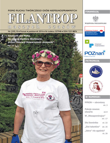 PISMO RUCHU TWÓRCZEGO OSÓB NIEPEŁNOSPRAWNYCH FINANSUJĄ Nr (239) 10 Poznań październik 2014 Nr indeksu 327948 ISSN 1231-8876 Amazonki nad Maltą. Na zdjęciu Krystyna Wechmann, prezes Federacji Stowarzyszeń „Amazonki”. Str. 13 PATRONUJĄ W NUMERZE: PFRON — obroniony str. 3 Pokoje zawsze otwarte str.9 W „Niezapominajce″ FOT. AURELIA PAWLAK str. 17 Dla Dominika str. 23 „Zlot talentów″ str. 25 „Iskra″ nie zgaśnie? str. 39 2 STRONA PAŹDZIERNIK 2014 Perfekcjonizm – pułapka doskonałości Witold Bońkowski Perfekcjoniści mogą, na pierwszy rzut oka, budzić zazdrość: ich dom (i życie) jest w idealnym porządku, nie spóźniają się, dotrzymują terminów, metodycznie realizują wszystkie swoje plany… w rzeczywistości jednak ten różowy obraz to tylko pozory, ukrywające neurozę, stany lękowe i nieustanny niepokój. Ciemna strona perfekcjonizmu to ciągłe natręctwa utrudniające życie naszym bliskim – a przede wszystkim nam samym. Nigdy nie jesteśmy w stanie pozbyć się myśli, że nie mogliśmy zrobić tego, co było do zrobienia, lepiej. Stawiamy sobie nierealne wymagania. Pogrążamy się w pozbawionej końca gonitwie za nieosiągalną doskonałością1. Można powiedzieć, że idealnie uporządkowany dom to niepokojąca oznaka: świadczy o tym, że psychika osoby, która go zamieszkuje, jest daleka od uporządkowania. Za perfekcjonizmem kryje się niepewność: nieświadomie przeczuwamy, że nasza wewnętrzna równowa- ga jest bardzo krucha, że świat nie jest tak uporządkowany, jak się wydaje; rutynowe czynności muszą być wykonane idealnie, żeby ją podtrzymać; jednak wystarczy odrobina nieporządku, aby zapanował całkowity chaos2. Za obsesją porządku i doskonałości może się kryć również niezaspokojona potrzeba uznania: chcemy za wszelką cenę udowodnić światu, jacy jesteśmy solidni, dokładni i rzetelni. Idealny porządek ma być naszą wizytówką. Czujemy się wartościowi tylko wtedy, kiedy wiemy, że nie mamy sobie nic do zarzucenia. Niestety, najdrobniejsze niedociągnięcie niszczy ten obraz… Taka postawa sprawia, że stajemy się swoimi najgorszymi wrogami. Nie pozwalamy sobie cieszyć się życiem, skazujemy się na ciągły stres i zgorzknienie. Jednak perfekcjonizm nie tylko utrudnia życie; może prowadzić do poważnych schorzeń: depresji, bezsenności oraz zaburzeń odżywiania – anoreksji i bulimii3. Żeby pokonać perfekcjonizm, musimy pogodzić się z tym, że życie jest nieprzewidywalne i czasem chaotyczne. Świat się nie rozpadnie, jeśli zrezygnujemy z obsesyjnych prób kontrolowania go – wręcz przeciwnie, życie stanie się łatwiej- sze4. Odpuśćmy, nie narzucajmy sobie nadmiernie wygórowanych standardów. Przyznajmy sobie prawo do popełniania błędów. Nie możemy być perfekcyjni we wszystkim – większość z nas jest świetna w niektórych dziedzinach, słabsza w innych – trzeba to zaakceptować. Większość wyzwań, jakie stawia przed nami życie, nie wymaga perfekcji – nie musimy robić wszystkiego idealnie, wystarczy, jeśli zrobimy to dostatecznie dobrze. Świat nie jest doskonały – i my też nie musimy być! Celem artykułu jest utrzymanie zdrowia w dobrej kondycji przez całe dane nam życie. W problemach chorobowych proszę korzystać z porad kwalifikowanych lekarzy. 1 2 3 4 Przekleństwo perfekcjonizmu, http:// natemat.pl/46547,przeklenstwo-perfekcjonizmu-nieustanne-wymaganiamoga-wywolywac-stany-chorobowe Kurt Tepperwein, Co choroba mówi o Tobie, przeł. M. Dziedzic, Wydawnictwo KOS, Katowice 2003, s. 201. Being a perfectionist can take a toll on health, http://www.nbcnews.com/ id/38170039/ns/health-mental_health/t/ being-perfectionist-can-take-toll-health/ Ewa Klepacka-Gryz, Perfekcjonizm – jak z nim żyć?, http://zwierciadlo.pl/2013/psychologia/zrozumiec-siebie/perfekcjonizm-jak-z-nim-zyc Głosuję z piłką i aparatem P rezydent Poznania Ryszard Grobelny zaprosił chętnych do udziału w zabawie „Zagraj w reklamie PBO2015”. Symbolem tegorocznej kampanii promującej głosowanie w konsultacjach w ramach Poznańskiego Budżetu Obywatelskiego 2015 będzie niebieska piłka z napisem „GŁOSUJĘ”. Nagranie zdjęć z piłką odbyło się we wrześniu na placu Wolności, przed Starym Browarem na ulicy Półwiejskiej oraz na Starym Rynku przed Ratuszem. – Chcemy, by energia społeczna, aktywność i zaangażowanie wyzwoliły się właśnie przy okazji głosowania nad projektami mieszkańców zgłoszonymi do Poznańskiego Budżetu Obywatelskiego – powiedział prezydent Ryszard Grobelny. – W ubiegłym roku mieliśmy prawie 90 tysięcy głosów. Tegoroczne projekty zgłoszone do konsultacji są również warte tylu głosów. Piłka, a w zasadzie kula, to idealna forma geometryczna, która, jak wskazują eksperci, ma największe możliwości absorbowania energii. Starożytni Egipcjanie wierzyli, że kształt kuli wysyła przyjazne dla człowieka fale. Powstała wewnątrz kuli siła uruchamia energię potrzebną do życia. – Przekazywaliśmy sobie niebieską piłkę podczas kręcenia społecznego spotu promującego konsultacje budżetowe – stwierdził Maciej Milewicz, kierownik Oddziału Dialogu Społecznego Biura Prezydenta UMP. – Na pewno warto dzielić się tą energią. awa K Karolina Kasprzak K PPOZNAŃ K ierunki zmian w systemie wsparcia osób niepełnosprawnych, rola oraz zadania Rady Nadzorczej Państwowego Funduszu Rehabilitacji Osób Niepełnosprawnych i Krajowej Rady Konsultacyjnej do spraw Osób Niepełnosprawnych w kontekście wdrażania konwencji o prawach osób niepełnosprawnych były tematem posiedzenia w Dobieszkowie w gminie Stryków w dniach 4 i 5 września. W spotkaniu zorganizowanym z inicjatywy Pełnomocnika Rządu do spraw Osób Niepełnosprawnych Jarosława Dudy wzięli udział przedstawiciele Krajowej Rady Konsultacyjnej do spraw Osób Niepełnosprawnych, Biura Pełnomocnika Rządu do spraw Osób Niepełnosprawnych, Rady Nadzo