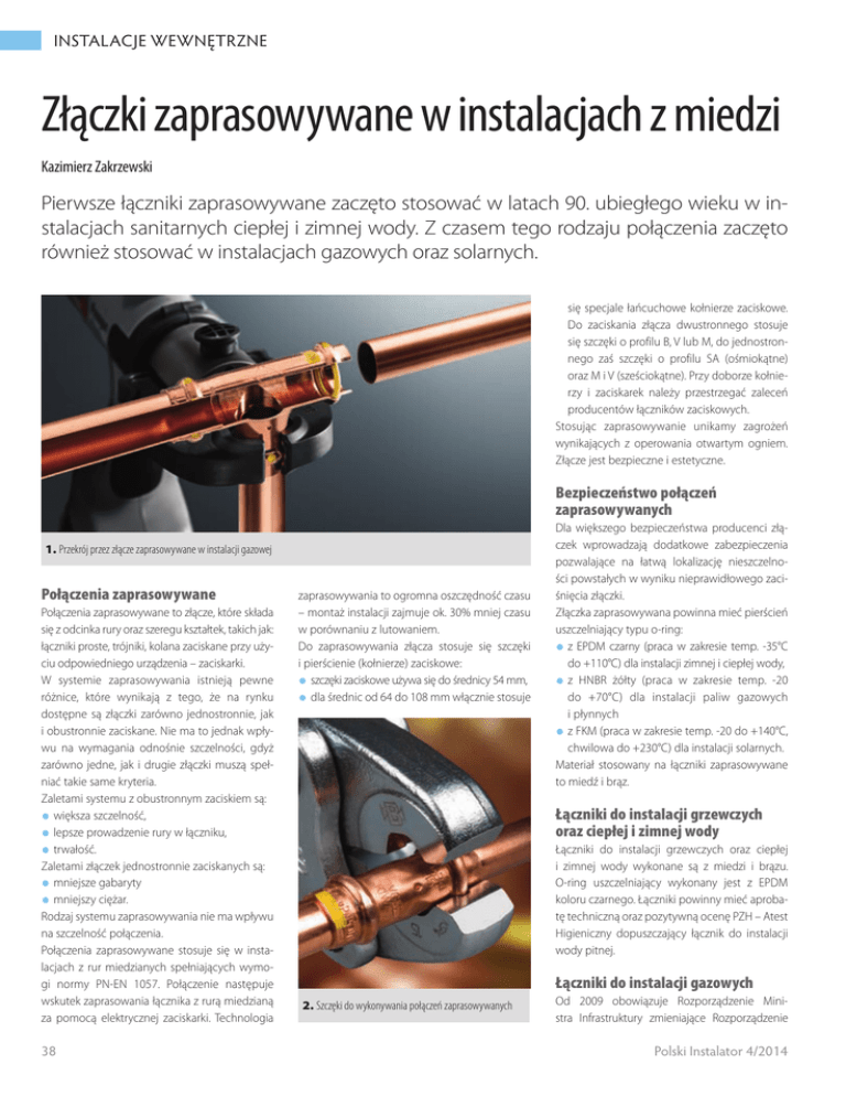 INSTALACJE wEWNĘTRZNE Złączki zaprasowywane w instalacjach z miedzi Kazimierz Zakrzewski Pierwsze łączniki zaprasowywane zaczęto stosować w latach 90. ubiegłego wieku w instalacjach sanitarnych ciepłej i zimnej wody. Z czasem tego rodzaju połączenia zaczęto również stosować w instalacjach gazowych oraz solarnych. się specjale łańcuchowe kołnierze zaciskowe. Do zaciskania złącza dwustronnego stosuje się szczęki o profilu B, V lub M, do jednostronnego zaś szczęki o profilu SA (ośmiokątne) oraz M i V (sześciokątne). Przy doborze kołnierzy i zaciskarek należy przestrzegać zaleceń producentów łączników zaciskowych. Stosując zaprasowywanie unikamy zagrożeń wynikających z operowania otwartym ogniem. Złącze jest bezpieczne i estetyczne. Bezpieczeństwo połączeń zaprasowywanych 1. Przekrój przez złącze zaprasowywane w instalacji gazowej Połączenia zaprasowywane Połączenia zaprasowywane to złącze, które składa się z odcinka rury oraz szeregu kształtek, takich jak: łączniki proste, trójniki, kolana zaciskane przy użyciu odpowiedniego urządzenia – zaciskarki. W systemie zaprasowywania istnieją pewne różnice, które wynikają z tego, że na rynku dostępne są złączki zarówno jednostronnie, jak i obustronnie zaciskane. Nie ma to jednak wpływu na wymagania odnośnie szczelności, gdyż zarówno jedne, jak i drugie złączki muszą spełniać takie same kryteria. Zaletami systemu z obustronnym zaciskiem są: ⚫⚫większa szczelność, ⚫⚫lepsze prowadzenie rury w łączniku, ⚫⚫trwałość. Zaletami złączek jednostronnie zaciskanych są: ⚫⚫mniejsze gabaryty ⚫⚫mniejszy ciężar. Rodzaj systemu zaprasowywania nie ma wpływu na szczelność połączenia. Połączenia zaprasowywane stosuje się w instalacjach z rur miedzianych spełniających wymogi normy PN-EN 1057. Połączenie następuje wskutek zaprasowania łącznika z rurą miedzianą za pomocą elektrycznej zaciskarki. Technologia 38 zaprasowywania to ogromna oszczędność czasu – montaż instalacji zajmuje ok. 30% mniej czasu w porównaniu z lutowaniem. Do zaprasowywania złącza stosuje się szczęki i pierścienie (kołnierze) zaciskowe: ⚫⚫ szczęki zaciskowe używa się do średnicy 54 mm, ⚫⚫dla średnic od 64 do 108 mm włącznie stosuje Dla większego bezpieczeństwa producenci złączek wprowadzają dodatkowe zabezpieczenia pozwalające na łatwą lokalizację nieszczelności powstałych w wyniku nieprawidłowego zaciśnięcia złączki. Złączka zaprasowywana powinna mieć pierścień uszczelniający typu o-ring: ⚫⚫z EPDM czarny (praca w zakresie temp. -35°C do +110°C) dla instalacji zimnej i ciepłej wody, ⚫⚫z HNBR żółty (praca w zakresie temp. -20 do +70°C) dla instalacji paliw gazowych i płynnych ⚫⚫z FKM (praca w zakresie temp. -20 do +140°C, chwilowa do +230°C) dla instalacji solarnych. Materiał stosowany na łączniki zaprasowywane to miedź i brąz. Łączniki do instalacji grzewczych oraz ciepłej i zimnej wody Łączniki do instalacji grzewczych oraz ciepłej i zimnej wody wykonane są z miedzi i brązu. O-ring uszczelniający wykonany jest z EPDM koloru czarnego. Łączniki powinny mieć aprobatę techniczną oraz pozytywną ocenę PZH – Atest Higieniczny dopuszczający łącznik do instalacji wody pitnej. Łączniki do instalacji gazowych 2. Szczęki do wykonywania połączeń zaprasowywanych Od 2009 obowiązuje Rozporządzenie Ministra Infrastruktury zmieniające Rozporządzenie Polski Instalator 4/2014 INSTALACJE wEwNĘTRZNE Zasady wykonywania złącza zaprasowywanego Podstawową zasadą, której należy się trzymać podczas montażu jest przestrze- 3. Złączki do instalacji gazowych 4. Złączki do instalacji solarnych ganie wskazówek dostarczanych przez a ponadto: ⚫⚫należy prawidłowo określić sposób prowadzenia przewodów instalacji, ⚫⚫złączki i rury miedziane powinny być utrzymane w należytej czystości, ⚫⚫cięcie rur miedzianych należy wykonać zawsze specjalistycznymi narzędziami, ⚫⚫niezbędne jest gratowanie rur, żeby uniknąć uszkodzenia elementu uszczelniającego, ⚫⚫osadzenie złączek na rurze powinno się wykonywać w osi rury, minimalizuje to prawdopodobieństwo uszkodzenia lub podwinięcia elementu uszczelniającego, ⚫⚫po osadzeniu kształtki zaleca się oznaczenie głębokości wsunięcia, ułatwia to wizualną kontrolę poprawności osadzenia kształtki w momencie zaprasowywania połączenia, ⚫⚫właściwe jest wykonywanie połączeń urządzeniami zalecanymi przez producenta kształtki, ⚫⚫w przypadku prowadzenia przewodów na prostym długim odcinku przez kilka pomieszczeń o różnej temperaturze, zaleca się sprawdzenie konieczności wykonania kompensacji, ⚫⚫zaleca się, aby odcinki instalacji poddawane oddzielnej próbie szczelności były łączone kształtkami jednego producenta, ⚫⚫ze względów konstrukcyjnych kształtki do różnego typu instalacji są bardzo podobne. Mimo wyraźnych oznaczeń identyfikacyjnych zaleca się przechowywanie łączników w osobnych opakowaniach, aby uniknąć ewentualnej pomyłki, ⚫⚫w przypadku wykonania wadliwego połączenia, raz zaciśnięta kształtka nie może być ponownie wykorzystana w instalacji. www.polskiinstalator.com.pl w sprawie warunków technicznych, jakim powinny odpowiadać budynki i ich usytuowanie – DzU Nr 75, poz. 690 z 2002 roku z późniejszymi zmianami. Celem zmian we wspomnianym rozporządzeniu była potrzeba jego aktualizacji spowodowana wprowadzeniem do zbioru Polskich Norm nowych norm europejskich i międzynarodowych, a także potrzeba dostosowania zawartych w rozporządzeniu wymagań do aktualnego stanu wiedzy. Od daty podpisania Rozporządzenia Ministra Infrastruktury zmieniającego Rozporządzenie w sprawie warunków technicznych, jakim powinny odpowiadać budynki i ich usytuowanie, na rynku polskim dopuszczone zostały złączki zaprasowywane do gazu. Łączniki 