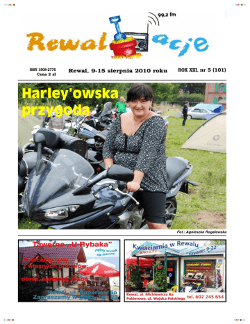 ISSN 1508-2776 Cena 2 zł Rewal, 9-15 sierpnia 2010 roku ROK XIII, nr 5 (101) Harley’owska przygoda Fot.: Agnieszka Rogalewska CO SŁYCHAĆ? KIT (Krótkie Informacje Tekstowe) Podobno pechowy, trzynasty raz „Potęga Prasy” nawiedziła Rewal. Liczba ta, jak dotąd, okazała się jednak szczęśliwa – dwa poprzednie turnusy poradziły sobie doskonale. Wydano już setny numer „Rewalacji”, ponadto powstało TeVa-Rewal, czyli lokalna telewizja internetowa, prezentująca m.in. filmowe reportaże z życia obozu. Mimo sporego już stażu i dorobku, staramy się być jeszcze lepsi, wciąż pniemy się ku górze. Jesteśmy w pełni zmotywowani do działania dzięki wspaniałej atmosferze panującej na obozie. Teraz, jako trzeci turnus, zamierzamy utrzymać poziom i dorównać naszym poprzednikom. Chcemy dużo się nauczyć, oczywiście poprzez dobrą zabawę. Postaramy się, aby czas spędzony w Rewalu nie był czasem straconym, lecz mile spędzonym dzięki naszemu tygodnikowi oraz radiu „RewalStacja” 99.2 MHz. Postępy w realizacji naszych przedsięwzięć można śledzić za pośrednictwem internetu na portalu www.potegaprasy.pl. DOMINIKA POPLEWSKA MACIEK KWAŚNIEWSKI Redaktor naczelny: Dominika Poplewska Zastępca redaktora naczelnego: Maciej Kwaśniewski Sekretarz redakcji: Agnieszka Rogalewska Korekta: Dobrogniewa Stachowiak, Mikołaj Grzegorek, Aleksandra Jóźwiak Nadzór dziennikarski: Stanisław Bąkowicz Skład i łamanie: Piotr Wasiak Reklama: Dobrogniewa Stachowiak, Maja Banaszak Projekt i wykonanie logo: Julia Szalewicz i Maciej Szalewicz Projekt logo RewalStacji: Ula Chatys Adres redakcji: Dom Wczasowy Radość, 72-344 Rewal, ul. Sikorskiego 10, tel. 607650742 e-mail: [email protected], URL: http://www.potegaprasy.pl Druk: Drukarnia Jaklewicz sc, ul. Bracka 5, 72-300 Gryfice, tel. 913840786 2 Lunapark Do Rewala znowu zawitało wesołe miasteczko. W godzinach otwarcia jest wypełnione łaknącymi nowych wrażeń dziećmi. Czekają je tam rozmaite atrakcje: nadmuchana zjeżdżalnia, dom strachów, karuzela i wiele ciekawych zajęć. Wakacyjne atrakcje dla dzieci Wakacje w Rewalu to wspaniały pomysł. Niekiedy jednak to, co wydaje się dorosłym ciekawym sposobem spędzania wolnego czasu, dla dzieci jest bezgraniczną nudą. W takim wypadku, poza wesołym miasteczkiem, można się z nimi wybrać na gokarty lub kule wodne. Kiermasz książek Gdy gdzieś wyjeżdżamy na wakacje, często zapominamy zapakować ze sobą książek, a miejscowe biblioteki mogą nie mieć tych pozycji, które nas interesują. Sposobem na to są tanie kiermasze książek. Można tam znaleźć w przystępnej cenie tytuły, zarówno dla pięciolatka jak i emeryta. Koncerty gwiazd Począwszy od 11 sierpnia, w ciągu czterech dni, na scenie rewalskiego amfiteatru odbędą się koncerty trzech zespołów muzycznych i jednego kabaretu. Będą to artyści z grupy Smokie, Cliver, a także kabaret Paranienormalni i wokalistka Doda. PRZYGOTOWAŁY I OPRACOWAŁY: EMILIA CZAPLICKA I OLA HALBER Serdecznie zapraszamy do restauracji „Przystań Rybacka”. Znajduje się ona przy ul. Saperskiej 5, obok zejścia na plażę. Miła obsługa poda państwu pyszne dania. Szczególnie polecamy świeże ryby z grilla oraz potrawy mięsne. Muzyka na żywo umili państwu czas oraz zagwarantuje dobrą zabawę. Dla małych pociech jest kącik zabaw. Ponadto w lokalu nie można palić co stwarza przyjemną i rodzinną atmosferę. Tawerna „U Rybaka” zaprasza na pyszne ryby z własnych połowów. Do wyboru mamy dorsza, sandacza oraz łososia. Piękny widok na morze, miła obsługa i pyszne jedzenie umilą państwu wakacje. Ponadto bardzo blisko restauracji znajduje się zejście na plaże, wiec po zjedzeniu można od razu wracać na koc i korzystać z słońca. Tawerna otwarta jest od godziny 10 do 23, więc przez cały ten czas można skorzystać z prawdziwej, polskiej gościnności. Tekst sponsorowany Tekst sponsorowany ZDROWIE Alergiczna „henna” Od kilku lat coraz większą popularnością cieszą się tatuaże z henny. Jest to wydawałoby się idealne rozwiązanie dla osób niezdecydowanych na stały tatuaż, a także dzieci pragnących ozdobić w ten sposób ciało. W całej Polsce przybywa miejsc, w których można zażyczyć sobie zarówno groźnego smoka, jak i sympatycznego, świecącego misiaczka. Niestety, wciąż niewielu z nas zastanawia się nad bezpieczeństwem takiego zabiegu. Naturalna henna ma odcień brązu bądź ciemnej zieleni. Także okres „trzymania” się takiego tatuażu nie jest zbyt długi. Chęć zysku sprawia, że do henny zaczyna dodawać się sztuczne barwniki mające na celu przyciemnienie jej barwy, a także wydłużenie czasu pozostawania na skórze farby. Niemalże wszystkie produkty syntetyczne mogą okazać się jednak szkodliwe dla organizmu. Coraz częściej powtarzają się więc reakcje alergiczne. Najbardziej niebezpiecznym barwnikiem dodawanym nagminnie do henny, a niekiedy także do farb do włosów, jest PPD (parafenylenodiamina). Po kontakcie ze skórą u osób uczulonych może wywołać takie objawy, jak: zaczerwienienie, obrzęk, wysypka, świąd i pieczenie, a nawet rany. W skrajnych sytuacjach dochodzi też do wstrząsu toksycznego. W przypadku wrażliwej skóry właściciela tatuażu czeka bolesny zabieg w szpitalu. Od tej pory będzie miał także niemiłą pamiątkę w postaci blizny. Jej usunięcie wymaga leczenia chirurgicznego. Na szczęście czysta henna nie jest alergenem. Bezpieczne są także naturalne dodatki, takie jak proszek lawsomia inermis czy bardziej domowe metody wzmocnienia tatuażu, np. zmieszanie henny z żółtkiem jajka. W Rewalu nie brakuje stoisk oferujących różnorodne tatuaże. Większość reklamuje je jako naturalne, jednak po dłuższej rozmowie często okazuje się, że wykonujący te ozdoby skóry mają niewielką wiedzę dotyczącą składu farby czy nawet tego, jaki kolor powinien mieć tatuaż. Sprawdziliśmy w kilku miejscach.