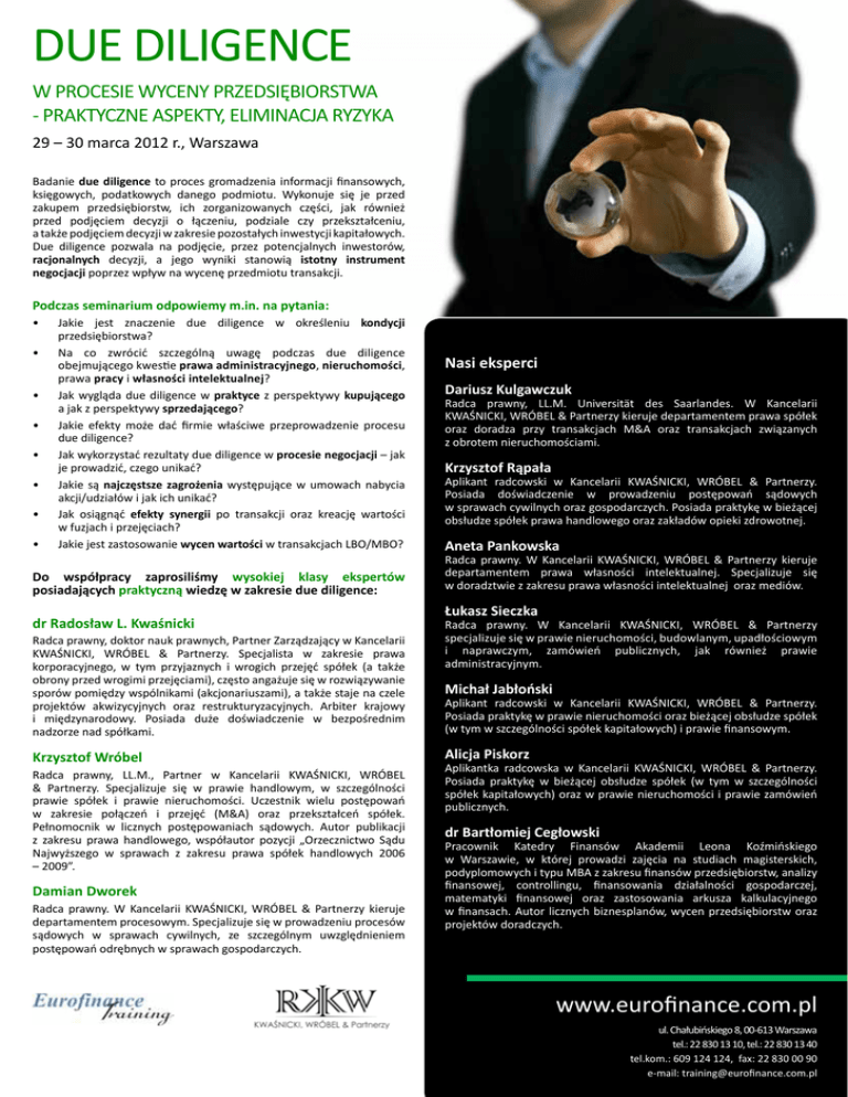 DUE DILIGENCE W PROCESIE WYCENY PRZEDSIĘBIORSTWA - PRAKTYCZNE ASPEKTY, ELIMINACJA RYZYKA 29 – 30 marca 2012 r., Warszawa Badanie due diligence to proces gromadzenia informacji finansowych, księgowych, podatkowych danego podmiotu. Wykonuje się je przed zakupem przedsiębiorstw, ich zorganizowanych części, jak również przed podjęciem decyzji o łączeniu, podziale czy przekształceniu, a także podjęciem decyzji w zakresie pozostałych inwestycji kapitałowych. Due diligence pozwala na podjęcie, przez potencjalnych inwestorów, racjonalnych decyzji, a jego wyniki stanowią istotny instrument negocjacji poprzez wpływ na wycenę przedmiotu transakcji. Podczas seminarium odpowiemy m.in. na pytania: • • • • • • • • Jakie jest znaczenie due diligence w określeniu kondycji przedsiębiorstwa? Na co zwrócić szczególną uwagę podczas due diligence obejmującego kwestie prawa administracyjnego, nieruchomości, prawa pracy i własności intelektualnej? Jak wygląda due diligence w praktyce z perspektywy kupującego a jak z perspektywy sprzedającego? Jakie efekty może dać firmie właściwe przeprowadzenie procesu due diligence? Jak wykorzystać rezultaty due diligence w procesie negocjacji – jak je prowadzić, czego unikać? Jakie są najczęstsze zagrożenia występujące w umowach nabycia akcji/udziałów i jak ich unikać? Jak osiągnąć efekty synergii po transakcji oraz kreację wartości w fuzjach i przejęciach? Jakie jest zastosowanie wycen wartości w transakcjach LBO/MBO? Do współpracy zaprosiliśmy wysokiej klasy ekspertów posiadających praktyczną wiedzę w zakresie due diligence: dr Radosław L. Kwaśnicki Radca prawny, doktor nauk prawnych, Partner Zarządzający w Kancelarii KWAŚNICKI, WRÓBEL & Partnerzy. Specjalista w zakresie prawa korporacyjnego, w tym przyjaznych i wrogich przejęć spółek (a także obrony przed wrogimi przejęciami), często angażuje się w rozwiązywanie sporów pomiędzy wspólnikami (akcjonariuszami), a także staje na czele projektów akwizycyjnych oraz restrukturyzacyjnych. Arbiter krajowy i międzynarodowy. Posiada duże doświadczenie w bezpośrednim nadzorze nad spółkami. Krzysztof Wróbel Radca prawny, LL.M., Partner w Kancelarii KWAŚNICKI, WRÓBEL & Partnerzy. Specjalizuje się w prawie handlowym, w szczególności prawie spółek i prawie nieruchomości. Uczestnik wielu postępowań w zakresie połączeń i przejęć (M&A) oraz przekształceń spółek. Pełnomocnik w licznych postępowaniach sądowych. Autor publikacji z zakresu prawa handlowego, współautor pozycji „Orzecznictwo Sądu Najwyższego w sprawach z zakresu prawa spółek handlowych 2006 – 2009”. Damian Dworek Radca prawny. W Kancelarii KWAŚNICKI, WRÓBEL & Partnerzy kieruje departamentem procesowym. Specjalizuje się w prowadzeniu procesów sądowych w sprawach cywilnych, ze szczególnym uwzględnieniem postępowań odrębnych w sprawach gospodarczych. Nasi eksperci Dariusz Kulgawczuk Radca prawny, LL.M. Universität des Saarlandes. W Kancelarii KWAŚNICKI, WRÓBEL & Partnerzy kieruje departamentem prawa spółek oraz doradza przy transakcjach M&A oraz transakcjach związanych z obrotem nieruchomościami. Krzysztof Rąpała Aplikant radcowski w Kancelarii KWAŚNICKI, WRÓBEL & Partnerzy. Posiada doświadczenie w prowadzeniu postępowań sądowych w sprawach cywilnych oraz gospodarczych. Posiada praktykę w bieżącej obsłudze spółek prawa handlowego oraz zakładów opieki zdrowotnej. Aneta Pankowska Radca prawny. W Kancelarii KWAŚNICKI, WRÓBEL & Partnerzy kieruje departamentem prawa własności intelektualnej. Specjalizuje się w doradztwie z zakresu prawa własności intelektualnej oraz mediów. Łukasz Sieczka Radca prawny. W Kancelarii KWAŚNICKI, WRÓBEL & Partnerzy specjalizuje się w prawie nieruchomości, budowlanym, upadłościowym i naprawczym, zamówień publicznych, jak również prawie administracyjnym. Michał Jabłoński Aplikant radcowski w Kancelarii KWAŚNICKI, WRÓBEL & Partnerzy. Posiada praktykę w prawie nieruchomości oraz bieżącej obsłudze spółek (w tym w szczególności spółek kapitałowych) i prawie finansowym. Alicja Piskorz Aplikantka radcowska w Kancelarii KWAŚNICKI, WRÓBEL & Partnerzy. Posiada praktykę w bieżącej obsłudze spółek (w tym w szczególności spółek kapitałowych) oraz w prawie nieruchomości i prawie zamówień publicznych. dr Bartłomiej Cegłowski Pracownik Katedry Finansów Akademii Leona Koźmińskiego w Warszawie, w której prowadzi zajęcia na studiach magisterskich, podyplomowych i typu MBA z zakresu finansów przedsiębiorstw, analizy finansowej, controllingu, finansowania działalności gospodarczej, matematyki finansowej oraz zastosowania arkusza kalkulacyjnego w finansach. Autor licznych biznesplanów, wycen przedsiębiorstw oraz projektów doradczych. www.eurofinance.com.pl ul. Chałubińskiego 8, 00-613 Warszawa tel.: 22 830 13 10, tel.: 22 830 13 40 tel.kom.: 609 124 124, fax: 22 830 00 90 e-mail: [email protected] Dzień Pierwszy Dzień Drugi 29 marca 2012 roku 30 marca 2012 roku 8.30 – 9.00 Rejestracja. Wprowadzenie. 8.30 – 9.00 Wprowadzenie 9.00 – 10.00 POJĘCIE DUE DILIGENCE I ZNACZENIE W DIAGNOZIE PRZEDSIĘBIORSTWA. STRATEGICZNE, FINANSOWE I PODATKOWE DUE DILIGENCE • cele i zakres analizy • przykłady identyfikowanych ryzyk i możliwości ich zaadresowania • omówienie, charakterystyka rożnych typów oraz rodzajów due diligence • kontekst badania due diligence • cele stron w procesie due diligence 9.00 – 10.30 WYCENA WARTOŚCI W PROCESACH DUE DILIGENCE • rodzaje wartości - wprowadzenie • proces wyceny firmy. Perspektywa sprzedawcy a perspektywa nabywcy • przegląd podstawowych metod wyceny • wady i zalety metod majątkowych, dochodowych i porównawczych • praktyczne możliwości zastosowania • prezentacja wycen wybranych przedsiębiorstw 10.00 – 11.30 OBSZARY I CEL DUE DILIGENCE • ochrona informacji poufnych i taje