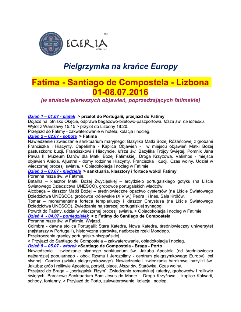Pielgrzymka na krańce Europy Fatima - Santiago de Compostela - Lizbona 01-08.07.2016 [w stulecie pierwszych objawień, poprzedzających fatimskie] Dzień 1 – 01.07 - piątek > przelot do Portugalii, przejazd do Fatimy Dojazd na lotnisko Okęcie, odprawa bagażowo-biletowo-paszportowa. Msza św. na lotnisku. Wylot z Warszawy 15:15 > przylot do Lizbony 18:20. Przejazd do Fatimy - zakwaterowanie w hotelu, kolacja i nocleg. Dzień 2 – 02.07 - sobota > Fatima Nawiedzenie i zwiedzanie sanktuarium maryjnego: Bazylika Matki Bożej Różańcowej z grobami Franciszka i Hiacynty. Capelinha - Kaplica Objawień - w miejscu objawień Matki Bożej pastuszkom: Łucji, Franciszkowi i Hiacyncie. Msza św. Bazylika Trójcy Świętej. Pomnik Jana Pawła II. Muzeum Darów dla Matki Bożej Fatimskiej, Droga Krzyżowa. Valinhos - miejsce objawień Anioła. Aljustrel - domy rodzinne Hiacynty, Franciszka i Łucji. Czas wolny. Udział w wieczornej procesji światła. > Obiadokolacja i nocleg w Fatimie. Dzień 3 – 03.07 - niedziela > sanktuaria, klasztory i fortece wokól Fatimy Poranna msza św. w Fatimie. Batalha – klasztor Matki Bożej Zwycięskiej – arcydzieło portugalskiego gotyku (na Liście Światowego Dziedzictwa UNESCO), grobowce portugalskich władców. Alcobaça – klasztor Matki Bożej – średniowieczne opactwo cystersów (na Liście Światowego Dziedzictwa UNESCO), grobowce królewskie (XIV w.) Pedra I i Ines, Sala Królów. Tomar – monumentalna forteca templariuszy i klasztor Chrystusa (na Liście Światowego Dziedzictwa UNESCO). Zwiedzanie najstarszej portugalskiej synagogi. Powrót do Fatimy, udział w wieczornej procesji światła. > Obiadokolacja i nocleg w Fatimie. Dzień 4 - 04.07 - poniedziałek > z Fatimy do Santiago de Compostela Poranna msza św. w Fatimie. Wyjazd. Coimbra - dawna stolica Portugalii: Stara Katedra, Nowa Katedra, średniowieczny uniwersytet (najstarszy w Portugalii), historyczna starówka, nadbrzeże rzeki Mondego. Przekroczenie granicy portugalsko-hiszpańskiej. > Przyjazd do Santiago de Compostela – zakwaterowanie, obiadokolacja i nocleg. Dzień 5 – 05.07 - wtorek >Santiago de Compostela - Braga - Porto Nawiedzenie i zwiedzanie słynnego sanktuarium św. Jakuba Apostoła (od średniowiecza najbardziej popularnego - obok Rzymu i Jerozolimy - centrum pielgrzymkowego Europy), cel słynnej Camino (szlaku pielgrzymkowego). Nawiedzenie i zwiedzanie barokowej bazyliki św. Jakuba: grób i relikwie Apostoła, portyki, place. Msza św. Starówka. Czas wolny. Przejazd do Braga – „portugalski Rzym”. Zwiedzanie romańskiej katedry, grobowców i relikwie świętych. Barokowe Sanktuarium Bom Jesus do Monte – Droga Krzyżowa – kaplice Kalwarii, schody, fontanny. > Przyjazd do Porto, zakwaterowanie, kolacja i nocleg. Dzień 6 – 06.07- środa > Porto - nad Atlantykiem - Lizbona Porto – drugie co do wielkości miasto Portugalii (na liście Światowego Dziedzictwa UNESCO), położone malowniczo nad Atlantykiem i nad rzeką Douro. Zwiedzanie: katedra romańska, kościół św. Franciszka, kościoły barokowe i rokokowe. Msza św. Port, starówka Ribeira, historyczne mosty. Dekoracje azulejos. Villa Nova de Gaia, gdzie produkuje się słynne wino Porto. Nazare – położone na skalistym wybrzeżu Atlantyku. Kaplica Matki Bożej da Memoria, barokowy kościół Matki Bożej z Nazare, dzielnica Sitio. Relaks na plaży, kąpiel. Cabo da Roca – urwisty klif skalny (wys. 140 m.), najdalej na zachód wysunięty punkt Europy. > Przyjazd do Lizbony, zakwaterowanie, obiadokolacja. Dzień 7 – 07.07- czwartek > z Lizbona Zwiedzanie stolicy Portugalii. Średniowieczna katedra Se, kościół św. Antoniego Padewskiego wzniesiony w miejscu jego urodzenia i domu rodzinnego. Msza św. Kościół dominikanów. Historyczne dzielnice Lizbony: Baixa, Rossio, Alfama (starówka), Bairro - panorama. Czas wolny. Nad Tybrem - Wieża Belem, Pomnik Odkrywców, Wspaniały renesansowy klasztor Hieronimitów. Grobowce królewskie, odkrywców i artystów. Obiadokolacja i nocleg w Lizbonie. Dzień 8 – 08.07 - piątek > powrót do Polski Wylot z Lizbony 09:30. Przylot do Warszawy, godz. 14:25. WARUNKI organizacyjno-programowe i podstawowe informacje Koszt pielgrzymki: 1700 zł i 525 euro – gwarantowany i całkowity wpłata przy zapisie: 1000 zł i 200 euro - na konto lub w biurze „Egerii”, druga wpłata: 700 zł i 300 euro - na konto lub w biurze „Egerii” wpłata na miejscu u pilota w Portugalii – 25 euro Wpłaty na: „Egeria”, 20-109 Lublin, ul. Królewska 9 - dopisek: „Gr.08 - Fatima” konto na wpłaty złotówkowe: 49 1910 1048 2303 0431 5791 0004 konto na wpłaty euro: 06 1910 1048 2303 0431 5791 0002 (kod SWIFT: DEUTPLPX) Koszt pielgrzymki obejmuje: Bilet lotniczy Warszawa - Lizbona - Warszawa. Hotele kat.***, pokoje 2 i 3 os. z łazienkami. Dwa posiłki dziennie - śniadanie i obiadokolacja. Autokar z klimatyzacją. Wstępy - wszystkie (!) opłaca organizator. Przewodnik polski, przewodnicy lokalni, obsługa biura turystycznego. Ubezpieczenie turystyczne w okresie trwania pielgrzymki (KL, NNW, bagaż). Uwagi: * Zapisy według kolejności zgłoszeń i wniesionej przedpłaty (ilość miejsc limitowana) * Dopłata na życzenie do pokoju jednoosobowego wynosi + 140 euro. * Każdego dnia celebrowana będzie msza św. w jednym z sanktuariów. * W programie także zwiedzanie innych sanktuariów, zabytków oraz dodatkowe atrakcje pielgrzymkowe, krajoznawcze i turystyczne. Kolejność realizacji programu może ulec modyfikacjom z powodu zewnętrznych okoliczności. * Przed pielgrzymką odbędzie w się spotkanie organizacyjno-informacyjne. * Możliwość zawarcia dodatkowego ubezp. od chorób przewlekłych i kosztów rezygnacji. Dokumenty: dowód osobisty lub paszport - ważne co najmniej pół roku od rozpoczęcia pielgrzymki. Kontakt: „Egeria - Pielgrzymki”, 20-109 Lublin, ul. Królewska 9, tel. 510398373, 690298759