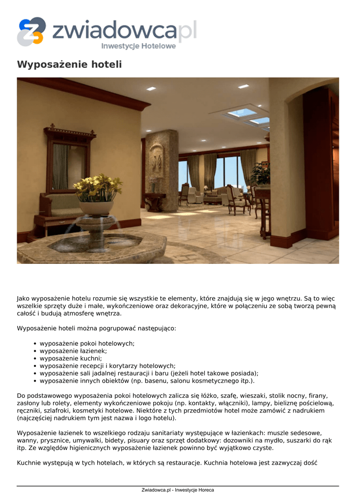 Wyposażenie hoteli Jako wyposażenie hotelu rozumie się wszystkie te elementy, które znajdują się w jego wnętrzu. Są to więc wszelkie sprzęty duże i małe, wykończeniowe oraz dekoracyjne, które w połączeniu ze sobą tworzą pewną całość i budują atmosferę wnętrza. Wyposażenie hoteli można pogrupować następująco: wyposażenie wyposażenie wyposażenie wyposażenie wyposażenie wyposażenie pokoi hotelowych; łazienek; kuchni; recepcji i korytarzy hotelowych; sali jadalnej restauracji i baru (jeżeli hotel takowe posiada); innych obiektów (np. basenu, salonu kosmetycznego itp.). Do podstawowego wyposażenia pokoi hotelowych zalicza się łóżko, szafę, wieszaki, stolik nocny, firany, zasłony lub rolety, elementy wykończeniowe pokoju (np. kontakty, włączniki), lampy, bieliznę pościelową, ręczniki, szlafroki, kosmetyki hotelowe. Niektóre z tych przedmiotów hotel może zamówić z nadrukiem (najczęściej nadrukiem tym jest nazwa i logo hotelu). Wyposażenie łazienek to wszelkiego rodzaju sanitariaty występujące w łazienkach: muszle sedesowe, wanny, prysznice, umywalki, bidety, pisuary oraz sprzęt dodatkowy: dozowniki na mydło, suszarki do rąk itp. Ze względów higienicznych wyposażenie łazienek powinno być wyjątkowo czyste. Kuchnie występują w tych hotelach, w których są restauracje. Kuchnia hotelowa jest zazwyczaj dość Zwiadowca.pl - Inwestycje Horeca obszernym pomieszczeniem. Do jej podstawowego wyposażenia zalicza się: lodówka, zamrażarka, kuchnia gazowa lub elektryczna, piekarnik, piec, zmywarka, blaty robocze, półki i szafki na żywność i drobny sprzęt kuchenny (np. mikser). Wyposażenie recepcji to przede wszystkim lada, na której (lub też pod którą) znajduje się komputer z zainstalowanym programem do sprawnej obsługi hotelowej (w programie tym pracownik może łatwo zameldować i wymeldować gościa, zarezerwować pokój oraz wprowadzić informację o dodatkowych usługach, z których klient zmierza skorzystać). Na korytarzu mogą się pojawić pojedyncze meble dekoracyjne (np. konsole), obrazy, lustra, lampy. W szerszych częściach korytarza ustawiony jest czasami stół i sofy. Do wyposażenia sali jadalnej w restauracji zaliczamy stoły i krzesła (opcjonalnie sofy, kanapy itp.) oraz obrusy, naczynia, sztućce, serwety, firany, zasłony, lampy oraz dodatkowe elementy dekoracyjne. Pozostałe obiekty hotelowe (basen, salon kosmetyczny) wymagają zazwyczaj specjalistycznego wyposażenia (np. fotele kosmetyczne). W celu zapewnienia optymalnego połączenia wymienionych wyżej przedmiotów, hotele bardzo często korzystają z usług profesjonalnego projektanta wnętrz. Zajmuje się on nie tylko stworzeniem projektu wnętrza. Do jego obowiązków należy także załatwienie wszelkich formalności związanych z dostawą konkretnych sprzętów do hotelu. Zwiadowca.pl - Inwestycje Horeca Powered by TCPDF (www.tcpdf.org)