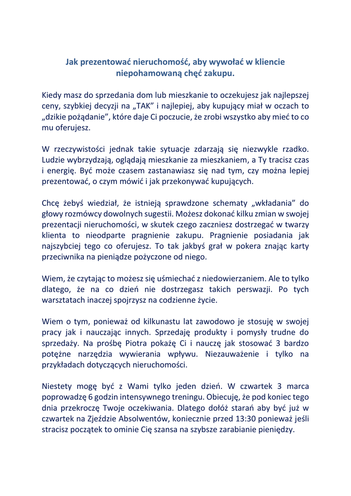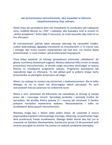 Jak prezentować nieruchomość, aby wywołać w kliencie niepohamowaną chęć zakupu. Kiedy masz do sprzedania dom lub mieszkanie to oczekujesz jak najlepszej ceny, szybkiej decyzji na „TAK” i najlepiej, aby kupujący miał w oczach to „dzikie pożądanie”, które daje Ci poczucie, że zrobi wszystko aby mieć to co mu oferujesz. W rzeczywistości jednak takie sytuacje zdarzają się niezwykle rzadko. Ludzie wybrzydzają, oglądają mieszkanie za mieszkaniem, a Ty tracisz czas i energię. Być może czasem zastanawiasz się nad tym, czy można lepiej prezentować, o czym mówić i jak przekonywać kupujących. Chcę żebyś wiedział, że istnieją sprawdzone schematy „wkładania” do głowy rozmówcy dowolnych sugestii. Możesz dokonać kilku zmian w swojej prezentacji nieruchomości, w skutek czego zaczniesz dostrzegać w twarzy klienta to nieodparte pragnienie zakupu. Pragnienie posiadania jak najszybciej tego co oferujesz. To tak jakbyś grał w pokera znając karty przeciwnika na pieniądze pożyczone od niego. Wiem, że czytając to możesz się uśmiechać z niedowierzaniem. Ale to tylko dlatego, że na co dzień nie dostrzegasz takich perswazji. Po tych warsztatach inaczej spojrzysz na codzienne życie. Wiem o tym, ponieważ od kilkunastu lat zawodowo je stosuję w swojej pracy jak i nauczając innych. Sprzedaję produkty i pomysły trudne do sprzedaży. Na prośbę Piotra pokażę Ci i nauczę jak stosować 3 bardzo potężne narzędzia wywierania wpływu. Niezauważenie i tylko na przykładach dotyczących nieruchomości. Niestety mogę być z Wami tylko jeden dzień. W czwartek 3 marca poprowadzę 6 godzin intensywnego treningu. Obiecuję, że pod koniec tego dnia przekroczę Twoje oczekiwania. Dlatego dołóż starań aby być już w czwartek na Zjeździe Absolwentów, koniecznie przed 13:30 ponieważ jeśli stracisz początek to ominie Cię szansa na szybsze zarabianie pieniędzy. O Trenerze: Adam Grzesik przeszedł drogę od przedstawiciela handlowego w Wedlu do Dyrektora Generalnego w największej firmie dystrybucji spożywczej w Polsce – Tradis (obecnie Eurocash). Od 7 lat z powodzeniem prowadzi swoje własne firmy. Mówi się o nim, że jest jednym z nielicznych praktyków tego czego naucza. Każde warsztaty naszpikowane są umiejętnościami, z których natychmiast korzystasz. Klienci najbardziej cenią go za „podwajanie majątku co rok”. To jego unikalność rynkowa.