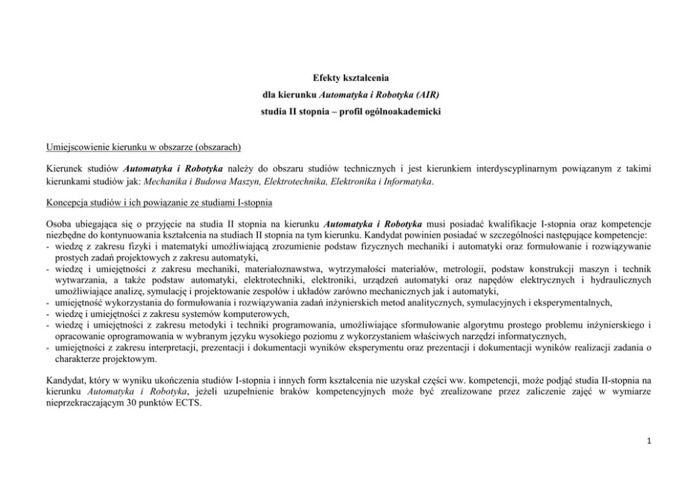 Efekty kształcenia dla kierunku Automatyka i Robotyka (AIR) studia II stopnia – profil ogólnoakademicki Umiejscowienie kierunku w obszarze (obszarach) Kierunek studiów Automatyka i Robotyka należy do obszaru studiów technicznych i jest kierunkiem interdyscyplinarnym powiązanym z takimi kierunkami studiów jak: Mechanika i Budowa Maszyn, Elektrotechnika, Elektronika i Informatyka. Koncepcja studiów i ich powiązanie ze studiami I-stopnia Osoba ubiegająca się o przyjęcie na studia II stopnia na kierunku Automatyka i Robotyka musi posiadać kwalifikacje I-stopnia oraz kompetencje niezbędne do kontynuowania kształcenia na studiach II stopnia na tym kierunku. Kandydat powinien posiadać w szczególności następujące kompetencje: - wiedzę z zakresu fizyki i matematyki umożliwiającą zrozumienie podstaw fizycznych mechaniki i automatyki oraz formułowanie i rozwiązywanie prostych zadań projektowych z zakresu automatyki, - wiedzę i umiejętności z zakresu mechaniki, materiałoznawstwa, wytrzymałości materiałów, metrologii, podstaw konstrukcji maszyn i technik wytwarzania, a także podstaw automatyki, elektrotechniki, elektroniki, urządzeń automatyki oraz napędów elektrycznych i hydraulicznych umożliwiające analizę, symulację i projektowanie zespołów i układów zarówno mechanicznych jak i automatyki, - umiejętność wykorzystania do formułowania i rozwiązywania zadań inżynierskich metod analitycznych, symulacyjnych i eksperymentalnych, - wiedzę i umiejętności z zakresu systemów komputerowych, - wiedzę i umiejętności z zakresu metodyki i techniki programowania, umożliwiające sformułowanie algorytmu prostego problemu inżynierskiego i opracowanie oprogramowania w wybranym języku wysokiego poziomu z wykorzystaniem właściwych narzędzi informatycznych, - umiejętności z zakresu interpretacji, prezentacji i dokumentacji wyników eksperymentu oraz prezentacji i dokumentacji wyników realizacji zadania o charakterze projektowym. Kandydat, który w wyniku ukończenia studiów I-stopnia i innych form kształcenia nie uzyskał części ww. kompetencji, może podjąć studia II-stopnia na kierunku Automatyka i Robotyka, jeżeli uzupełnienie braków kompetencyjnych może być zrealizowane przez zaliczenie zajęć w wymiarze nieprzekraczającym 30 punktów ECTS. 1 Objaśnienie oznaczeń: K – kierunkowe efekty kształcenia, W – kategoria wiedzy, U – kategoria umiejętności, K (po podkreślniku) - kategoria kompetencji społecznych, OT2A – efekty kształcenia dla kwalifikacji II stopnia w obszarze kształcenia odpowiadającym obszarowi nauk technicznych. Na kierunku Automatyka i Robotyka (AIR) prowadzone są dwie specjalności: Systemy Produkcyjne (SP) oraz Automatyzacja Maszyn i Procesów Roboczych (AMiPR). Gdzie: K1xxx – symbol dla kierunku na I stopniu studiów K2xxx – symbol dla kierunku na II stopniu studiów 2 SIATKA PODSTAWOWA DLA WSZYSTKICH SPECJALNOŚCI Efekty Kształcenia na II stopniu studiów dla kierunku (AIR) OPIS KIERUNKOWYCH EFEKTÓW KSZTAŁCENIA Po zakończeniu studiów II stopnia na kierunku AIR Odniesienie efektów kształcenia dla obszaru nauk technicznych (T), WIEDZA K2AIR_W01 Ma poszerzoną i pogłębioną wiedzę w zakresie niektórych działów matematyki i sterowania, obejmującą elementy matematyki dyskretnej i stosowanej oraz metody optymalizacji, w tym metody matematyczne niezbędne do: - identyfikacji własności złożonych elementów i układów zarówno mechanicznych jak i automatyki, - modelowania i analizy działania zaawansowanych elementów i zespołów mechanicznych oraz urządzeń i układów automatyki, a także zjawisk fizycznych w nich występujących, - opisu i analizy działania oraz syntezy złożonych systemów mechanicznych i automatyki, - programowania liniowego, określania warunków optymalności oraz metod nieliniowej optymalizacji lokalnej bez ograniczeń i z ograniczeniami, - optymalizacji dyskretnej, niedeterministycznej optymalizacji globalnej i algorytmów ewolucyjnych. T2A_W01 T2A_W02 T2A_W03 K2AIR_W02 Ma podbudowaną teoretycznie szczegółową wiedzę o dynamicznych układach dyskretnych, równaniach dynamiki, zasadzie zachowania energii, równaniach Lagrange’a oraz formach drgań i ich parametrach. T2A_W04 K2AIR_W03 Ma szczegółową wiedzę z zakresu budowy, działania, metod analizy i projektowania mechatronicznych zespołów maszyn, urządzeń i pojazdów. T2A_W02 K2AIR_W04 Ma pogłębioną i rozszerzoną wiedzę dotyczą technik projektowania mechatronicznych układów napędowych maszyn lub ma szczegółową wiedzę dotyczącą wymagań związanych z projektowaniem procesów montażowych lub T2A_W05 3 ma pogłębioną i rozszerzoną wiedzę dotyczącą aspektów projektowania procesów wytwarzania z wykorzystaniem systemów wspomagania komputerowego. K2AIR_W05 Ma pogłębioną i rozszerzoną wiedzę o zasadach realizacji złożonych zadań inżynierskich a także ich opisu, dokumentowania oraz prezentacji. T2A_W07 K2AIR_W06 Ma pogłębioną i rozszerzoną wiedzę dotyczącą realizacji złożonych przedsięwzięć inżynierskich z zakresu automatyki i robotyki, spełniających założone wymagania. T2A_W04 T2A_W11 K2AIR_W07 Ma podstawową wiedzę niezbędną do rozumienia społecznych funkcji komunikowania w działalności inżynierskiej. T2A_W08 K2AIR_W08 Ma podstawową wiedzę o technologiach w cywilizacjach oraz trendach rozwojowych w technice, niezbędną do rozumienia społecznych i politycznych uwarunkowań działalności inżynierskich. T2A_W08 K2AIR_W09 Osiąga efekty w kategorii WIEDZA dla jednej z następujących specjalności: - Systemy Produkcyjne (SP) – Załącznik 1 - Automatyzacja Maszyn i Procesów Roboczych (AMiPR) – Załącznik 2 UMIEJĘTNOŚCI K2AIR_U01 Potrafi dokonywać doświadczalnej identyfikacji złożonych elementów i układów automatyki; potrafi także przeprowadzać badania symulacyjne zachowania się zespołów i układów automatyki. Potra
