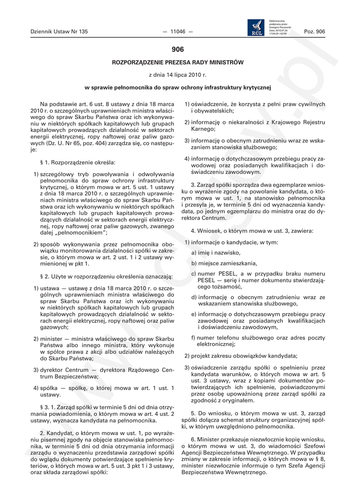 Dziennik Ustaw Nr 135 — 11046 — Elektronicznie podpisany przez Grzegorz Paczowski Data: 2010.07.26 17:04:29 +02'00' Poz. 906 .go v.p l 906 ROZPORZĄDZENIE PREZESA RADY MINISTRÓW z dnia 14 lipca 2010 r. w sprawie pełnomocnika do spraw ochrony infrastruktury krytycznej Na podstawie art. 6 ust. 8 ustawy z dnia 18 marca 2010 r. o szczególnych uprawnieniach ministra właściwego do spraw Skarbu Państwa oraz ich wykonywaniu w niektórych spółkach kapitałowych lub grupach kapitałowych prowadzących działalność w sektorach energii elektrycznej, ropy naftowej oraz paliw gazowych (Dz. U. Nr 65, poz. 404) zarządza się, co następuje: § 1. Rozporządzenie określa: 1) szczegółowy tryb powoływania i odwoływania pełnomocnika do spraw ochrony infrastruktury krytycznej, o którym mowa w art. 5 ust. 1 ustawy z dnia 18 marca 2010 r. o szczególnych uprawnieniach ministra właściwego do spraw Skarbu Państwa oraz ich wykonywaniu w niektórych spółkach kapitałowych lub grupach kapitałowych prowadzących działalność w sektorach energii elektrycznej, ropy naftowej oraz paliw gazowych, zwanego dalej „pełnomocnikiem”; 2) informację o niekaralności z Krajowego Rejestru Karnego; 3) informację o obecnym zatrudnieniu wraz ze wskazaniem stanowiska służbowego; 4) informację o dotychczasowym przebiegu pracy zawodowej oraz posiadanych kwalifikacjach i doświadczeniu zawodowym. 3. Zarząd spółki sporządza dwa egzemplarze wniosku o wyrażenie zgody na powołanie kandydata, o którym mowa w ust. 1, na stanowisko pełnomocnika i przesyła je, w terminie 5 dni od wyznaczenia kandydata, po jednym egzemplarzu do ministra oraz do dyrektora Centrum. 4. Wniosek, o którym mowa w ust. 3, zawiera: 1) informacje o kandydacie, w tym: rcl 2) sposób wykonywania przez pełnomocnika obowiązku monitorowania działalności spółki w zakresie, o którym mowa w art. 2 ust. 1 i 2 ustawy wymienionej w pkt 1. 1) oświadczenie, że korzysta z pełni praw cywilnych i obywatelskich; § 2. Użyte w rozporządzeniu określenia oznaczają: w. 1) ustawa — ustawę z dnia 18 marca 2010 r. o szczególnych uprawnieniach ministra właściwego do spraw Skarbu Państwa oraz ich wykonywaniu w niektórych spółkach kapitałowych lub grupach kapitałowych prowadzących działalność w sektorach energii elektrycznej, ropy naftowej oraz paliw gazowych; 2) minister — ministra właściwego do spraw Skarbu Państwa albo innego ministra, który wykonuje w spółce prawa z akcji albo udziałów należących do Skarbu Państwa; ww 3) dyrektor Centrum — dyrektora Rządowego Centrum Bezpieczeństwa; 4) spółka — spółkę, o której mowa w art. 1 ust. 1 ustawy. § 3. 1. Zarząd spółki w terminie 5 dni od dnia otrzymania powiadomienia, o którym mowa w art. 4 ust. 2 ustawy, wyznacza kandydata na pełnomocnika. 2. Kandydat, o którym mowa w ust. 1, po wyrażeniu pisemnej zgody na objęcie stanowiska pełnomocnika, w terminie 5 dni od dnia otrzymania informacji zarządu o wyznaczeniu przedstawia zarządowi spółki do wglądu dokumenty potwierdzające spełnienie kryteriów, o których mowa w art. 5 ust. 3 pkt 1 i 3 ustawy, oraz składa zarządowi spółki: a) imię i nazwisko, b) miejsce zamieszkania, c) numer PESEL, a w przypadku braku numeru PESEL — serię i numer dokumentu stwierdzającego tożsamość, d) informację o obecnym zatrudnieniu wraz ze wskazaniem stanowiska służbowego, e) informację o dotychczasowym przebiegu pracy zawodowej oraz posiadanych kwalifikacjach i doświadczeniu zawodowym, f) numer telefonu służbowego oraz adres poczty elektronicznej; 2) projekt zakresu obowiązków kandydata; 3) oświadczenie zarządu spółki o spełnieniu przez kandydata warunków, o których mowa w art. 5 ust. 3 ustawy, wraz z kopiami dokumentów potwierdzających ich spełnienie, poświadczonymi przez osobę upoważnioną przez zarząd spółki za zgodność z oryginałem. 5. Do wniosku, o którym mowa w ust. 3, zarząd spółki dołącza schemat struktury organizacyjnej spółki, w którym uwzględniono pełnomocnika. 6. Minister przekazuje niezwłocznie kopię wniosku, o którym mowa w ust. 3, do wiadomości Szefowi Agencji Bezpieczeństwa Wewnętrznego. W przypadku zmiany w zakresie informacji, o których mowa w § 8, minister niezwłocznie informuje o tym Szefa Agencji Bezpieczeństwa Wewnętrznego. Dziennik Ustaw Nr 135 — 11047 — 2. Zarząd spółki sporządza dwa egzemplarze wniosku o wyrażenie zgody na odwołanie pełnomocnika i przesyła je, po jednym egzemplarzu, odpowiednio do ministra oraz do dyrektora Centrum. Przepis § 3 ust. 6 zdanie pierwsze stosuje się odpowiednio. .go v.p l § 4. 1. Minister rozpatruje wniosek, o którym mowa w § 3 ust. 3, w terminie 5 dni od dnia jego otrzymania, w tym w szczególności: Poz. 906 1) sprawdza kompletność wniosku pod względem formalnym; 2) analizuje informacje zawarte we wniosku; 3) przeprowadza rozmowę z kandydatem na pełnomocnika, w trakcie której sprawdza, czy kandydat na pełnomocnika daje rękojmię prawidłowego wykonywania obowiązków. 2. Po rozpatrzeniu wniosku, o którym mowa w § 3 ust. 3, minister: 1) wyraża zgodę na powołanie kandydata na stanowisko pełnomocnika albo 3. Wniosek, o którym mowa w ust. 2, zawiera: 1) imię i nazwisko pełnomocnika; 2) wskazanie daty powołania pełnomocnika; 3) kopie zgód wydanych zgodnie z § 4 ust. 2 pkt 1, dotyczących odwoływanego pełnomocnika; 4) uzasadnienie wniosku obejmujące w szczególności wskazanie przyczyn uzasadniających odwołanie pełnomocnika. 3. W przypadku gdy wniosek, o którym mowa w § 3 ust. 3, jest niekompletny: 4. W przypadku złożenia wniosku o odwołanie pełnomocnika zarząd spółki jest zobowiązany złożyć jednocześnie wniosek, o którym mowa w § 3 ust. 3, dotyczący powołania następnego pełnomocnika, z wyjątkiem sytuacji, w której odwołanie pełnomocnika jest związane ze zniesieniem obowiązku utrzymywania takiego stanowiska w spółce. 1) minister