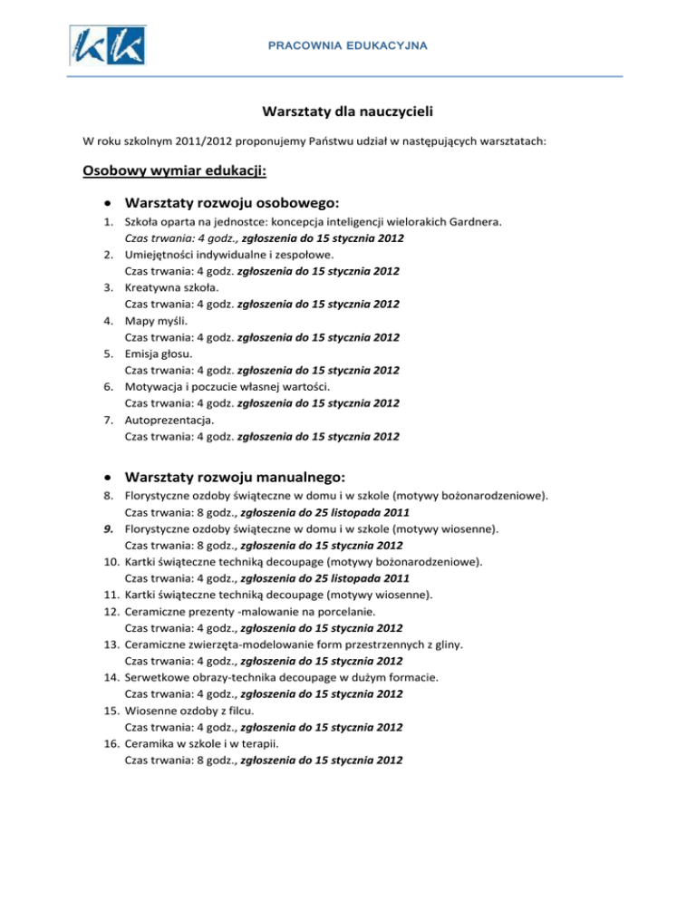 PRACOWNIA EDUKACYJNA Warsztaty dla nauczycieli W roku szkolnym 2011/2012 proponujemy Państwu udział w następujących warsztatach: Osobowy wymiar edukacji: Warsztaty rozwoju osobowego: 1. Szkoła oparta na jednostce: koncepcja inteligencji wielorakich Gardnera. Czas trwania: 4 godz., zgłoszenia do 15 stycznia 2012 2. Umiejętności indywidualne i zespołowe. Czas trwania: 4 godz. zgłoszenia do 15 stycznia 2012 3. Kreatywna szkoła. Czas trwania: 4 godz. zgłoszenia do 15 stycznia 2012 4. Mapy myśli. Czas trwania: 4 godz. zgłoszenia do 15 stycznia 2012 5. Emisja głosu. Czas trwania: 4 godz. zgłoszenia do 15 stycznia 2012 6. Motywacja i poczucie własnej wartości. Czas trwania: 4 godz. zgłoszenia do 15 stycznia 2012 7. Autoprezentacja. Czas trwania: 4 godz. zgłoszenia do 15 stycznia 2012 Warsztaty rozwoju manualnego: 8. Florystyczne ozdoby świąteczne w domu i w szkole (motywy bożonarodzeniowe). Czas trwania: 8 godz., zgłoszenia do 25 listopada 2011 9. Florystyczne ozdoby świąteczne w domu i w szkole (motywy wiosenne). Czas trwania: 8 godz., zgłoszenia do 15 stycznia 2012 10. Kartki świąteczne techniką decoupage (motywy bożonarodzeniowe). Czas trwania: 4 godz., zgłoszenia do 25 listopada 2011 11. Kartki świąteczne techniką decoupage (motywy wiosenne). 12. Ceramiczne prezenty -malowanie na porcelanie. Czas trwania: 4 godz., zgłoszenia do 15 stycznia 2012 13. Ceramiczne zwierzęta-modelowanie form przestrzennych z gliny. Czas trwania: 4 godz., zgłoszenia do 15 stycznia 2012 14. Serwetkowe obrazy-technika decoupage w dużym formacie. Czas trwania: 4 godz., zgłoszenia do 15 stycznia 2012 15. Wiosenne ozdoby z filcu. Czas trwania: 4 godz., zgłoszenia do 15 stycznia 2012 16. Ceramika w szkole i w terapii. Czas trwania: 8 godz., zgłoszenia do 15 stycznia 2012 PRACOWNIA EDUKACYJNA Społeczny wymiar edukacji: Warsztaty rozwoju interpersonalnego: 17. Wpływ kreatywności nauczyciela na efektywność i jakość pracy z uczniem – „trening twórczości”. Czas trwania: 4 godz., zgłoszenia do 15 lutego 2012 18. Umiejętności zespołowe („życie po życiu w szkole”). Czas trwania: 4 godz., zgłoszenia do 15 lutego 2012 19. Skuteczna komunikacja (komunikacja inter i intrapersonalna). Czas trwania: 4 godz., zgłoszenia do 15 lutego 2012 20. Rozwiązywanie konfliktów i mediacje kluczową kompetencją nauczyciela. Czas trwania: 4 godz., zgłoszenia do 15 lutego 2012 21. Prowadzenie negocjacji. Czas trwania: 4 godz., zgłoszenia do 15 lutego 2012 22. Radzenie sobie ze stresem. Czas trwania: 4 godz., zgłoszenia do 15 lutego 2012 23. Asertywność w pracy nauczyciela. Czas trwania: 4 godz., zgłoszenia do 15 lutego 2012 24. Wpływ pozytywnego myślenia na efektywność pracy nauczyciela. Czas trwania: 4 godz., zgłoszenia do 15 lutego 2012 25. Trening rozwoju osobistego w obszarze umiejętności psychospołecznych. Czas trwania: 4 godz., zgłoszenia do 15 lutego 2012 Poznawczy wymiar edukacji: Warsztaty rozwoju poznawczego: 26. Wybrane zakresy prawa oświatowego dla nauczycieli. Czas trwania: 8 godz., zgłoszenia do 15 lutego 2012 27. Jak przygotować się do rozmowy kwalifikacyjnej na stopień nauczyciela kontraktowego? Czas trwania: 8 godz., zgłoszenia do 15 lutego 2012 28. Jak przygotować się do egzaminu na stopień nauczyciela mianowanego? Czas trwania: 8 godz., zgłoszenia do 15 lutego 2012 29. Jak przygotować się do rozmowy kwalifikacyjnej na stopień nauczyciela dyplomowanego? Czas trwania: 8 godz., zgłoszenia do 15 lutego 2012 30. Jak być twórczym wychowawcą? Czas trwania: 4 godz., zgłoszenia do 15 lutego 2012 31. Zajęcia z uczniem z niepełnosprawnością intelektualną w stopniu lekkim: rozwiązania praktyczne. Czas trwania: 8 godz., zgłoszenia do 15 lutego 2012 32. Lekcja języka obcego z uczniem z niepełnosprawnością intelektualną w stopniu lekkim: rozwiązania praktyczne. Czas trwania: 4 godz., zgłoszenia do 15 lutego 2012 33. ABC pomocy psychologiczno-pedagogicznej (w świetle nowego rozporządzenia) PRACOWNIA EDUKACYJNA Czas trwania: 4 godz., zgłoszenia do 15 lutego 2012 34. Organizacja indywidualnego wsparcia dla ucznia w ramach pomocy psychologicznopedagogicznej: rozwiązania praktyczne. Czas trwania: 4 godz., zgłoszenia do 15 lutego 2012 35. Jak uczyć się efektywnie? Czas trwania: 4 godz., zgłoszenia do 15 marca 2012 Pragmatyczny wymiar edukacji: Warsztaty rozwoju umiejętności: 36. Fotografowanie i obróbka zdjęć (zasady wykonywania fotografii, obróbka fotografii programach Adobe Photoshop oraz edycja grafiki wektorowej – typu plakat, wizytówka, zaproszenie, itp. w programie Corel) Czas trwania: 16 godz., zgłoszenia do 15 marca 2012 37. Tworzenie muzyki (relaksacja poprzez grę na wybranych instrumentach, muzyczna interpretacja utworów literackich, nagrywanie, edycja, odtwarzanie muzyki z wykorzystaniem wybranych programów komputerowych) Czas trwania: 8 godz., zgłoszenia do 15 marca 2012 38. Tworzenie prezentacji multimedialnych. Czas trwania: 8 godz., zgłoszenia do 15 marca 2012 39. Zajęcia arteterapeutyczne w szkole. Czas trwania: 8 godz., zgłoszenia do 15 marca 2012 40. Wybrane aspekty technologii informacyjnej dla początkujących (elementy edytora tekstu, tworzenie publikacji w programie Microsoft Publisher). Czas trwania: 8 godz., zgłoszenia do 15 marca 2012 41. Multimedia jako środek dydaktyczny (wydawnictwa elektroniczne, internetowe programy edukacyjne itp.) Czas trwania: 8 godz., zgłoszenia do 15 marca 2012 42. Ekstremalna Edukacja Ekologiczna – warsztaty dla grup zorganizowanych (nauczycieli i/lub nauczycieli z uczniami), szczegóły w zakładce NOWOŚĆ Ekstremalna Edukacja Ekologiczna. Istnieje możliwość organizacji zajęć po wcześniejszym ustaleniu terminu i warunków organizacyjnych.
