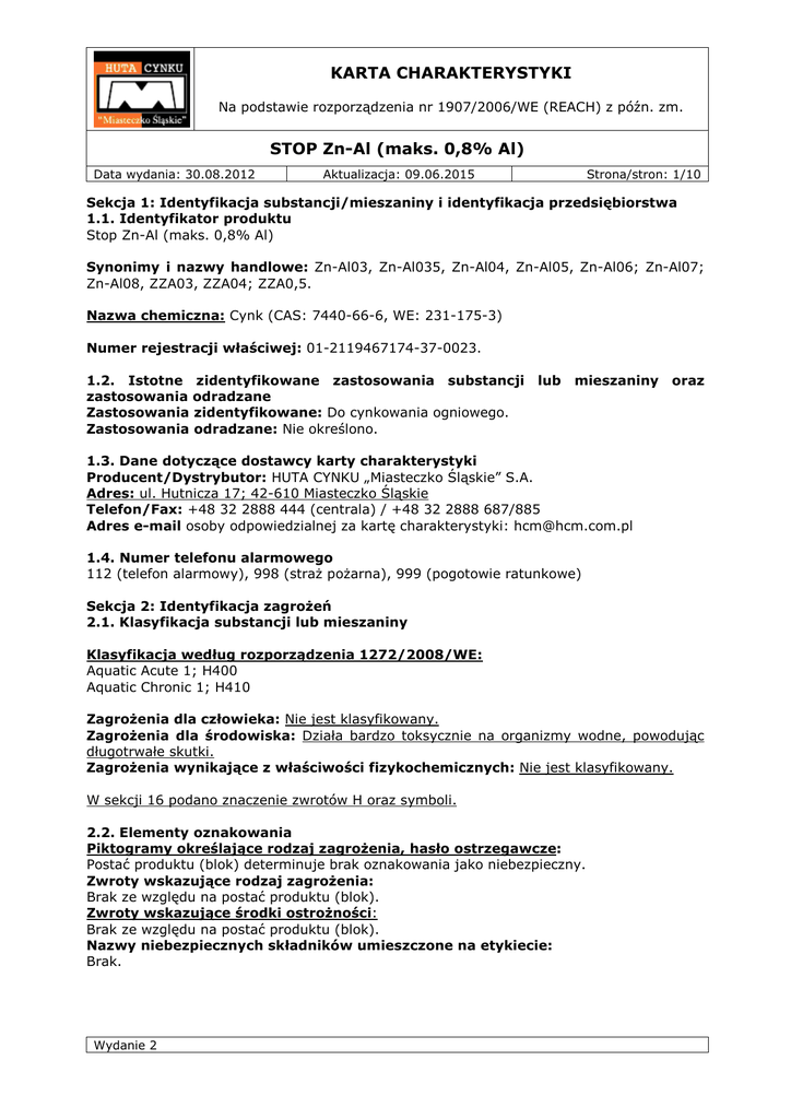 KARTA CHARAKTERYSTYKI Na podstawie rozporządzenia nr 1907/2006/WE (REACH) z późn. zm. STOP Zn-Al (maks. 0,8% Al) Data wydania: 30.08.2012 Aktualizacja: 09.06.2015 Strona/stron: 1/10 Sekcja 1: Identyfikacja substancji/mieszaniny i identyfikacja przedsiębiorstwa 1.1. Identyfikator produktu Stop Zn-Al (maks. 0,8% Al) Synonimy i nazwy handlowe: Zn-Al03, Zn-Al035, Zn-Al04, Zn-Al05, Zn-Al06; Zn-Al07; Zn-Al08, ZZA03, ZZA04; ZZA0,5. Nazwa chemiczna: Cynk (CAS: 7440-66-6, WE: 231-175-3) Numer rejestracji właściwej: 01-2119467174-37-0023. 1.2. Istotne zidentyfikowane zastosowania substancji zastosowania odradzane Zastosowania zidentyfikowane: Do cynkowania ogniowego. Zastosowania odradzane: Nie określono. lub mieszaniny oraz 1.3. Dane dotyczące dostawcy karty charakterystyki Producent/Dystrybutor: HUTA CYNKU „Miasteczko Śląskie” S.A. Adres: ul. Hutnicza 17; 42-610 Miasteczko Śląskie Telefon/Fax: +48 32 2888 444 (centrala) / +48 32 2888 687/885 Adres e-mail osoby odpowiedzialnej za kartę charakterystyki: [email protected] 1.4. Numer telefonu alarmowego 112 (telefon alarmowy), 998 (straż pożarna), 999 (pogotowie ratunkowe) Sekcja 2: Identyfikacja zagrożeń 2.1. Klasyfikacja substancji lub mieszaniny Klasyfikacja według rozporządzenia 1272/2008/WE: Aquatic Acute 1; H400 Aquatic Chronic 1; H410 Zagrożenia dla człowieka: Nie jest klasyfikowany. Zagrożenia dla środowiska: Działa bardzo toksycznie na organizmy wodne, powodując długotrwałe skutki. Zagrożenia wynikające z właściwości fizykochemicznych: Nie jest klasyfikowany. W sekcji 16 podano znaczenie zwrotów H oraz symboli. 2.2. Elementy oznakowania Piktogramy określające rodzaj zagrożenia, hasło ostrzegawcze: Postać produktu (blok) determinuje brak oznakowania jako niebezpieczny. Zwroty wskazujące rodzaj zagrożenia: Brak ze względu na postać produktu (blok). Zwroty wskazujące środki ostrożności: Brak ze względu na postać produktu (blok). Nazwy niebezpiecznych składników umieszczone na etykiecie: Brak. Wydanie 2 KARTA CHARAKTERYSTYKI Na podstawie rozporządzenia nr 1907/2006/WE (REACH) z późn. zm. STOP Zn-Al (maks. 0,8% Al) Data wydania: 30.08.2012 Aktualizacja: 09.06.2015 Strona/stron: 2/10 Na mocy punktu 1.3.4 rozporządzenia 1272/2008, substancja nie wymaga oznakowania pod względem zagrożeń determinowanych przez klasyfikację ze względu na formę w jakiej jest wprowadzana do obrotu. 2.3. Inne zagrożenia Brak informacji dotyczących spełniania kryteriów PBT lub vPvB zgodnie z załącznikiem XIII rozporządzenia 1907/2006 (REACH). Badania nie zostały przeprowadzone. Sekcja 3: Skład/informacja o składnikach 3.1. Substancje Nazwa substancji niebezpiecznej: Zakres stężeń [%]: Numer CAS: Numer WE: Numer indeksowy: Klasyfikacja 1272/2008/WE: Cynk, proszek stabilizowany ≥99,2 7440-66-6 231-175-3 030-001-01-9 Aquatic Acute 1; H400 Aquatic Chronic 1; H410 Zawiera: Glin (CAS: 7429-90-5) 0,3-0,8%. W sekcji 16 podano znaczenie zwrotów H oraz symboli. 3.2. Mieszaniny Nie dotyczy. Sekcja 4: Środki pierwszej pomocy 4.1. Opis środków pierwszej pomocy W temperaturze pokojowej, jeżeli pominąć zagrożenia mechaniczne uwarunkowane masą odlewów cynku (gąska-jumbo o masie 600-1000 kg), cynk w postaci metalicznej nie stwarza bezpośredniego zagrożenia dla zdrowia pracowników. Opisane poniżej zalecenia dotyczą pracy w warunkach narażenia na pary, dymy i pyły wytwarzające się podczas obróbki mechanicznej i termicznej cynku. Narażenie drogą oddechową: Wyprowadzić poszkodowaną osobę na świeże powietrze, zapewnić ciepło oraz odpoczynek. W razie wystąpienia niepokojących objawów zasięgnąć porady lekarza. Kontakt ze skórą: Natychmiast zdjąć zanieczyszczoną produktem odzież i obuwie. Zanieczyszczone miejsce natychmiast przemyć dużą ilością wody z mydłem i starannie spłukać wodą. W razie wystąpienia niepokojących objawów zasięgnąć porady lekarza. Kontakt z oczami: Usunąć szkła kontaktowe. Przemywać zanieczyszczone oczy większą ilością letniej wody przez 10-15 minut, przy wywiniętych powiekach. Co pewien czas nakładać górną na dolną powiekę. W razie wystąpienia niepokojących objawów zasięgnąć porady lekarza. Po spożyciu: Przepłukać usta wodą. Osobie przytomnej podać dużo wody do wypicia. Nie wywoływać wymiotów bez zaleceń lekarza. Zasięgnąć porady lekarza - pokazać niniejszą kartę charakterystyki. Uwzględniając postać produktu (gąski, bloki) narażenie drogą pokarmową jest mało prawdopodobne. Pobranie cynku drogą pokarmową może być następstwem nie przestrzegania podstawowych zasad higieny podczas pracy z ołowiem, np. nie umycia rąk po pracy z produktem; narażenia na duże stężenie pyłów i dymów cynku. Wydanie 2 KARTA CHARAKTERYSTYKI Na podstawie rozporządzenia nr 1907/2006/WE (REACH) z późn. zm. STOP Zn-Al (maks. 0,8% Al) Data wydania: 30.08.2012 Aktualizacja: 09.06.2015 Strona/stron: 3/10 4.2. Najważniejsze ostre i opóźnione objawy oraz skutki narażenia Narażenie drogą oddechową: W następstwie narażenia na pyły lub dymy cynku może powodować podrażnienie dróg oddechowych. W następstwie narażenia inhalacyjnego na dymy cynku może powodować tzw. gorączkę odlewników ze słodkim smakiem w ustach, gorączką, dreszczami, bólami głowy, osłabieniem, nadmiernym poceniem, silnym pragnieniem, bólami nóg i klatki piersiowej, zaburzeniami oddychania, wymiotami. Kontakt z oczami: Może powodować podrażnienie w warunkach narażenia na dymy i pyły. Kontakt ze skórą: Może powodować podrażnienie skóry. W następstwie przedłużonego narażenia może powodować zmiany skórne (dermatitis). Po spożyciu: Działa szkodliwie. Może powodować podrażnienie przewodu żołądkowo jelitowego z nudnościami, wymiotami, biegunką, utratą apetytu, bólami brzucha, gorączką i dreszczami. Może powodować zaburzenia ośrodkowego i autonomicznego układu nerwowego z ataksją, sennością, zabu
