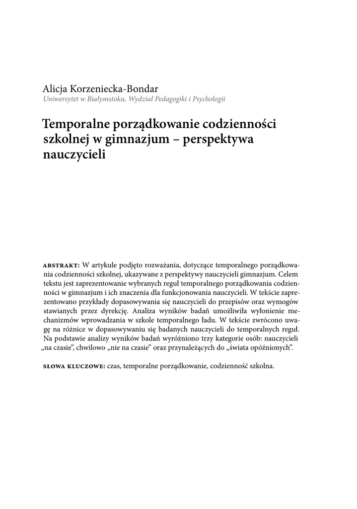 Alicja Korzeniecka-Bondar Uniwersytet w Białymstoku, Wydział Pedagogiki i Psychologii Temporalne porządkowanie codzienności szkolnej w gimnazjum – perspektywa nauczycieli abstrakt: W artykule podjęto rozważania, dotyczące temporalnego porządkowania codzienności szkolnej, ukazywane z perspektywy nauczycieli gimnazjum. Celem tekstu jest zaprezentowanie wybranych reguł temporalnego porządkowania codzienności w gimnazjum i ich znaczenia dla funkcjonowania nauczycieli. W tekście zaprezentowano przykłady dopasowywania się nauczycieli do przepisów oraz wymogów stawianych przez dyrekcję. Analiza wyników badań umożliwiła wyłonienie mechanizmów wprowadzania w szkole temporalnego ładu. W tekście zwrócono uwagę na różnice w dopasowywaniu się badanych nauczycieli do temporalnych reguł. Na podstawie analizy wyników badań wyróżniono trzy kategorie osób: nauczycieli „na czasie”, chwilowo „nie na czasie” oraz przynależących do „świata opóźnionych”. słowa kluczowe: czas, temporalne porządkowanie, codzienność szkolna. Kontakt: Alicja Korzeniecka-Bondar [email protected] Jak cytować: Korzeniecka-Bondar, A. (2015). Temporalne porządkowanie codzienności szkolnej w gimnazjum – perspektywa nauczycieli. Forum Oświatowe, 27(2), 103–114. Pobrane z: http://forumoswiatowe.pl/index.php/czasopismo/article/view/304 How to cite: Korzeniecka-Bondar, A. (2015). Temporalne porządkowanie codzienności szkolnej w gimnazjum – perspektywa nauczycieli. Forum Oświatowe, 27(2), 103–114. Retrieved from http://forumoswiatowe.pl/index.php/czasopismo/article/view/304 W codzienności cały czas coś się dzieje cichcem, a zdarzenia przepływają od istnienia do nieistnienia, zauważa Brach-Czaina (1992). Człowiek przyzwyczaja się do tego, co go otacza, z czasem nie dostrzega nawet tego, co początkowo dziwiło czy drażniło. Oswaja się z przestrzenią i tym, co, w jakim rytmie się w niej wydarza. Przyzwyczajenie kształtuje „społeczną strukturę jednostek, ponieważ potrafi sprawić, że zapomina się o nim w małym geście bez znaczenia. Im bardziej jest ono zbanalizowane w zwyczajności codzienności, tym większą posiada siłę budowania struktur” (Kaufmann, 2004, s. 106). Codzienność – zdaniem Sulimy (2003) – „jest wysoce przewidywalnym kontekstem ludzkich zachowań” (s. 233), wypełnia ją rutyna i powtarzalność działań, sytuacji. „Jednostki dążą do tego, aby w życiu codziennym doświadczać świata w formie uporządkowanej, a przede wszystkim spójnej i przewidywalnej” (Rogowski, Skrobacki, Mroczkowska, 2010, s. 35), gdyż umożliwia to praktyki bezrefleksyjne. Nie można mówić o codzienności w ogóle, „jest zawsze »czyjaś«” lub przez „coś” się uobecnia” (Rogowski i in., 2010, s. 35). W tekście analizie poddana zostanie codzienność szkoły gimnazjalnej, rekonstruowana przez nauczycieli. Codzienność szkolna stanowi, z jednej strony, odzwierciedlenie kultury organizacyjnej danej szkoły, z drugiej zaś – w zachodzących w niej relacjach osobowych i rzeczowych odzwierciedlają się w mniejszym lub większym stopniu, co zauważają Dudzikowa i Czerepaniak-Walczak (2010), „zarówno utrwalone tradycje, jak i nowe, dotychczas nieznane zjawiska, dziejące się wokół nas” (s. 9). W kulturze organizacyjnej szkoły (obejmującej: cenione wartości; normy i wzorce zachowań oraz symbole, podkreślające poczucie wspólnoty oraz stanowiące zrozumiałą dla wszystkich reprezentację zarówno wartości, jak również norm i wzorców (Koźmiński, Jemielniak, Latusek, 2009), tradycji, jak i nowych zjawiskach znaleźć można reguły dotyczące ładu temporalnego, doświadczane przez podmioty interakcji wychowawczych. Reguły porządkowania codzienności w szkole, w tym reguły temporalne, stanowiące przedmiot analizy w tym tekście, często są niewypowiedziane, oczywiste, ale są także te uzgadniane między podmiotami interakcji, a nawet zewnętrznie narzucone. Analiza wyników badań pozwala sformułować tezę, że do wielu z nich uczestnicy szkolnej codzienności już się przyzwyczaili, nie problematyzują ich (Kostera, 1998), a nawet nie dostrzegają istnienia, traktując jako oczywiste (Krzychała, Zamorska, 2008). Ta „niezauważalność codzienności” (Brach-Czaina, 1992) dotyczy zwłaszcza 104 Forum Oświatowe 27(2) Część ii. Z badań temporalnego wymiaru szkolnej codzienności, który określany jest wymiarem „kłopotliwym” (Murawska, 2014). czym jest ład temporalny? Ład temporalny można określić jako sieć temporalnych relacji poszczególnych osób, obejmującą ciągłe przystosowania i koordynację wysiłków, by praca była właściwie zorganizowana (Konecki, 2000). Organizacja pracy w szkole jest dynamicznym procesem, będącym rezultatem ciągłego interpretowania i definiowania sytuacji przez uczestników szkolnej interakcji. Działania poszczególnych osób muszą być prawidłowo skoordynowane, czy mówiąc za Koneckim (2000), „prawidłowo dopasowane”, dotyczy to zarówno planów pracy, jak i terminów jej wykonania. Proces dopasowania polega na koordynowaniu różnych ścieżek realizacji działań, co osiągane jest za pomocą „interakcyjnego procesu wypracowywania i wdrażania określonych planów działania” (Konecki, 2000, s. 45). Uczestnicy interakcji wychowawczych w codziennym funkcjonowaniu uzgadniają między sobą plany działania, dotyczące wielu kwestii: długości trwania i przerw w działaniach, ich tempa, rytmu, terminów realizacji, punktualności rozpoczynania i kończenia (Krzychała, Zamorska, 2008). W szkole sekwencje czynności poszczególnych uczestników interakcji wychowawczych, np. uczniów i nauczycieli, muszą być zsynchronizowane w czasie, tak w wymiarze całego roku szkolnego, jak i poszczególnych lekcji. Temporalne aspekty pracy dotyczą zatem nie tylko technicznych aspektów jej wykonania w określonym czasie, ale także procesó
