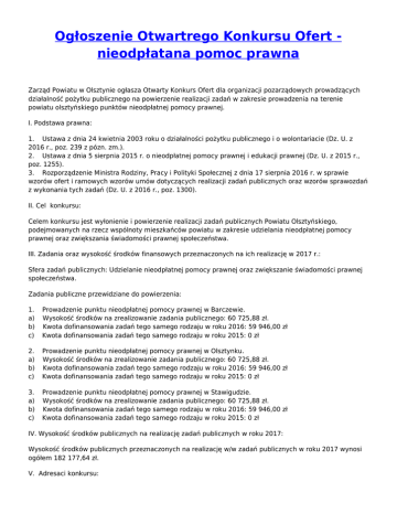Ogłoszenie Otwartrego Konkursu Ofert nieodpłatana pomoc prawna Zarząd Powiatu w Olsztynie ogłasza Otwarty Konkurs Ofert dla organizacji pozarządowych prowadzących działalność pożytku publicznego na powierzenie realizacji zadań w zakresie prowadzenia na terenie powiatu olsztyńskiego punktów nieodpłatnej pomocy prawnej. I. Podstawa prawna: 1. Ustawa z dnia 24 kwietnia 2003 roku o działalności pożytku publicznego i o wolontariacie (Dz. U. z 2016 r., poz. 239 z pózn. zm.). 2. Ustawa z dnia 5 sierpnia 2015 r. o nieodpłatnej pomocy prawnej i edukacji prawnej (Dz. U. z 2015 r., poz. 1255). 3. Rozporządzenie Ministra Rodziny, Pracy i Polityki Społecznej z dnia 17 sierpnia 2016 r. w sprawie wzorów ofert i ramowych wzorów umów dotyczących realizacji zadań publicznych oraz wzorów sprawozdań z wykonania tych zadań (Dz. U. z 2016 r., poz. 1300). II. Cel konkursu: Celem konkursu jest wyłonienie i powierzenie realizacji zadań publicznych Powiatu Olsztyńskiego, podejmowanych na rzecz wspólnoty mieszkańców powiatu w zakresie udzielania nieodpłatnej pomocy prawnej oraz zwiększania świadomości prawnej społeczeństwa. III. Zadania oraz wysokość środków finansowych przeznaczonych na ich realizację w 2017 r.: Sfera zadań publicznych: Udzielanie nieodpłatnej pomocy prawnej oraz zwiększanie świadomości prawnej społeczeństwa. Zadania publiczne przewidziane do powierzenia: 1. a) b) c) Prowadzenie punktu nieodpłatnej pomocy prawnej w Barczewie. Wysokość środków na zrealizowanie zadania publicznego: 60 725,88 zł. Kwota dofinansowania zadań tego samego rodzaju w roku 2016: 59 946,00 zł Kwota dofinansowania zadań tego samego rodzaju w roku 2015: 0 zł 2. a) b) c) Prowadzenie punktu nieodpłatnej pomocy prawnej w Olsztynku. Wysokość środków na zrealizowanie zadania publicznego: 60 725,88 zł. Kwota dofinansowania zadań tego samego rodzaju w roku 2016: 59 946,00 zł Kwota dofinansowania zadań tego samego rodzaju w roku 2015: 0 zł 3. a) b) c) Prowadzenie punktu nieodpłatnej pomocy prawnej w Stawigudzie. Wysokość środków na zrealizowanie zadania publicznego: 60 725,88 zł. Kwota dofinansowania zadań tego samego rodzaju w roku 2016: 59 946,00 zł Kwota dofinansowania zadań tego samego rodzaju w roku 2015: 0 zł IV. Wysokość środków publicznych na realizację zadań publicznych w roku 2017: Wysokość środków publicznych przeznaczonych na realizację w/w zadań publicznych w roku 2017 wynosi ogółem 182 177,64 zł. V. Adresaci konkursu: 1. O powierzenie prowadzenia punktu nieodpłatnej pomocy prawnej może ubiegać się organizacja pozarządowa, o której mowa w art. 3 ust. 2 ustawy o działalności pożytku publicznego i o wolontariacie, która spełnia łącznie następujące warunki: 1) posiada co najmniej dwuletnie doświadczenie w wykonywaniu zadań wiążących się z udzielaniem porad prawnych lub informacji prawnych; 2) przedstawi zawarte umowy lub promesy ich zawarcia z adwokatem, radcą prawnym, doradcą podatkowym lub osobą, o której mowa w art. 11 ust. 3 pkt 2 ustawy o nieodpłatnej pomocy prawnej i edukacji prawnej; 3) daje gwarancję należytego wykonania zadania, w szczególności przez złożenie pisemnego zobowiązania: a) zapewnienia poufności w związku z udzielaniem nieodpłatnej pomocy prawnej i jej dokumentowaniem, b) zapewnienia profesjonalnego i rzetelnego udzielania nieodpłatnej pomocy prawnej, w szczególności w sytuacji, gdy zachodzi konflikt interesów. 2. O powierzenie prowadzenia punktu nieodpłatnej pomocy prawnej nie może ubiegać się organizacja pozarządowa, która w okresie dwóch lat poprzedzających przystąpienie do otwartego konkursu ofert nie rozliczyła się z dotacji przyznanej na wykonanie zadania publicznego lub wykorzystała dotację niezgodnie z celem jej przyznania, jak również organizacja pozarządowa, z którą starosta rozwiązał umowę. Termin dwóch lat biegnie odpowiednio od dnia rozliczenia się z dotacji i zwrotu nienależnych środków wraz z odsetkami albo rozwiązania umowy. VI. Termin i miejsce realizacji zadania: 1. Termin realizacji zadania: 01.01.2017 r. – 31.12.2017 r. 2. Czas realizacji powinien obejmować: okres przygotowania, przeprowadzenia oraz zakończenia zadania. Wszystkie dokumenty księgowe muszą zostać wystawione do dnia zakończenia zadania. 3. Miejsce realizacji zadania w poszczególnych punktach: 1) Punkt w Barczewie: 11-010 Barczewo, Plac Ratuszowy 1, lokal nr 24 (budynek Urzędu Miejskiego w Barczewie); 2) Punkt w Olsztynku: 11-015 Olsztynek, ul. Ratusz 1, lokal nr 7a (budynek Urzędu Miejskiego w Olsztynku); 3) Punkt w Stawigudzie: 11-034 Stawiguda, ul. Olsztyńska 10, lokal nr 1 (budynek Gminnego Ośrodka Pomocy Społecznej). VII. Warunki realizacji zadania: 1. Zadanie powinno być realizowane w przeciętnym wymiarze 5 dni w tygodniu, przez co najmniej 4 godziny dziennie. Szczegółowy harmonogram tygodniowy, z uwzględnieniem dni tygodnia i godzin przyjęć interesantów oraz sposób korzystania z lokalu, w którym będzie udzielana nieodpłatna pomoc prawna zostaną określone w umowie o powierzenie realizacji zadania publicznego. 2. Organizacja pozarządowa zapewni udzielanie nieodpłatnej pomocy prawnej na zasadach określonych w art. 5 ust. 2 oraz art. 7 ustawy z dnia 5 sierpnia 2015 r. o nieodpłatnej pomocy prawnej i edukacji prawnej. 3. Kwota przeznaczona na prowadzenie jednego punktu nieodpłatnej pomocy prawnej wynosi 5 060,49 zł. brutto miesięcznie. Kwota dotacji powinna być wydatkowana na pokrycie kosztów związanych z prowadzeniem punktu nieodpłatnej pomocy prawnej. 4. Podstawą powierzenia realizacji zadania jest umowa, zawarta w formie pisemnej, określająca zakres i warunki realizacji zadania publicznego wraz z harmonogramem i kosztorysem zadania. 5. Zadanie powinno być zrealizowane z najwyższą starannością, zgodnie z zawartą umową oraz z zobowiązującymi standardami i przepisami w zakresie opisanym w ofercie. 6. Oferen