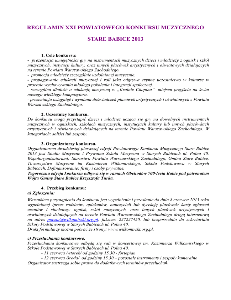REGULAMIN XXI POWIATOWEGO KONKURSU MUZYCZNEGO STARE BABICE 2013 1. Cele konkursu: - prezentacja umiejętności gry na instrumentach muzycznych dzieci i młodzieży z ognisk i szkół muzycznych, instytucji kultury, oraz innych placówek artystycznych i oświatowych działających na terenie Powiatu Warszawskiego Zachodniego. - promocja młodzieży szczególnie uzdolnionej muzycznie. - propagowanie edukacji muzycznej i roli jaką odgrywa czynne uczestnictwo w kulturze w procesie wychowywania młodego pokolenia i integracji społecznej. - szczególna dbałość o edukację muzyczną w „Krainie Chopina”- miejscu przyjścia na świat naszego wielkiego kompozytora. - prezentacja osiągnięć i wymiana doświadczeń placówek artystycznych i oświatowych z Powiatu Warszawskiego Zachodniego. 2. Uczestnicy konkursu. Do konkursu mogą przystąpić dzieci i młodzież ucząca się gry na dowolnych instrumentach muzycznych w ogniskach, szkołach muzycznych, instytucjach kultury lub innych placówkach artystycznych i oświatowych działających na terenie Powiatu Warszawskiego Zachodniego. W kategoriach: soliści lub zespoły. 3. Organizatorzy konkursu. Organizatorem dwudziestej pierwszej edycji Powiatowego Konkursu Muzycznego Stare Babice 2013 jest Studio Muzyczne i Prywatna Szkoła Muzyczna w Starych Babicach ul. Polna 40. Współorganizatorami: Starostwo Powiatu Warszawskiego Zachodniego, Gmina Stare Babice, Towarzystwo Muzyczne im Kazimierza Wiłkomirskiego, Szkoła Podstawowa w Starych Babicach. Dofinansowanie: firmy i osoby prywatne. Tegoroczna edycja konkursu odbywa się w ramach Obchodów 700-lecia Babic pod patronatem Wójta Gminy Stare Babice Krzysztofa Turka. 4. Przebieg konkursu: a) Zgłoszenia: Warunkiem przystąpienia do konkursu jest wypełnienie i przesłanie do dnia 8 czerwca 2013 roku wypełnionej /przez rodziców, opiekunów, nauczycieli lub dyrekcję placówek/ karty zgłoszeń uczniów i słuchaczy: ognisk, szkół muzycznych, oraz innych placówek artystycznych i oświatowych działających na terenie Powiatu Warszawskiego Zachodniego drogą internetową na adres [email protected], faksem: 227227450, lub bezpośrednio do sekretariatu Szkoły Podstawowej w Starych Babicach ul. Polna 40. Druki formularzy można pobrać ze strony: www.wilkomirski.org.pl. c) Przesłuchania konkursowe. Przesłuchania konkursowe odbędą się sali w koncertowej im. Kazimierza Wiłkomirskiego w Szkole Podstawowej w Starych Babicach ul. Polna 40. - 11 czerwca /wtorek/ od godziny 15.30 - fortepian - 12 czerwca /środa/ od godziny 15.30 – pozostałe instrumenty i zespoły kameralne Organizator zastrzega sobie prawo do dodatkowych terminów przesłuchań. Uczestnicy prezentują się według ustalonego przez organizatora harmonogramu przesłuchań uwzględniający wiek i czas nauki gry na instrumencie. Imienna lista zawierająca godziny przesłuchań będzie opublikowana na stronie internetowej www.wilkomirski.org.pl., oraz wywieszona na tablicy ogłoszeń w szkole podstawowej w Starych Babicach w poniedziałek 10 czerwca br. Niestawienie się w określonym terminie na przesłuchanie spowoduje skreślenie z listy uczestników. b) Program. Uczestnicy są zobowiązani do przygotowania 2 dowolnie wybranych utworów w których w sposób najpełniejszy będą mogli przedstawić swoje umiejętności, o stopniu trudności dostosowanym do ich wieku i poziomu zaawansowania w grze na instrumencie. 5 Koncert laureatów, nagrody. O rezultatach przesłuchań konkursu - decyduje wyłącznie Komisja Konkursowa powołana przez organizatora, w której składzie znajdą się przedstawiciele placówek biorących udział w konkursie. Wyniki będą ogłoszone po przesłuchaniach najpóźniej w czwartek 14 czerwca br., na stronach internetowych Starostwa Warszawskiego Zachodniego, Gminy Stare Babice i Towarzystwa Muzycznego im. Kazimierza Wiłkomirskiego - www.wilkomirski.org.pl. Oraz w formie pisemnej na tablicy ogłoszeń obok sali koncertowej w szkole podstawowej w Starych Babicach. W wyniku przesłuchań komisja zdecyduje o przyznaniu następujących nagród głównych: - Grand Prix - dla najwybitniejszego uczestnika - I, II i III – nagrody - Uczestnictwo w koncercie laureatów Komisja może zdecydować o nie przyznaniu któreś z nagród, bądź rozdzielić nagrody w sposób nietypowy. Poza nagrodami głównymi komisja przyzna liczne wyróżnienia. Dopuszcza się również fundowanie i przyznanie nagród przez inne osoby i instytucje, wymagane jest jednak wcześniejsze zgłoszenie i ustalenie szczegółów z organizatorem. KONCERT LAUREATÓW I UROCZYSTE WRĘCZENIE NAGRÓD – jako impreza towarzysząca IX Festiwalowi Muzycznemu „W Krainie Chopina” - odbędzie się 15 czerwca /sobota/ o godzinie 18.00 w Sali koncertowej I Gminnego Gimnazjum w Koczargach Starych ul. Akacjowa 12. Dyrektor Studia Muzycznego Ewa Dżyga Stare Babice 21 marca 2013 roku W razie jakichkolwiek pytań prosimy o kontakt: tel.603-861-660, e-mail: [email protected]