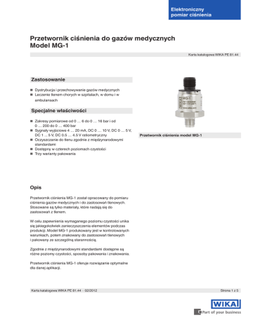 Elektroniczny pomiar ciśnienia Przetwornik ciśnienia do gazów medycznych Model MG-1 Karta katalogowa WIKA PE 81.44 Zastosowanie ■■ Dystrybucja i przechowywanie gazów medycznych ■■ Leczenie tlenem chorych w szpitalach, w domu i w ambulansach Specjalne właściwości ■■ Zakresy pomiarowe od 0 … 6 do 0 … 16 bar i od 0 … 200 do 0 … 400 bar ■■ Sygnały wyjściowe 4 … 20 mA, DC 0 … 10 V, DC 0 … 5 V, DC 1 ... 5 V, DC 0.5 … 4.5 V ratiometryczny ■■ Oczyszczanie do tlenu zgodnie z międzynarodowymi Przetwornik ciśnienia model MG-1 standardami ■■ Dostępny w czterech poziomach czystości ■■ Trzy warianty pakowania Opis Przetwornik ciśnienia MG-1 został opracowany do pomiaru ciśnienia gazów medycznych i do zastosowań tlenowych. Stosowane są tylko materiały, które nadają się do zastosowań z tlenem. W celu zapewnienia wymaganego poziomu czystości unika się jakiegokolwiek zanieczyszczenia elementów podczas produkcji. Model MG-1 produkowany jest w kontrolowanych warunkach, potem znakowany do zastosowań tlenowych i pakowany ze szczególną starannością. Zgodnie z międzynarodowymi standardami dostępne są różne poziomy czystości, sposoby pakowania i znakowania. Przetwornik ciśnienia MG-1 oferuje rozwiązanie optymalne dla danej aplikacji. Karta katalogowa WIKA PE 81.44 ∙ 02/2012 Strona 1 z 5 Zakresy pomiarowe Ciśnienie względne bar Zakres pomiarowy 0 ... 6 0 ... 10 0 ... 16 0 ... 200 0 ... 300 0 ... 400 25 25 160 1,200 1,700 1,700 Dopuszczalne przeciążenie 20 Ciśnienie niszczące psi Zakres pomiarowy 32 500 800 800 0 ... 100 0 ... 150 0 ... 200 0 ... 3,000 0 ... 4,000 0 ... 5,000 1,450 1,450 2,300 17,000 24,000 24,000 Dopuszczalne przeciążenie 290 Ciśnienie niszczące 20 290 460 7,200 11,000 11,000 Podane zakresy pomiarowe dostępne są także w kg/cm2, MPa and kPa. Dostępne sa także zakresy na podciśnienie i zakresy pomiarowe +/- . Odporność próżniowa Tak Sygnały wyjściowe Dokładność Typ sygnału Sygnał Prądowy (2-przewodowy) 4 ... 20 mA Napięciowy (3-przewodowy) Ratiometryczny (3-przewodowy) DC 0 ... 10 V DC 0 ... 5 V DC 1 ... 5 V DC 0.5 ... 4.5 V W zależności od sygnału mają zastosowanie następujące obciążenia: Sygnał Obciążenie w Ω 4 ... 20 mA ≤ (zasilanie - 8 V) / 0.02 A DC 0 ... 10 V > sygnał max. / 1 mA DC 0 ... 5 V DC 1 ... 5 V DC 0.5 ... 4.5 V ratiometryczny Dokładność w warunkach odniesienia ≤ ±2 % zakresu Obejmuje nieliniowość, histerezę, zero offset i odchylenie końcowej wartości (odpowiada błędowi urządzenia wg IEC 61298-2), kalibrowany w pozycji pionowej z przyłączem procesowym skierowanym ku dołowi. Nieliniowość ≤ 0.5 (BFSL wg IEC 61298-2) Błąd temperaturowy ≤ ±2.0 % zakresu Dryf długoterminowy (wg IEC 61298-2) ≤ 0.3 % zakresu/rok Czas ustalania ≤ 2 ms Zasilanie Dopuszczalne zasilanie zależy od odpowiedniego sygnału wyjściowego. Sygnał wyjściowy Zasilanie 4 ... 20 mA DC 0 ... 10 V DC 0 ... 5 V DC 1 ... 5 V DC 0.5 ... 4.5 V ratiometric DC 8 ... 30 V DC 14 ... 30 V DC 8 ... 30 V DC 8 ... 30 V DC 5 ± 0,5 V Całkowity pobór prądu maksymalnie 10 mA (z wyjątkiem sygnałów 2-przewodowych) Strona 2 z 5 Karta katalogowa WIKA PE 81.44 ∙ 02/2012 Warunki pracy Przyłącza elektryczne Stopień ochrony (wg IEC 60529) IP 67 Odporność na zwarcie S+ vs. 0V Podany stopień ochrony występuje tylko wtedy, kiedy zastosowano połączenie z dopasowanymi wtyczkami, posiadającymi właściwy stopień ochrony. Ochrona przed odwrotną polaryzacją UB vs. 0V Odporność na wibracje 20 g (20 ... 2,000 Hz, 2 h) wg IEC 60068-2-6 (drgania rezonansowe) Odporność na wstrząsy 40 g (6 ms) wg IEC 60068-2-27 (uderzenia mechaniczne) Temperatury Dopuszczalne zakresy temperatur Znamionowy zakres temperatury Otoczenia Medium Przechowywania -20 ... +70 °C -4 ... +158 °F -20 ... +70 °C -20 ... +70 °C -25 ... +80 °C -4 ... +158 °F -4 ... +158 °F -13 ... +176 °F Warunki odniesienia (wg IEC 61298-1) Napięcie izolacyjne DC 500 V Schematy połączeń Wtyczka okrągła M12 x 1 2-przewodowy 3-przewodowy UB 1 1 0V 3 3 S+ - 4 Wyjście kablowe, nieekranowane 2-przewodowy 3-przewodowy UB brązowy brązowy 0V zielony zielony S+ - biały Temperatura 15 ... 25 °C Przekrój przewodu 3 x 0.14 mm2 Średnica przewodu 3.2 mm Długość przewodu 2 m Ciśnienie atmosferyczne 860 … 1,060 mbar (665 ... 800 mmHg) Wyjście kablowe, ekranowane Wilgotność 45 ... 75 % względna, bez kondensacji Zasilanie ■■ DC 24 V ■■ DC 5 V z sygnałem ratiometrycznym Pozycja montażu jak wymagane 2-przewodowy 3-przewodowy UB brązowy brązowy 0V niebieski niebieski S+ - czarny Przekrój przewodu 3 x 0.14 mm2 Średnica przewodu 4.3 mm Długość przewodu 2 m Przyłącza procesowe Standard Rozmiar gwintu EN 837 G⅛B G¼B G ¼ A 1) ⅛ NPT ¼ NPT R¼ ¼ PT 7/16-20 UNF-2A, O-ring BOSS 1) DIN 3852-E ANSI/ASME B1.20.1 ISO 7 KS SAE 1) Pierścień uszczelniający z FKM Karta katalogowa WIKA PE 81.44 ∙ 02/2012 Strona 3 z 5 Specyfikacje czystości Poziom czystości Zakres pomiarowy < 30 bar/435 psi Zakres pomiarowy > 30 bar/435 psi Gaz oddechowy Wolny od oleju i smaru Wolny od oleju i smaru Standard medyczny wg ISO 15001 wg ISO 15001 ■■ Węglowodory pozostałe ■■ Węglowodory pozostałe ■■ Wielkość cząstek Standard przemysłowy ■■ Węglowodory pozostałe < 1,000 mg/m² < 1,000 mg/m² < 550 mg/m² < 220 mg/m² nie dotyczy Wolny od oleju i smaru do tlenu wg ASTM G93 poziom D/E and DIN 19247 < 550 mg/m² Wysoki standard przemysłowy Wolny od oleju i smaru do tlenu wg ASTM G93 poziom C ■■ Węglowodory pozostałe < 66 mg/m² na zapytanie Wolny od oleju i smaru do tlenu wg ASTM G93 poziom D/E i DIN 19247 < 220 mg/m² Wolny od oleju i smaru do tlenu wg ASTM G93 poziom C < 66 mg/m² Pakowanie Dla poszczególnych poziomów czystości MG-1 dostępna są następujące rodzaje pakowania. Poziom czystości Rodzaj pakowania Gaz oddechowy Standard medyczny Standard przemysłowy Wysoki standard p