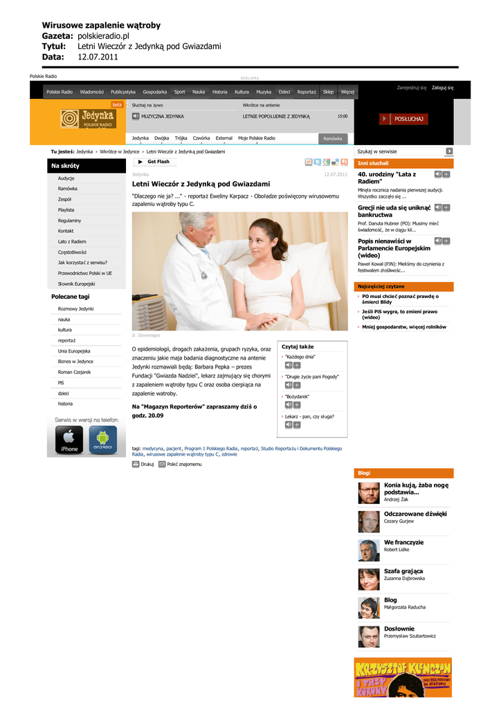 Wirusowe zapalenie w¹troby Gazeta: polskieradio.pl Tytu³: Letni Wieczór z Jedynk¹ pod Gwiazdami Data: 12.07.2011 Polskie Radio REKLAMA Polskie Radio Wiadomości Publicystyka beta Gospodarka Sport Nauka Historia Słuchaj na żywo Tu jesteś: Jedynka > Wkrótce w Jedynce Na skróty Audycje Ramówka Zespół > ► Muzyka Dzieci Reportaż Sklep Zarejestruj się Więcej Zaloguj się| Wkrótce na antenie MUZYCZNA JEDYNKA Jedynka Kultura Dwójka Trójka 15:00 LETNIE POPOŁUDNIE Z JEDYNKĄ Czwórka External Moje Polskie Radio POSŁUCHAJ Ramówka Letni Wieczór z Jedynką pod Gwiazdami Szukaj w serwisie Get Flash Inni słuchali Jedynka 12.07.2011 Letni Wieczór z Jedynką pod Gwiazdami "Dlaczego nie ja? ..." - reportaż Eweliny Karpacz - Oboładze poświęcony wirusowemu zapaleniu wątroby typu C. Playlista Regulaminy 40. urodziny "Lata z Radiem" Minęła rocznica nadania pierwszej audycji. Wszystko zaczęło się ... Grecji nie uda się uniknąć bankructwa Prof. Danuta Hubner (PO): Musimy mieć świadomość, że w ciągu kil... Kontakt Popis nienawiści w Parlamencie Europejskim (wideo) Lato z Radiem Częstotliwości Jak korzystać z serwisu? Paweł Kowal (PJN): Mieliśmy do czynienia z festiwalem złośliwośc... Przewodnictwo Polski w UE Słownik Europejski Najczęściej czytane Polecane tagi PO musi chcieć poznać prawdę o śmierci Blidy Rozmowy Jedynki Jeśli PiS wygra, to zmieni prawo (wideo) nauka Mniej gospodarstw, więcej rolników kultura źr. Glowimages reportaż Unia Europejska Biznes w Jedynce O epidemiologii, drogach zakażenia, grupach ryzyka, oraz znaczeniu jakie maja badania diagnostyczne na antenie Czytaj także "Każdego dnia" Jedynki rozmawiali będą: Barbara Pepka – prezes Roman Czejarek Fundacji "Gwiazda Nadziei", lekarz zajmujący się chorymi PiS z zapaleniem wątroby typu C oraz osoba cierpiąca na dzieci zapalenie watroby. historia Na "Magazyn Reporterów" zapraszamy dziś o godz. 20.09 "Drugie życie pani Pogody" "Bożydarek" Lekarz - pan, czy sługa? tagi: medycyna, pacjent, Program 1 Polskiego Radia, reportaż, Studio Reportażu i Dokumentu Polskiego Radia, wirusowe zapalenie wątroby typu C, zdrowie Drukuj Poleć znajomemu Blogi Konia kują, żaba nogę podstawia... Andrzej Żak Odczarowane dźwięki Cezary Gurjew We franczyzie Robert Lidke Szafa grająca Zuzanna Dąbrowska Blog Małgorzata Raducha Dosłownie Przemysław Szubartowicz Dosłownie Przemysław Szubartowicz Wirusowe zapalenie w¹troby Gazeta: polskieradio.pl Tytu³: Letni Wieczór z Jedynk¹ pod Gwiazdami Data: 12.07.2011 Jan Paweł II w Pielgrzymki II PolskieRadio24 Bryan Adams Ćwierć wieku Zapiski ze Na skróty: Informacje: Wiadomości | Sport | Gospodarka | The News | Euranet | IAR | Redakcja Katolicka | Radio Parlament Rozrywka i kultura: Muzyka | Kultura | Teatr | Studio Reportażu | Polska Orkiestra Radiowa | Orkiestra Kameralna Wiedza: Nauka i technologie | Historia Programy: Jedynka | Dwójka | Trójka | Czwórka | Zagranica Społeczności: Forum | Kontakt Copyright © Polskie Radio S.A | Offensywa Bajki Chór Polskiego Radia | 7 dni w kraju Studia nagrań i koncertów O NAS | POLITYKA PRYWATNO ŚCI | REGULAMIN | REKLAMA | PROMOCJA | CZ ĘSTOTLIWO ŚCI | KONTAKT | ZAMÓWIENIA PUBLICZNE Prog Rock | Bilety