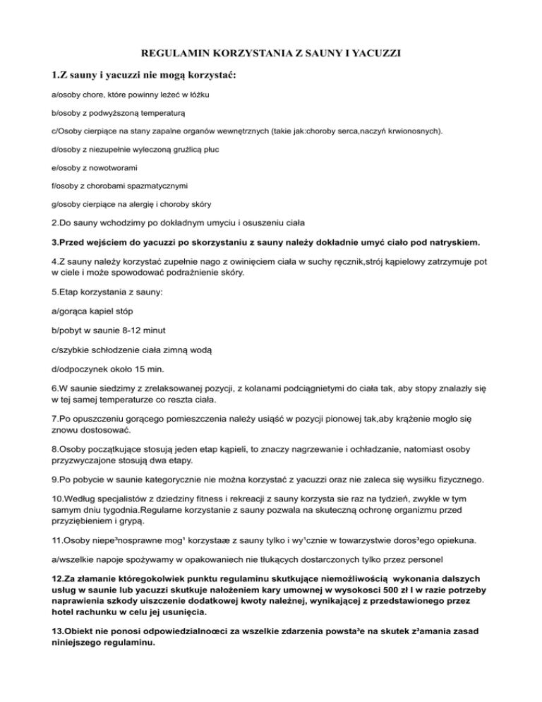 REGULAMIN KORZYSTANIA Z SAUNY I YACUZZI 1.Z sauny i yacuzzi nie mogą korzystać: a/osoby chore, które powinny leżeć w łóżku b/osoby z podwyższoną temperaturą c/Osoby cierpiące na stany zapalne organów wewnętrznych (takie jak:choroby serca,naczyń krwionosnych). d/osoby z niezupełnie wyleczoną grużlicą płuc e/osoby z nowotworami f/osoby z chorobami spazmatycznymi g/osoby cierpiące na alergię i choroby skóry 2.Do sauny wchodzimy po dokładnym umyciu i osuszeniu ciała 3.Przed wejściem do yacuzzi po skorzystaniu z sauny należy dokładnie umyć ciało pod natryskiem. 4.Z sauny należy korzystać zupełnie nago z owinięciem ciała w suchy ręcznik,strój kąpielowy zatrzymuje pot w ciele i może spowodować podrażnienie skóry. 5.Etap korzystania z sauny: a/gorąca kapiel stóp b/pobyt w saunie 8-12 minut c/szybkie schłodzenie ciała zimną wodą d/odpoczynek około 15 min. 6.W saunie siedzimy z zrelaksowanej pozycji, z kolanami podciągnietymi do ciała tak, aby stopy znalazły się w tej samej temperaturze co reszta ciała. 7.Po opuszczeniu gorącego pomieszczenia należy usiąść w pozycji pionowej tak,aby krążenie mogło się znowu dostosować. 8.Osoby początkujące stosują jeden etap kąpieli, to znaczy nagrzewanie i ochładzanie, natomiast osoby przyzwyczajone stosują dwa etapy. 9.Po pobycie w saunie kategorycznie nie można korzystać z yacuzzi oraz nie zaleca się wysiłku fizycznego. 10.Według specjalistów z dziedziny fitness i rekreacji z sauny korzysta sie raz na tydzień, zwykle w tym samym dniu tygodnia.Regularne korzystanie z sauny pozwala na skuteczną ochronę organizmu przed przyziębieniem i grypą. 11.Osoby niepe³nosprawne mog¹ korzystaæ z sauny tylko i wy¹cznie w towarzystwie doros³ego opiekuna. a/wszelkie napoje spożywamy w opakowaniech nie tłukących dostarczonych tylko przez personel 12.Za złamanie któregokolwiek punktu regulaminu skutkujące niemożliwością wykonania dalszych usług w saunie lub yacuzzi skutkuje nałożeniem kary umownej w wysokosci 500 zł I w razie potrzeby naprawienia szkody uiszczenie dodatkowej kwoty należnej, wynikającej z przedstawionego przez hotel rachunku w celu jej usunięcia. 13.Obiekt nie ponosi odpowiedzialnoœci za wszelkie zdarzenia powsta³e na skutek z³amania zasad niniejszego regulaminu.
