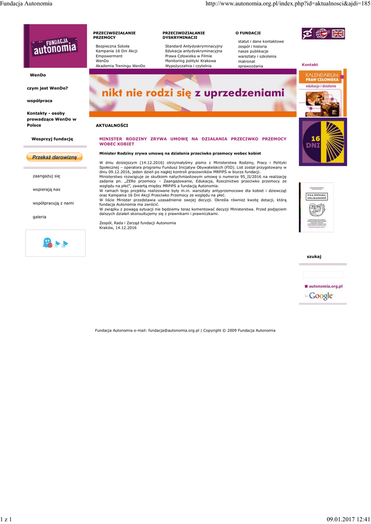 Fundacja Autonomia 1z1 http://www.autonomia.org.pl/index.php?id=aktualnosci&ajdi=185 PRZECIWDZIAŁANIE PRZEMOCY Bezpieczna Szkoła Kampania 16 Dni Akcji Empowerment WenDo Akademia Treningu WenDo WenDo PRZECIWDZIAŁANIE DYSKRYMINACJI Standard Antydyskryminacyjny Edukacja antydyskryminacyjna Prawa Człowieka w Filmie Monitoring polityki Krakowa Wypożyczalnia i czytelnia milczenie nie jest złotem O FUNDACJI statut i dane kontaktowe zespół i historia nasze publikacje warsztaty i szkolenia matronat sprawozdania Kontakt czym jest WenDo? współpraca Kontakty - osoby prowadzące WenDo w Polsce Wesprzyj fundację AKTUALNOŚCI MINISTER RODZINY ZRYWA UMOWĘ NA DZIAŁANIA PRZECIWKO PRZEMOCY WOBEC KOBIET Minister Rodziny zrywa umowę na działania przeciwko przemocy wobec kobiet zaangażuj się wspierają nas współpracują z nami galeria W dniu dzisiejszym (14.12.2016) otrzymałyśmy pismo z Ministerstwa Rodziny, Pracy i Polityki Społecznej – operatora programu Fundusz Inicjatyw Obywatelskich (FIO). List został przygotowany w dniu 09.12.2016, jeden dzień po nagłej kontroli pracowników MRPiPS w biurze fundacji. Ministerstwo rozwiązuje ze skutkiem natychmiastowym umowę o numerze 95_II/2016 na realizację zadania pn. „ZERo przemocy – Zaangażowanie, Edukacja, Rzecznictwo przeciwko przemocy ze względu na płeć”, zawartą między MRPiPS a fundacją Autonomia. W ramach tego projektu realizowane były m.in. warsztaty antyprzemocowe dla kobiet i dziewcząt oraz Kampania 16 Dni Akcji Przeciwko Przemocy ze względu na płeć. W liście Minister przedstawia uzasadnienie swojej decyzji. Określa również kwotę dotacji, którą fundacja Autonomia ma zwrócić. W związku z powagą sytuacji nie będziemy teraz komentować decyzji Ministerstwa. Przed podjęciem dalszych działań skonsultujemy się z prawnikami i prawniczkami. Zespół, Rada i Zarząd fundacji Autonomia Kraków, 14.12.2016 szukaj Fundacja Autonomia e-mail: [email protected] | Copyright © 2009 Fundacja Autonomia 09.01.2017 12:41