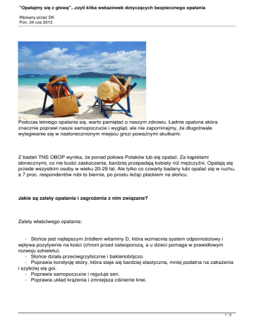 "Opalajmy się z głową"...czyli kilka wskazówek dotyczących bezpiecznego opalania Wpisany przez DK Pon, 24 cze 2013 Podczas letniego opalania się, warto pamiętać o naszym zdrowiu. Ładnie opalona skóra znacznie poprawi nasze samopoczucie i wygląd, ale nie zapominajmy, że długotrwałe wylegiwanie się w nasłonecznionym miejscu grozi poważnymi skutkami. Z badań TNS OBOP wynika, że ponad połowa Polaków lub się opalać. Za kąpielami słonecznymi, co nie budzi zaskoczenia, bardziej przepadają kobiety niż mężczyźni. Opalają się przede wszystkim osoby w wieku 20-29 lat. Ale tylko co czwarty badany lubi opalać się w ruchu, a 7 proc. respondentów robi to biernie, po prostu leżąc plackiem na słońcu. Jakie są zalety opalania i zagrożenia z nim związane? Zalety właściwego opalania: - Słońce jest najlepszym źródłem witaminy D, która wzmacnia system odpornościowy i wpływa pozytywnie na kości (chroni przed osteoporozą, a u dzieci pomaga w prawidłowym rozwoju szkieletu). - Słońce działa przeciwgrzybicznie i bakteriobójczo. - Poprawia kondycję skóry, która staje się bardziej elastyczna, mniej podatna na zakażenia i szybciej się goi. - Poprawia samopoczucie i reguluje sen. - Poprawia układ krążenia i zmniejsza ciśnienie krwi. 1/3 "Opalajmy się z głową"...czyli kilka wskazówek dotyczących bezpiecznego opalania Wpisany przez DK Pon, 24 cze 2013 Zagrożenia, które niesie ze sobą nieprawidłowe opalanie: - Rak skóry (w tym najpoważniejszy nowotwór skóry - czerniak). Poparzenia skóry. Przyspieszenie starzenia się skóry (zmarszczki, przebarwienia, szarość). Udar. Jak zatem należy się właściwie (bezpiecznie) opalać? Aby opalanie było skuteczne, i co ważniejsze bezpieczne dla skóry, należy przestrzegać kilku podstawowych zasad dotyczących kąpieli słonecznych: 1. Jeśli przyjmujemy jakieś leki, koniecznie przeczytajmy ulotkę lub skonsultujmy się z lekarzem. Dowiedzmy się czy przypadkiem promieniowanie słoneczne nie wywoła reakcji z zażywanym lekiem i nie wpłynie niekorzystnie na nasze zdrowie lub skórę. 2. Na 2-3 tygodnie przed urlopem warto zacząć przyjmować tabletki z beta-karotenem, który nada naszej skórze lekko brązowy odcień. Dzięki temu skóra będzie lepiej chroniona przed słońcem. 3. Zawsze stosujmy krem z filtrem odpowiedni do naszego rodzaju cery. Używajmy go nawet jeśli wydaje się nam, że słońce nie jest bardzo intensywne lub jest schowane za chmurami. Pamiętajmy, że promienie słoneczne i tak docierają do skóry. Krem nakładajmy też ponownie po wyjściu z wody, nawet jeśli na etykiecie napisane jest, że jest wodoodporny. 4. Opalajmy się powoli, najlepiej w ruchu. Pamiętajmy, by nie leżeć plackiem na słońcu kilka godzin, szczególnie jeśli jest to nasze pierwsze opalanie! W takim wypadku poparzenie jest gwarantowane. Opalanie rozpocznijmy stopniowo, dopiero, gdy nasza skóra przyzwyczai się i nabierze koloru możemy nieco wydłużyć czas opalania. Najlepiej opalimy się grając w piłkę plażową czy też spacerując. 5. Zabezpieczajmy znamiona. Zabezpieczajmy znamiona przed działaniem promieni słonecznych stosując tzw. sunblocker czyli krem, który całkowicie zablokuje działania słońca w tym miejscu. Ochrona znamion przed słońcem jest tak ważna, ponieważ pod jego wpływem ze znamienia może rozwinąć się czerniak. 6. Nie wystawiajmy się na działanie słońca do południa między godziną dziesiątą a trzynastą, bo wtedy promieniowanie jest najsilniejsze. Możemy poparzyć skórę i nabawić się udaru. 7. Uzupełniajmy płyny, pijmy nawet wówczas, gdy nie czujemy pragnienia. Najlepiej mieć pod ręką butelkę wody mineralnej i popijać ją małymi łykami. Jeśli lubimy soki, to wybierajmy raczej warzywne, z większą ilością potasu i magnezu (np. pomidorowy). 8. Zakładajmy okulary przeciwsłoneczne, zwłaszcza jeśli jesteśmy alergikami (przy dużym nasłonecznieniu w powietrzu jest większa ilość pyłków). Poza tym okulary słoneczne chronią nasze oczy przed szkodliwym działaniem ostrego światła. Warto też nosić czapkę z daszkiem lub kapelusz. 2/3 "Opalajmy się z głową"...czyli kilka wskazówek dotyczących bezpiecznego opalania Wpisany przez DK Pon, 24 cze 2013 Pamiętajmy! Nasza skóra musi nam wystarczyć do końca życia, dlatego warto o nią dbać i cieszyć się jej zdrowym i pięknym wyglądem przez długie lata. Źródło: planeria.pl, mporady.pl oraz swiat-zdrowia.pl 3/3