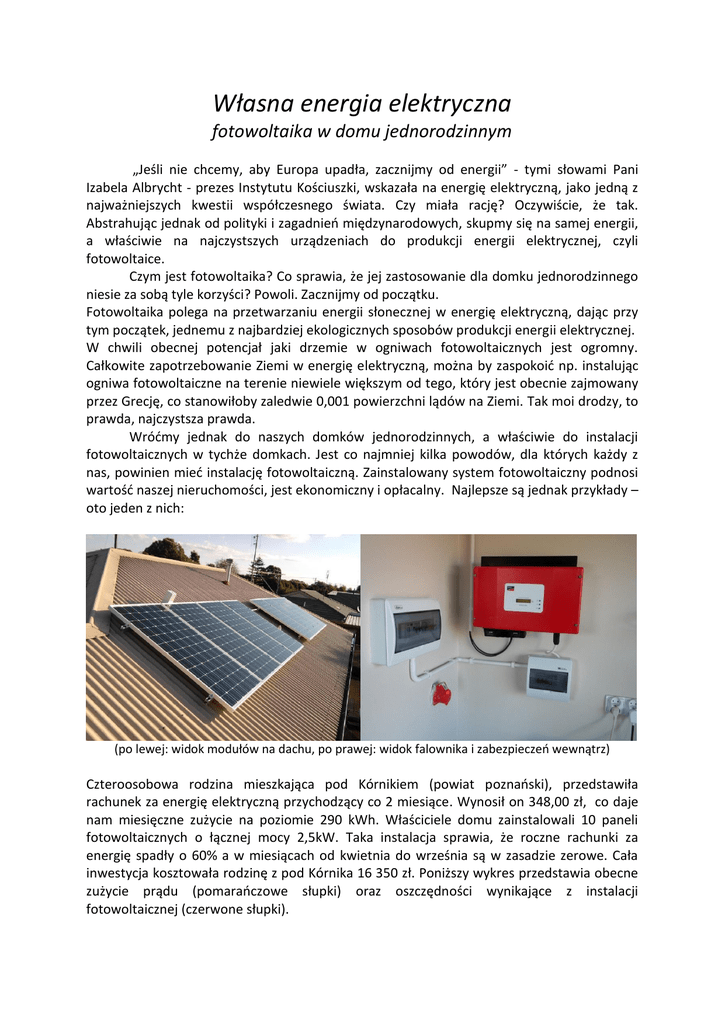 Własna energia elektryczna fotowoltaika w domu jednorodzinnym „Jeśli nie chcemy, aby Europa upadła, zacznijmy od energii” - tymi słowami Pani Izabela Albrycht - prezes Instytutu Kościuszki, wskazała na energię elektryczną, jako jedną z najważniejszych kwestii współczesnego świata. Czy miała rację? Oczywiście, że tak. Abstrahując jednak od polityki i zagadnień międzynarodowych, skupmy się na samej energii, a właściwie na najczystszych urządzeniach do produkcji energii elektrycznej, czyli fotowoltaice. Czym jest fotowoltaika? Co sprawia, że jej zastosowanie dla domku jednorodzinnego niesie za sobą tyle korzyści? Powoli. Zacznijmy od początku. Fotowoltaika polega na przetwarzaniu energii słonecznej w energię elektryczną, dając przy tym początek, jednemu z najbardziej ekologicznych sposobów produkcji energii elektrycznej. W chwili obecnej potencjał jaki drzemie w ogniwach fotowoltaicznych jest ogromny. Całkowite zapotrzebowanie Ziemi w energię elektryczną, można by zaspokoić np. instalując ogniwa fotowoltaiczne na terenie niewiele większym od tego, który jest obecnie zajmowany przez Grecję, co stanowiłoby zaledwie 0,001 powierzchni lądów na Ziemi. Tak moi drodzy, to prawda, najczystsza prawda. Wróćmy jednak do naszych domków jednorodzinnych, a właściwie do instalacji fotowoltaicznych w tychże domkach. Jest co najmniej kilka powodów, dla których każdy z nas, powinien mieć instalację fotowoltaiczną. Zainstalowany system fotowoltaiczny podnosi wartość naszej nieruchomości, jest ekonomiczny i opłacalny. Najlepsze są jednak przykłady – oto jeden z nich: (po lewej: widok modułów na dachu, po prawej: widok falownika i zabezpieczeń wewnątrz) Czteroosobowa rodzina mieszkająca pod Kórnikiem (powiat poznański), przedstawiła rachunek za energię elektryczną przychodzący co 2 miesiące. Wynosił on 348,00 zł, co daje nam miesięczne zużycie na poziomie 290 kWh. Właściciele domu zainstalowali 10 paneli fotowoltaicznych o łącznej mocy 2,5kW. Taka instalacja sprawia, że roczne rachunki za energię spadły o 60% a w miesiącach od kwietnia do września są w zasadzie zerowe. Cała inwestycja kosztowała rodzinę z pod Kórnika 16 350 zł. Poniższy wykres przedstawia obecne zużycie prądu (pomarańczowe słupki) oraz oszczędności wynikające z instalacji fotowoltaicznej (czerwone słupki). miesięczny uzysk [kWh] 350 300 250 200 150 100 50 0 1 2 3 4 5 6 7 8 miesiące 9 10 11 12 Więcej przykładowych realizacji można znaleźć na stronie internetowej www.pitern.pl lub zadzwonić i poprosić o przesłanie referencji tel. 61 679 14 14. Ogniwa fotowoltaiczne nie wymagają remontów i napraw amortyzacyjnych, a przemiana energii słonecznej w energię elektryczną, gwarantuje niezależność od rosnących cen energii konwencjonalnej (czyli węgla, gazu i reszty paliw na rynku). Fotowoltaika to systemy zero emisyjne, czyli takie, które nie emitują szkodliwych związków jak dwutlenek węgla, ani żadne inne gazy cieplarniane. W przypadku mikroinstalacji energia elektryczna powstaje blisko konsumenta, dzięki czemu redukują się straty związane z przesyłem energii na duże odległości, a rozwiązania tego typu są rewelacyjne. Należy również pamiętać o równowadze elektroenergetycznej jaką zapewnia nam fotowoltaika. Systemy fotowoltaiczne produkują energię elektryczną w porze dnia, a więc wtedy, kiedy w kraju jest największe zapotrzebowanie na energię. W ten sposób szczytowe zapotrzebowanie na prąd zostaje pokryte, a elektrownie konwencjonalne, są w znacznym stopniu odciążane. I na koniec jeszcze jedna bardzo ważna kwestia. Otóż, w przeciwieństwie do kolektorów słonecznych, służących do ogrzewania wody codziennego użytku, ogniwa fotowoltaiczne dobrze funkcjonują także w dni kiedy jest pochmurno. Do produkcji energii elektrycznej wykorzystują oprócz bezpośredniego, także rozproszone promieniowanie słoneczne. To sprawia, że w każdej porze roku ogniwa fotowoltaiczne produkują, a my tylko na tym zyskujemy.
