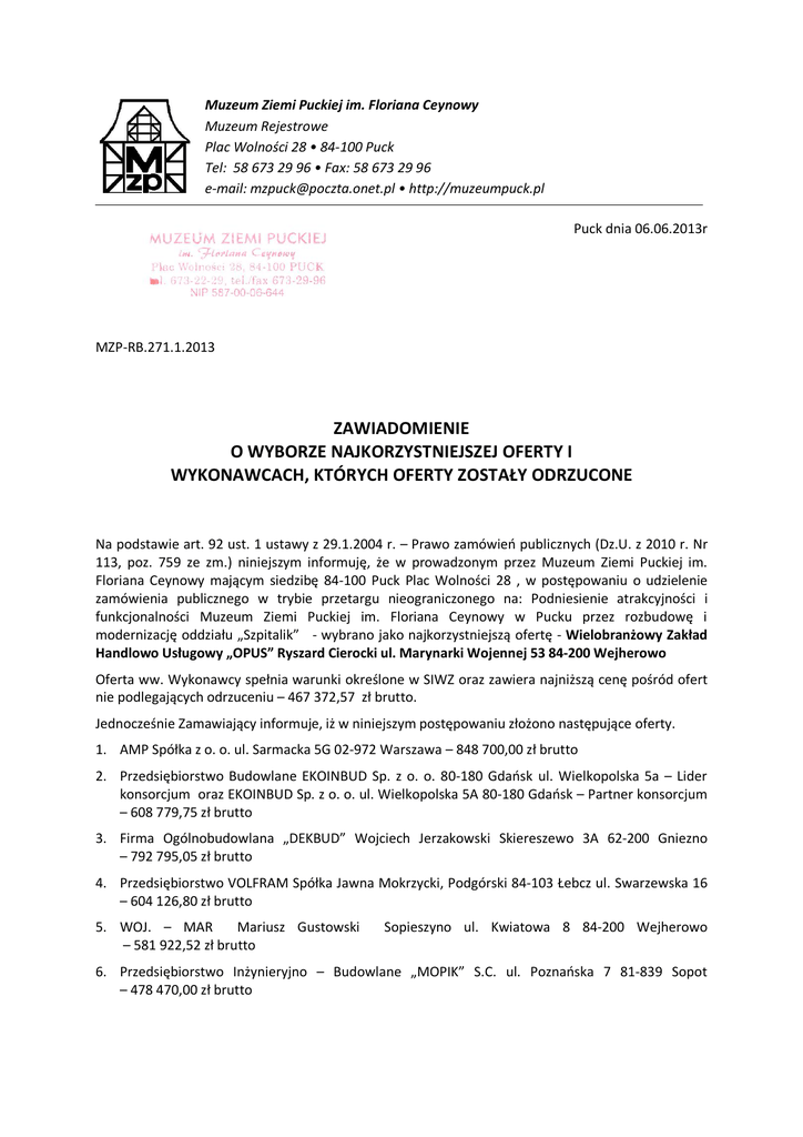 Muzeum Ziemi Puckiej im. Floriana Ceynowy Muzeum Rejestrowe Plac Wolności 28 • 84-100 Puck Tel: 58 673 29 96 • Fax: 58 673 29 96 e-mail: [email protected] • http://muzeumpuck.pl Puck dnia 06.06.2013r MZP-RB.271.1.2013 ZAWIADOMIENIE O WYBORZE NAJKORZYSTNIEJSZEJ OFERTY I WYKONAWCACH, KTÓRYCH OFERTY ZOSTAŁY ODRZUCONE Na podstawie art. 92 ust. 1 ustawy z 29.1.2004 r. – Prawo zamówień publicznych (Dz.U. z 2010 r. Nr 113, poz. 759 ze zm.) niniejszym informuję, że w prowadzonym przez Muzeum Ziemi Puckiej im. Floriana Ceynowy mającym siedzibę 84-100 Puck Plac Wolności 28 , w postępowaniu o udzielenie zamówienia publicznego w trybie przetargu nieograniczonego na: Podniesienie atrakcyjności i funkcjonalności Muzeum Ziemi Puckiej im. Floriana Ceynowy w Pucku przez rozbudowę i modernizację oddziału „Szpitalik” - wybrano jako najkorzystniejszą ofertę - Wielobranżowy Zakład Handlowo Usługowy „OPUS” Ryszard Cierocki ul. Marynarki Wojennej 53 84-200 Wejherowo Oferta ww. Wykonawcy spełnia warunki określone w SIWZ oraz zawiera najniższą cenę pośród ofert nie podlegających odrzuceniu – 467 372,57 zł brutto. Jednocześnie Zamawiający informuje, iż w niniejszym postępowaniu złożono następujące oferty. 1. AMP Spółka z o. o. ul. Sarmacka 5G 02-972 Warszawa – 848 700,00 zł brutto 2. Przedsiębiorstwo Budowlane EKOINBUD Sp. z o. o. 80-180 Gdańsk ul. Wielkopolska 5a – Lider konsorcjum oraz EKOINBUD Sp. z o. o. ul. Wielkopolska 5A 80-180 Gdańsk – Partner konsorcjum – 608 779,75 zł brutto 3. Firma Ogólnobudowlana „DEKBUD” Wojciech Jerzakowski Skiereszewo 3A 62-200 Gniezno – 792 795,05 zł brutto 4. Przedsiębiorstwo VOLFRAM Spółka Jawna Mokrzycki, Podgórski 84-103 Łebcz ul. Swarzewska 16 – 604 126,80 zł brutto 5. WOJ. – MAR Mariusz Gustowski – 581 922,52 zł brutto Sopieszyno ul. Kwiatowa 8 84-200 Wejherowo 6. Przedsiębiorstwo Inżynieryjno – Budowlane „MOPIK” S.C. ul. Poznańska 7 81-839 Sopot – 478 470,00 zł brutto 7. Wielobranżowy Zakład Handlowo Usługowy „OPUS” Ryszard Cierocki ul. Marynarki Wojennej 53 84-200 Wejherowo – 467 372,57 zł brutto 8. Przedsiębiorstwo Usługowe Adam Okoń Goszczyno ul. Kolejowa 8 84-110 Krokowa – 518 445,00 zł brutto Ponadto Zamawiający zawiadamia, że na podstawie art. 24 ust. 2 pkt. 2 i 4 ustawy – Prawo zamówień publicznych zostały wykluczone oferty następujących Wykonawców: nie dotyczy. ................................................................ (podpis Kierownika Zamawiającego lub osoby przez niego upoważnionej) Otrzymują: 1. AMP Spółka z o. o. ul. Sarmacka 5G 02-972 Warszawa 2. Przedsiębiorstwo Budowlane EKOINBUD Sp. z o. o. 80-180 Gdańsk ul. Wielkopolska 5a – Lider konsorcjum oraz EKOINBUD Sp. z o. o. ul. Wielkopolska 5A 80-180 Gdańsk – Partner konsorcjum 3. Firma Ogólnobudowlana „DEKBUD” Wojciech Jerzakowski Skiereszewo 3A 62-200 Gniezno 4. Przedsiębiorstwo VOLFRAM Spółka Jawna Mokrzycki, Podgórski 84-103 Łebcz ul. Swarzewska 16 5. WOJ. – MAR Mariusz Gustowski Sopieszyno ul. Kwiatowa 8 84-200 Wejherowo 6. Przedsiębiorstwo Inżynieryjno – Budowlane „MOPIK” S.C. ul. Poznańska 7 81-839 Sopot 7. Wielobranżowy Zakład Handlowo Usługowy „OPUS” Ryszard Cierocki ul. Marynarki Wojennej 53 84-200 Wejherowo 8. Przedsiębiorstwo Usługowe Adam Okoń Goszczyno ul. Kolejowa 8 84-110 Krokowa