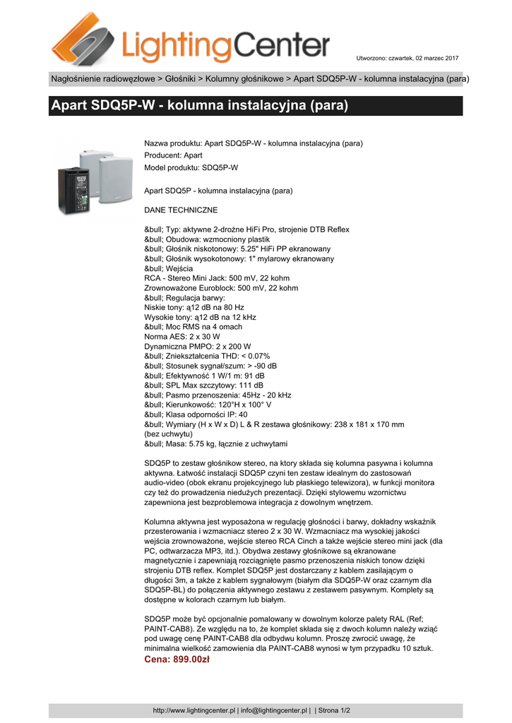 Utworzono: czwartek, 02 marzec 2017 Nagłośnienie radiowęzłowe > Głośniki > Kolumny głośnikowe > Apart SDQ5P-W - kolumna instalacyjna (para) Apart SDQ5P-W - kolumna instalacyjna (para) Nazwa produktu: Apart SDQ5P-W - kolumna instalacyjna (para) Producent: Apart Model produktu: SDQ5P-W Apart SDQ5P - kolumna instalacyjna (para) DANE TECHNICZNE • Typ: aktywne 2-drożne HiFi Pro, strojenie DTB Reflex • Obudowa: wzmocniony plastik • Głośnik niskotonowy: 5.25" HiFi PP ekranowany • Głośnik wysokotonowy: 1" mylarowy ekranowany • Wejścia RCA - Stereo Mini Jack: 500 mV, 22 kohm Zrownoważone Euroblock: 500 mV, 22 kohm • Regulacja barwy: Niskie tony: ą12 dB na 80 Hz Wysokie tony: ą12 dB na 12 kHz • Moc RMS na 4 omach Norma AES: 2 x 30 W Dynamiczna PMPO: 2 x 200 W • Zniekształcenia THD: < 0.07% • Stosunek sygnał/szum: > -90 dB • Efektywność 1 W/1 m: 91 dB • SPL Max szczytowy: 111 dB • Pasmo przenoszenia: 45Hz - 20 kHz • Kierunkowość: 120°H x 100° V • Klasa odporności IP: 40 • Wymiary (H x W x D) L & R zestawa głośnikowy: 238 x 181 x 170 mm (bez uchwytu) • Masa: 5.75 kg, łącznie z uchwytami SDQ5P to zestaw głośnikow stereo, na ktory składa się kolumna pasywna i kolumna aktywna. Łatwość instalacji SDQ5P czyni ten zestaw idealnym do zastosowań audio-video (obok ekranu projekcyjnego lub płaskiego telewizora), w funkcji monitora czy też do prowadzenia niedużych prezentacji. Dzięki stylowemu wzornictwu zapewniona jest bezproblemowa integracja z dowolnym wnętrzem. Kolumna aktywna jest wyposażona w regulację głośności i barwy, dokładny wskaźnik przesterowania i wzmacniacz stereo 2 x 30 W. Wzmacniacz ma wysokiej jakości wejścia zrownoważone, wejście stereo RCA Cinch a także wejście stereo mini jack (dla PC, odtwarzacza MP3, itd.). Obydwa zestawy głośnikowe są ekranowane magnetycznie i zapewniają rozciągnięte pasmo przenoszenia niskich tonow dzięki strojeniu DTB reflex. Komplet SDQ5P jest dostarczany z kablem zasilającym o długości 3m, a także z kablem sygnałowym (białym dla SDQ5P-W oraz czarnym dla SDQ5P-BL) do połączenia aktywnego zestawu z zestawem pasywnym. Komplety są dostępne w kolorach czarnym lub białym. SDQ5P może być opcjonalnie pomalowany w dowolnym kolorze palety RAL (Ref; PAINT-CAB8). Ze względu na to, że komplet składa się z dwoch kolumn należy wziąć pod uwagę cenę PAINT-CAB8 dla odbydwu kolumn. Proszę zwrocić uwagę, że minimalna wielkość zamowienia dla PAINT-CAB8 wynosi w tym przypadku 10 sztuk. Cena: 899.00zł http://www.lightingcenter.pl | [email protected] | | Strona 1/2 Utworzono: czwartek, 02 marzec 2017 Nagłośnienie radiowęzłowe > Głośniki > Kolumny głośnikowe > Apart SDQ5P-W - kolumna instalacyjna (para) Apart SDQ5P-W - kolumna instalacyjna (para) http://www.lightingcenter.pl | [email protected] | | Strona 2/2