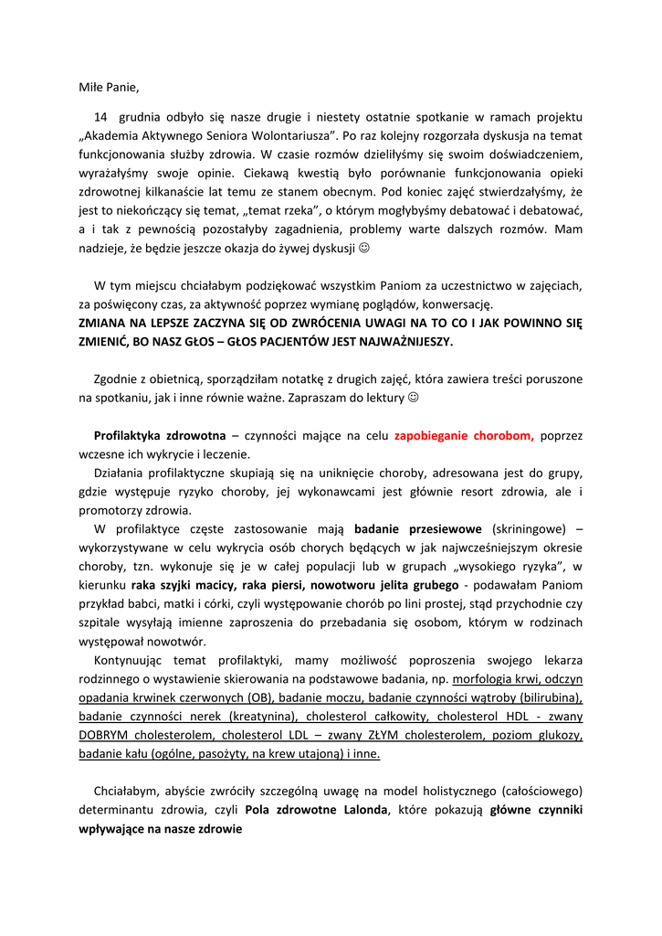 Miłe Panie, 14 grudnia odbyło się nasze drugie i niestety ostatnie spotkanie w ramach projektu „Akademia Aktywnego Seniora Wolontariusza”. Po raz kolejny rozgorzała dyskusja na temat funkcjonowania służby zdrowia. W czasie rozmów dzieliłyśmy się swoim doświadczeniem, wyrażałyśmy swoje opinie. Ciekawą kwestią było porównanie funkcjonowania opieki zdrowotnej kilkanaście lat temu ze stanem obecnym. Pod koniec zajęć stwierdzałyśmy, że jest to niekończący się temat, „temat rzeka”, o którym mogłybyśmy debatować i debatować, a i tak z pewnością pozostałyby zagadnienia, problemy warte dalszych rozmów. Mam nadzieje, że będzie jeszcze okazja do żywej dyskusji W tym miejscu chciałabym podziękować wszystkim Paniom za uczestnictwo w zajęciach, za poświęcony czas, za aktywność poprzez wymianę poglądów, konwersację. ZMIANA NA LEPSZE ZACZYNA SIĘ OD ZWRÓCENIA UWAGI NA TO CO I JAK POWINNO SIĘ ZMIENIĆ, BO NASZ GŁOS – GŁOS PACJENTÓW JEST NAJWAŻNIJESZY. Zgodnie z obietnicą, sporządziłam notatkę z drugich zajęć, która zawiera treści poruszone na spotkaniu, jak i inne równie ważne. Zapraszam do lektury Profilaktyka zdrowotna – czynności mające na celu zapobieganie chorobom, poprzez wczesne ich wykrycie i leczenie. Działania profilaktyczne skupiają się na uniknięcie choroby, adresowana jest do grupy, gdzie występuje ryzyko choroby, jej wykonawcami jest głównie resort zdrowia, ale i promotorzy zdrowia. W profilaktyce częste zastosowanie mają badanie przesiewowe (skriningowe) – wykorzystywane w celu wykrycia osób chorych będących w jak najwcześniejszym okresie choroby, tzn. wykonuje się je w całej populacji lub w grupach „wysokiego ryzyka”, w kierunku raka szyjki macicy, raka piersi, nowotworu jelita grubego - podawałam Paniom przykład babci, matki i córki, czyli występowanie chorób po lini prostej, stąd przychodnie czy szpitale wysyłają imienne zaproszenia do przebadania się osobom, którym w rodzinach występował nowotwór. Kontynuując temat profilaktyki, mamy możliwość poproszenia swojego lekarza rodzinnego o wystawienie skierowania na podstawowe badania, np. morfologia krwi, odczyn opadania krwinek czerwonych (OB), badanie moczu, badanie czynności wątroby (bilirubina), badanie czynności nerek (kreatynina), cholesterol całkowity, cholesterol HDL - zwany DOBRYM cholesterolem, cholesterol LDL – zwany ZŁYM cholesterolem, poziom glukozy, badanie kału (ogólne, pasożyty, na krew utajoną) i inne. Chciałabym, abyście zwróciły szczególną uwagę na model holistycznego (całościowego) determinantu zdrowia, czyli Pola zdrowotne Lalonda, które pokazują główne czynniki wpływające na nasze zdrowie Styl życia – aktywność fizyczna, sposób odżywiania się, ilość stresowych sytuacji i umiejętność radzenia sobie z nimi, picie alkoholu, palenie papierosów, zażywanie narkotyków, zachowania seksualne i inne Środowisko fizyczne – jakość powietrza, wody, natężenie hałasu, promieniowanie jonizujące, bezpieczeństwo miejsc w których przebywamy – dom, zakład pracy, miejsce wypoczynku, szkoła i inne Czynniki genetyczne – predyspozycje genetyczne do walki z chorobami, przeciwstawienie się im Opieka medyczna – struktura, organizacja, działanie, dostępność, otwartość na potrzeby pacjentów placówek medycznych Programy profilaktyczne realizowane są przez: - Ministerstwo Zdrowia - Narodowy Fundusz Zdrowia - Samorządy - Organizacje Pozarządowe - Firmy farmaceutyczne a także: szpitale, przychodnie, szkoły, przedszkola i inne. Jedna z dyskusji dotyczyła tego, co miasto oferuje nam w kwestii profilaktyki, mianowicie: a) Dolnośląskie Centrum Onkologii – „Program wczesnego wykrywania raka piersi” oraz „Program wczesnego wykrywania raka szyjki macicy” Nas stronie internetowej: www.wok.wroclaw.pl znajdziecie warunki korzystania z programów b) Oddział Narodowego Funduszu Zdrowia we Wrocławiu – „Program profilaktyki raka piersi; raka szyjki macicy; układu krążenia; gruźlicy; chorób odtytoniowych, w tym POCHP oraz badań prenatalnych www.nfz-wroclaw.pl/default.aspx?obj=22796;28785&par=22797&des=1;2 c) Wydział Zdrowia i Spraw Społecznych Urząd Miejski Wrocławia – „Wrocławski program profilaktyki zakażeń wirusem brodawczaka ludzkiego (HPV)” http://hpv.wroclaw.pl/wps/portal/profilaktyka „Program promocji zdrowia psychicznego oraz wsparcia dla osób z problemami zdrowia psychicznego i osób z doświadczeniem choroby psychicznej” www.bip.um.wroc.pl/wps/wcm/connect/0daec280474c08698414be08a17fd186/Pro gram+promocji+zdrowia+psychicznego+oraz+wsparcia+dla+os%E2%80%A6.pdf?MOD =AJPERES d) Rada Miejska Miasta Wrocławia – „Gminny program profilaktyki i rozwiązywania problemów alkoholowych oraz przeciwdziałania narkomanii dla miasta Wrocławia” http://wrosystem.um.wroc.pl/beta_4/webdisk/151574/0531ru06z.pdf e) Centrum Neuropsychiatrii NEUROMED – „Program profilaktyki i terapii uzależnień” www.miastowformie.pl/bezplatne-badania/program-profilaktyki-i-terapii-uzaleznien-,6.html f) Kar – Med. Karłowickie Centrum Medyczne – „Program edukacyjno – diagnostyczny wczesnego wykrywania raka skóry i czerniaka” www.karmed.pl/index.phpid_klienta=238017&id_zakladki=15288&l=1&id_grupy=12998.htm Obecnie na świecie żyje około 600 mln osób po 60 roku życia. Liczba ta wzrośnie do 1 mld w 2020r. Co trzeci Europejczyk będzie miał powyżej 60 lat w 2030r. Krajami, gdzie żyje najwięcej osób starszych są: Szwecja, Grecja i Niemcy. W Polsce żyje ponad 8 mln osób po 60 roku życia. Jakość życia – satysfakcja z życia, poziom (standard) życia, dobre samopoczucie, odczuwanie szczęścia, optimum, osiągnięcie cenionych wartości, itd. Jakość życia – odnosi się do całości życia biorąc pod uwagę: a) wymiar fizyczny (zdolność samodzielnego poruszania się, samoobsługa) b) wymiar psychiczny (jakie emocje – 