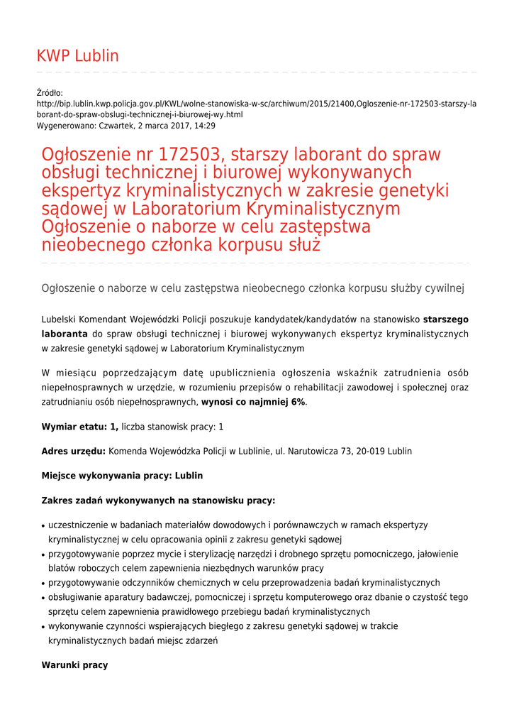 KWP Lublin Źródło: http://bip.lublin.kwp.policja.gov.pl/KWL/wolne-stanowiska-w-sc/archiwum/2015/21400,Ogloszenie-nr-172503-starszy-la borant-do-spraw-obslugi-technicznej-i-biurowej-wy.html Wygenerowano: Czwartek, 2 marca 2017, 14:29 Ogłoszenie nr 172503, starszy laborant do spraw obsługi technicznej i biurowej wykonywanych ekspertyz kryminalistycznych w zakresie genetyki sądowej w Laboratorium Kryminalistycznym Ogłoszenie o naborze w celu zastępstwa nieobecnego członka korpusu służ Ogłoszenie o naborze w celu zastępstwa nieobecnego członka korpusu służby cywilnej Lubelski Komendant Wojewódzki Policji poszukuje kandydatek/kandydatów na stanowisko starszego laboranta do spraw obsługi technicznej i biurowej wykonywanych ekspertyz kryminalistycznych w zakresie genetyki sądowej w Laboratorium Kryminalistycznym W miesiącu poprzedzającym datę upublicznienia ogłoszenia wskaźnik zatrudnienia osób niepełnosprawnych w urzędzie, w rozumieniu przepisów o rehabilitacji zawodowej i społecznej oraz zatrudnianiu osób niepełnosprawnych, wynosi co najmniej 6%. Wymiar etatu: 1, liczba stanowisk pracy: 1 Adres urzędu: Komenda Wojewódzka Policji w Lublinie, ul. Narutowicza 73, 20‑019 Lublin Miejsce wykonywania pracy: Lublin Zakres zadań wykonywanych na stanowisku pracy: ● uczestniczenie w badaniach materiałów dowodowych i porównawczych w ramach ekspertyzy kryminalistycznej w celu opracowania opinii z zakresu genetyki sądowej ● przygotowywanie poprzez mycie i sterylizację narzędzi i drobnego sprzętu pomocniczego, jałowienie blatów roboczych celem zapewnienia niezbędnych warunków pracy ● przygotowywanie odczynników chemicznych w celu przeprowadzenia badań kryminalistycznych ● obsługiwanie aparatury badawczej, pomocniczej i sprzętu komputerowego oraz dbanie o czystość tego sprzętu celem zapewnienia prawidłowego przebiegu badań kryminalistycznych ● wykonywanie czynności wspierających biegłego z zakresu genetyki sądowej w trakcie kryminalistycznych badań miejsc zdarzeń Warunki pracy Warunki dotyczące charakteru pracy na stanowisku i sposobu wykonywania zadań Praca jest wykonywana w pomieszczeniu Laboratorium lub w trakcie kryminalistycznego badania miejsca zdarzenia. Powierzane zadania mają charakter jednolity, wymagają przestrzegania opracowanych procedur postępowania, na stanowisku nie występują złożone problemy – nie jest wymagana szczególna kreatywność. Na stanowisku wymagana jest dyspozycyjność związana z uczestniczeniem w oględzinach różnorodnych miejsc zdarzeń ‑ praca w terenie. Na stanowisku nie jest wymagana szczególna samodzielność, proste czynności są realizowane samodzielnie. Miejsce i otoczenie organizacyjno-techniczne stanowiska pracy Stanowisko pracy jest zlokalizowane w obiekcie Laboratorium Kryminalistycznego KWP w Lublinie, przy ul. Narutowicza 73 na 4 piętrze. W budynku występują przeszkody architektoniczne w postaci schodów – brak windy i podjazdu. Laboratorium jest zlokalizowane na 3 i 4 piętrze, kondygnacje połączone są klatką schodową. Praca wymaga przemieszczania się po obu piętrach. Zadania realizowane na stanowisku wymagają posługiwania się odczynnikami chemicznymi, w tym również ujętymi w wykazie substancji niebezpiecznych oraz rakotwórczych i mutagennych. W trakcie pracy istnieje możliwość kontaktu z potencjalnie zakaźnym materiałem biologicznym. Praca przy monitorach ekranowych poniżej połowy ustawowego wymiaru czasu pracy. Na stanowisku nie występują uciążliwe warunki pracy. Zadania realizowane na stanowisku wymagają umiejętności obsługi narzędzi informatycznych, urządzeń w postaci pipet automatycznych, cieplarek, sterylizatorów, wirówek, komór laminarnych, a także umiejętności prowadzenia dezynfekcji. Inne Oferowane warunki wynagrodzenia: wynagrodzenie zasadnicze wynikające z mnożnika kwoty bazowej 1,150 (2 154,91 zł. brutto) oraz dodatek z tytułu wysługi (prawo do niego nabywa się po udokumentowaniu pięciu lat pracy i wynosi on 5% wynagrodzenia zasadniczego. Z każdym rokiem wzrasta o 1% do momentu, aż osiągnie wysokość 20%). Wymagania związane ze stanowiskiem pracy niezbędne ● wykształcenie: średnie analityczne, chemiczne, biologiczne lub pokrewne ● umiejętności manualne z zakresu technik laboratoryjnych ● umiejętność obsługi komputera z pakietem biurowym ● znajomość pracy laboratoryjnej w zakresie zachowania jałowości i sterylności ● umiejętność pracy w zespole ● komunikatywność wymagania dodatkowe ● wykształcenie wyższe: biologia, chemia lub pokrewne ● 6 miesięcy doświadczenia zawodowego w laboratorium ● umiejętność stosowania wiedzy z zakresu biologii w szczególności genetyki ● znajomość przepisów i procedur stosowanych w laboratoriach analitycznych ● obsługa sprzętu laboratoryjnego ● dyspozycyjność Wymagane dokumenty i oświadczenia: ● życiorys i list motywacyjny ● oświadczenie o wyrażeniu zgody na przetwarzanie danych osobowych do celów rekrutacji ● oświadczenie o korzystaniu z pełni praw publicznych ● oświadczenie o nieskazaniu prawomocnym wyrokiem za umyślne przestępstwo lub umyślne przestępstwo skarbowe ● kopie dokumentów potwierdzających wykształcenie ● kopia dokumentu potwierdzającego posiadanie polskiego obywatelstwa lub oświadczenie o posiadaniu obywatelstwa polskiego Termin składania dokumentów: 31-08-2015 Miejsce składania dokumentów: Komenda Wojewódzka Policji w Lublinie, ul. Narutowicza 73, 20-019 Lublin, Sekretariat Wydziału Kadr i Szkolenia, pok. 127 Inne informacje: Informacje dodatkowe można uzyskać pod nr tel. 81 535 43 01, 81 535 46 93. Oferty należy składać osobiście od poniedziałku do piątku w godzinach od 7:30 do 15:30 w sekretariacie Wydziału Kadr i Szkolenia KWP w Lublinie (pok. 127) lub przesyłać pocztą na wskazany powyżej adres. Oferty niespełniające wymagań określonych w ogłoszeniu, nieko